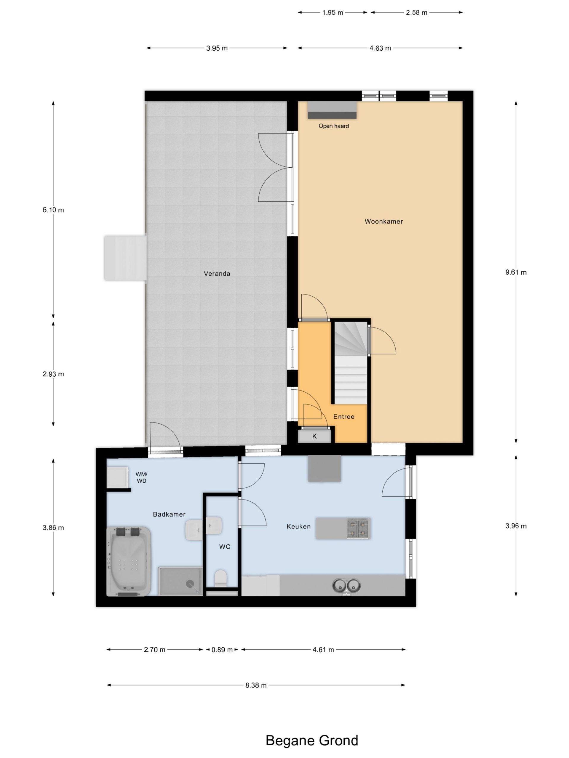 Entree, meterkast, trapopgang, toilet met fontein, dichte keuken met inbouwapparatuur en kookeiland, trapkast, woonkamer met open haard en openslaande deuren naar veranda, badkamer met whirlpool ligbad, douche, wastafel en wasmachineaansluiting.