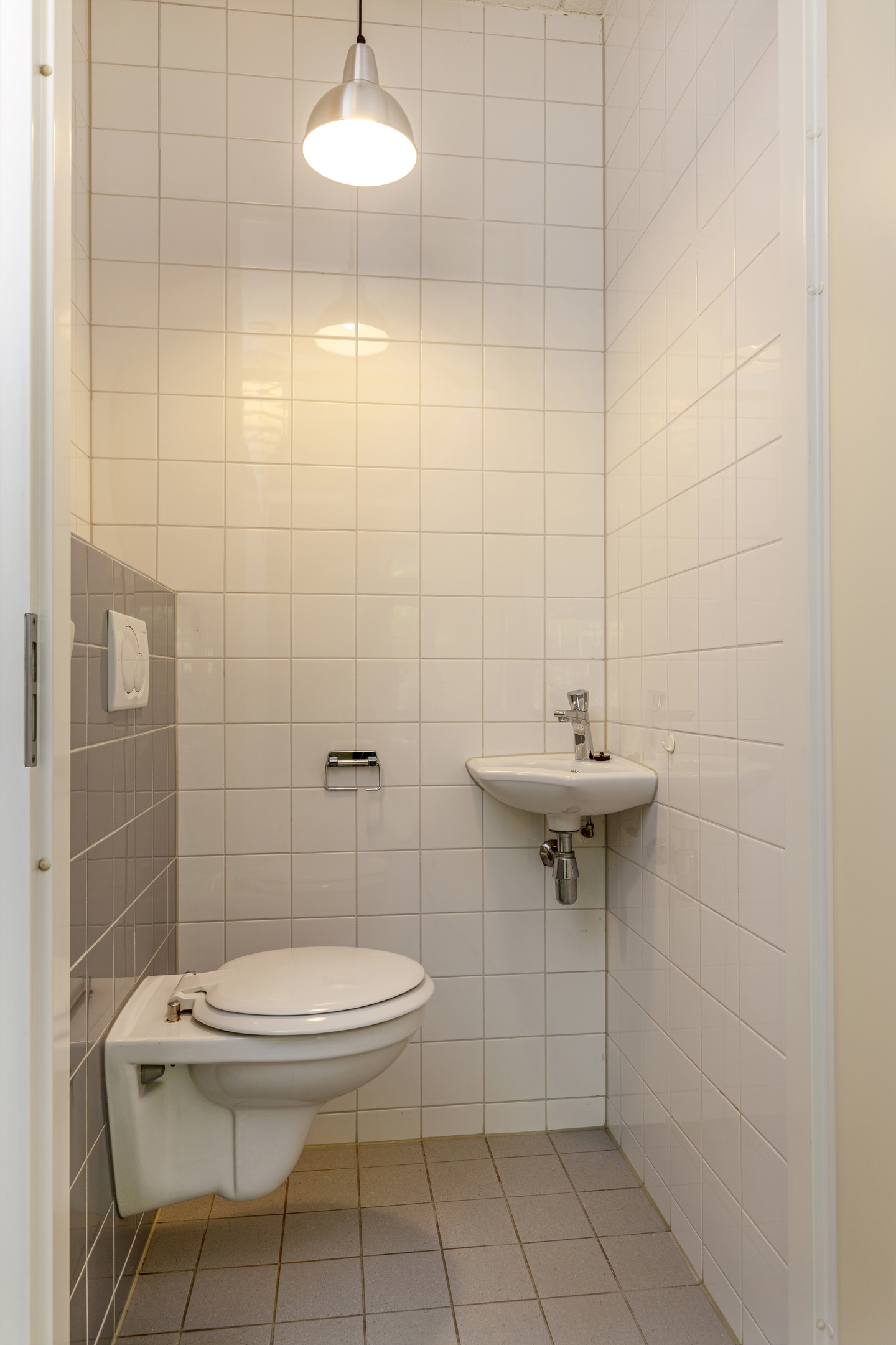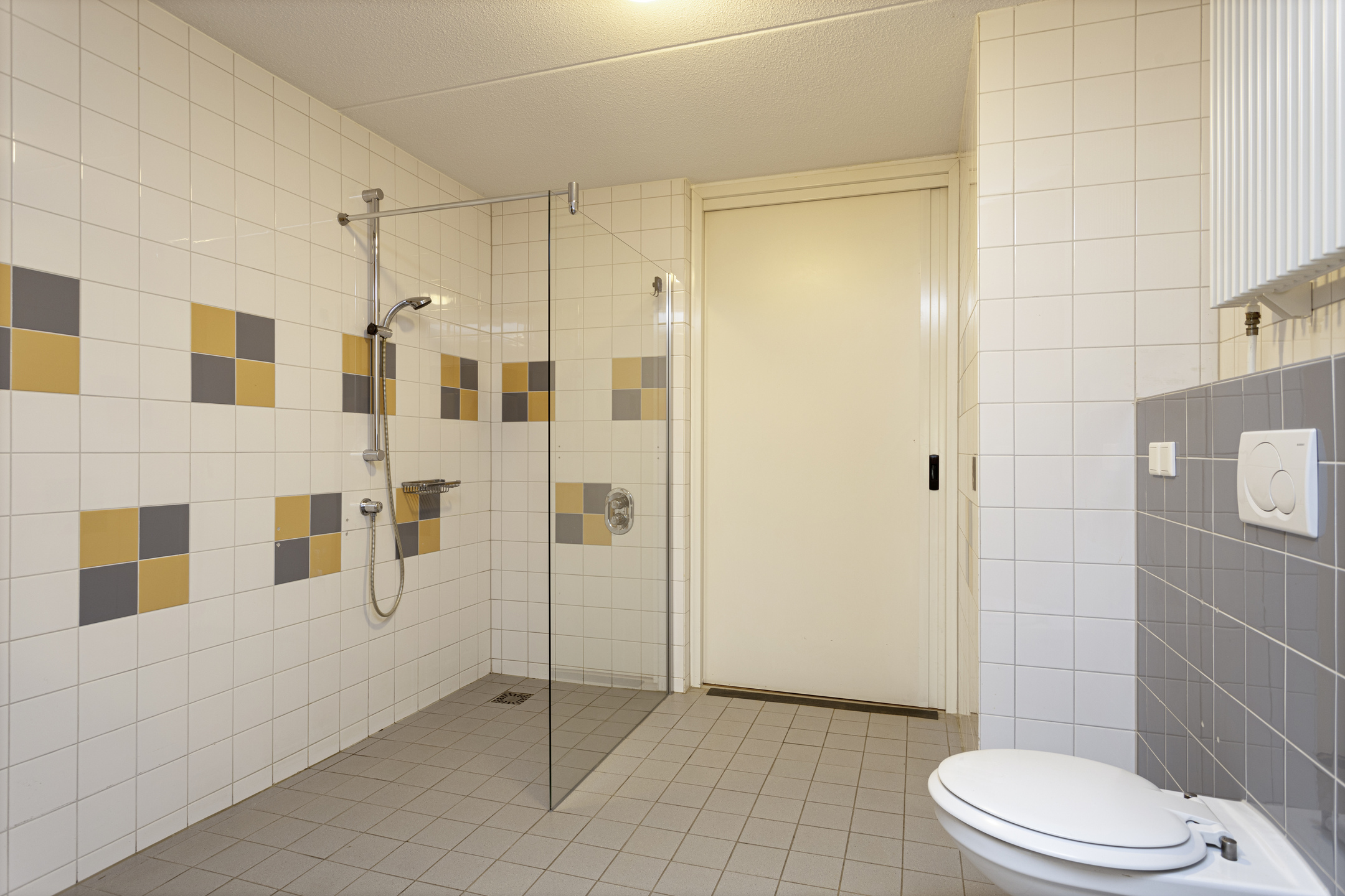 De ruime badkamer is op twee manieren toegankelijk, namelijk vanuit de grote slaapkamer en vanuit de gang. Het tegelwerk is in lichte kleurstelling uitgevoerd met gele en grijze accenten. De badkamer heeft een geheel vlakke vloer en is voorzien van een tweede toilet, douche, verstelbare wastafel en vloerverwarming.
