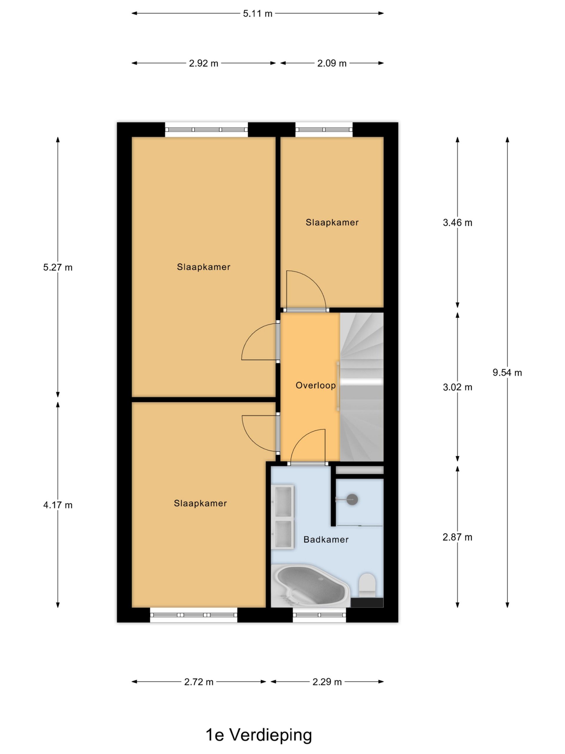 Overloop met toegang tot 3 ruime slaapkamers en de badkamer met ligbad, dubbele wastafel, toilet en inloopdouche.