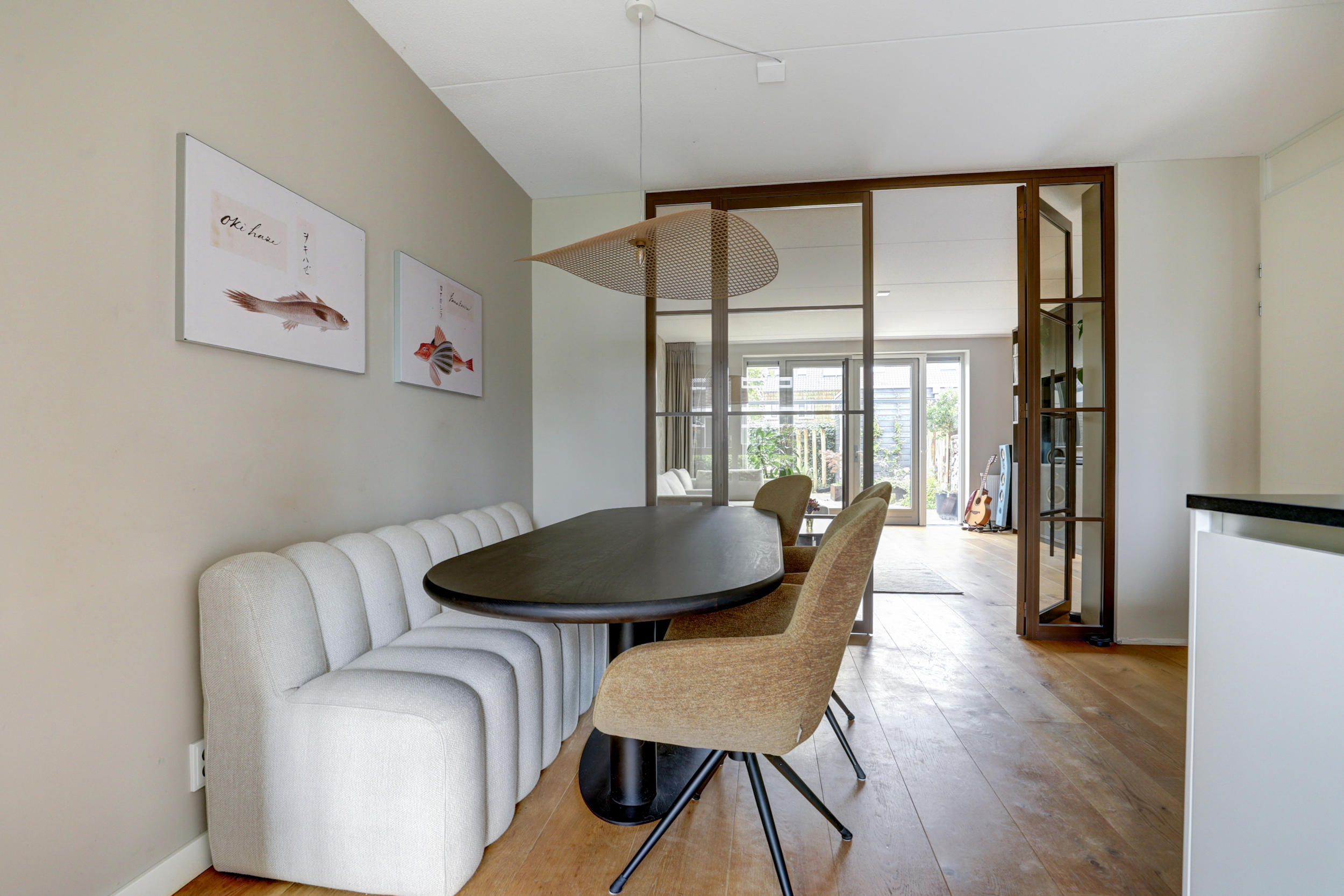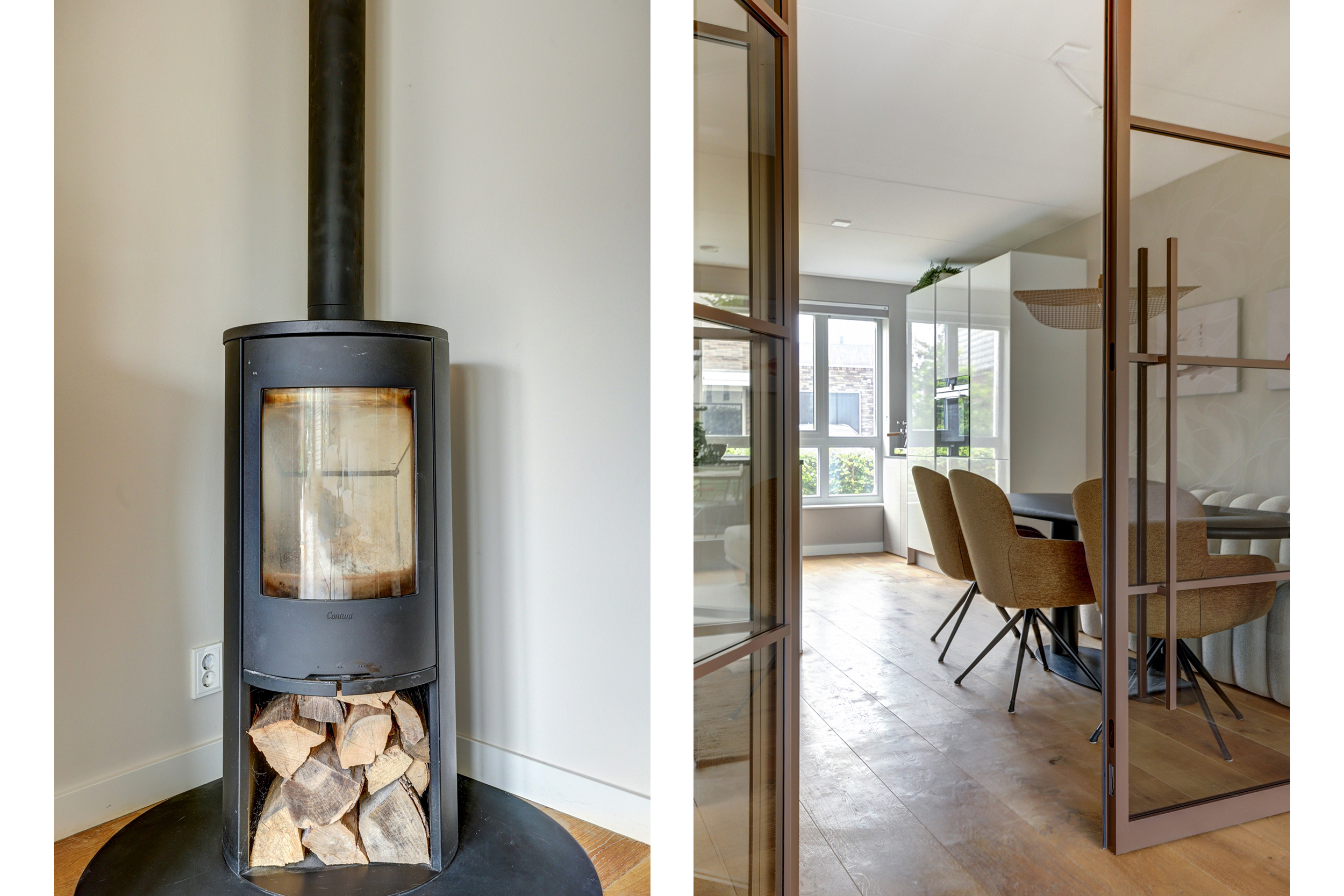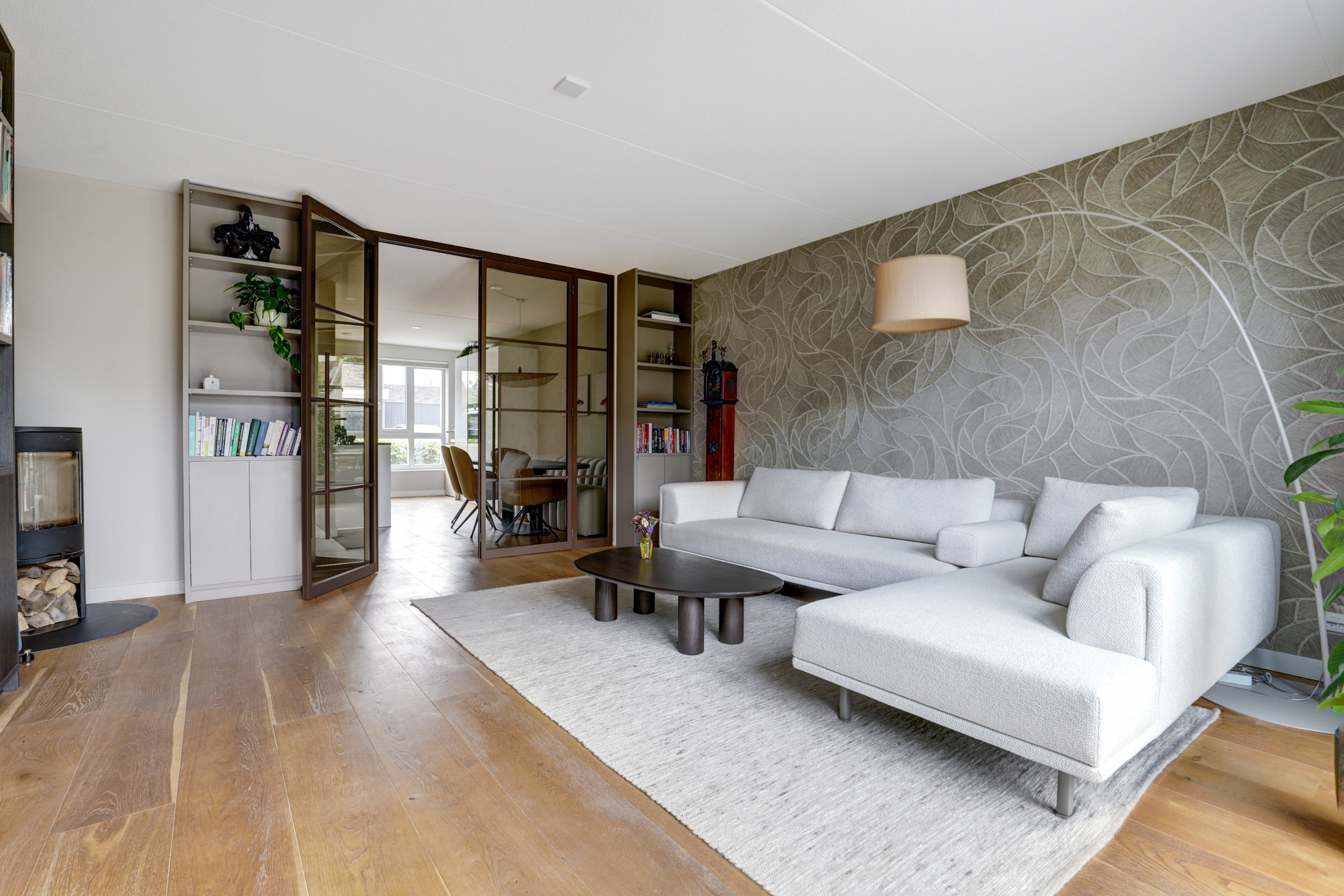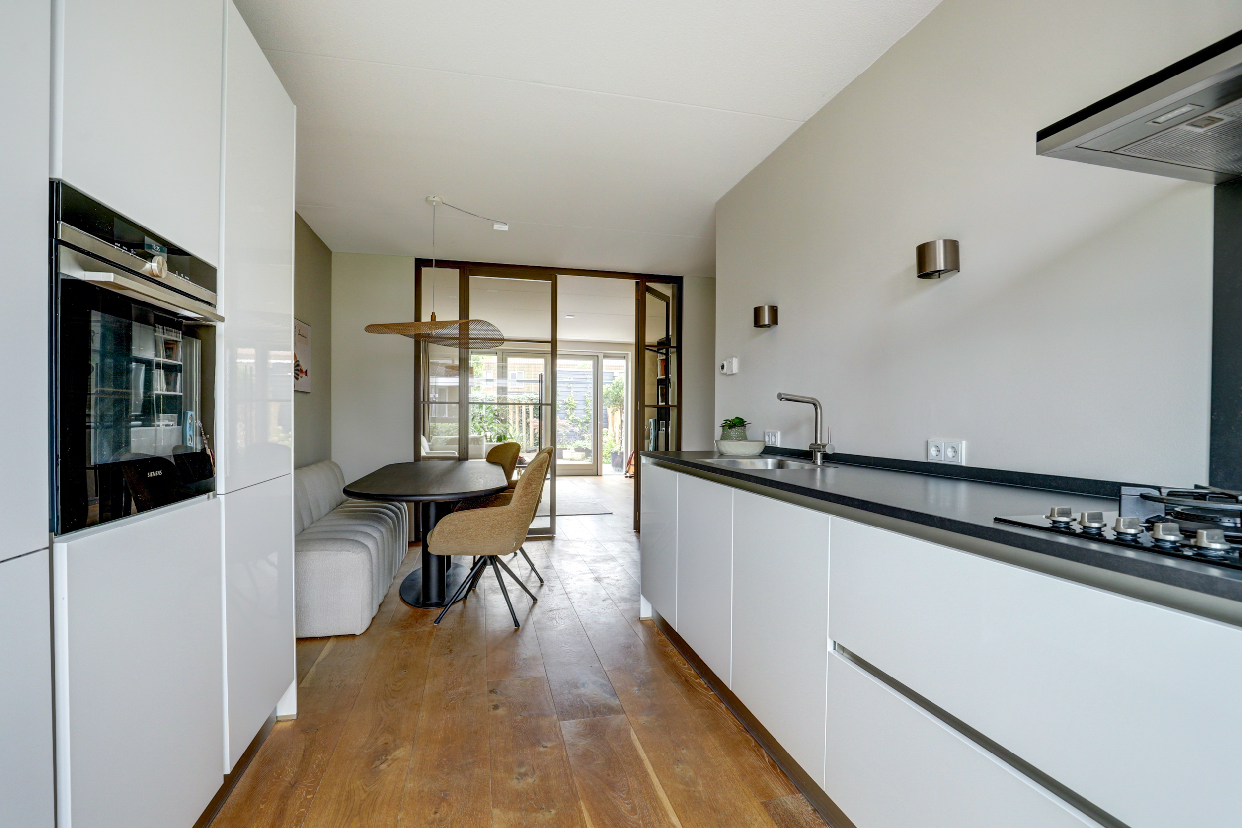 Bij binnenkomst valt meteen de ruimte op. De woonkamer is dankzij de uitbouw verrassend groot en heeft veel lichtinval door de brede raampartijen en de en suite stalen binnendeuren, die de eetkamer met de woonkamer verbinden. De strakke afwerking en rustige kleuren zorgen voor een prettige, moderne uitstraling. De open keuken sluit hier mooi bij aan. Deze is uitgerust met moderne apparatuur en biedt volop werkruimte.