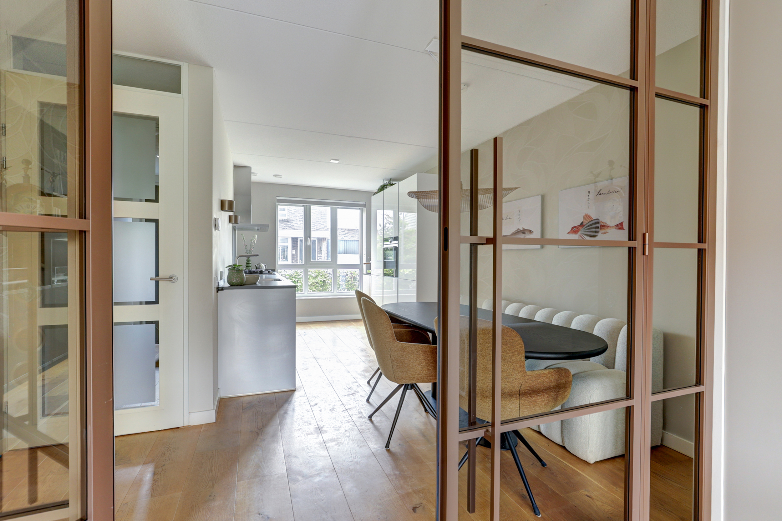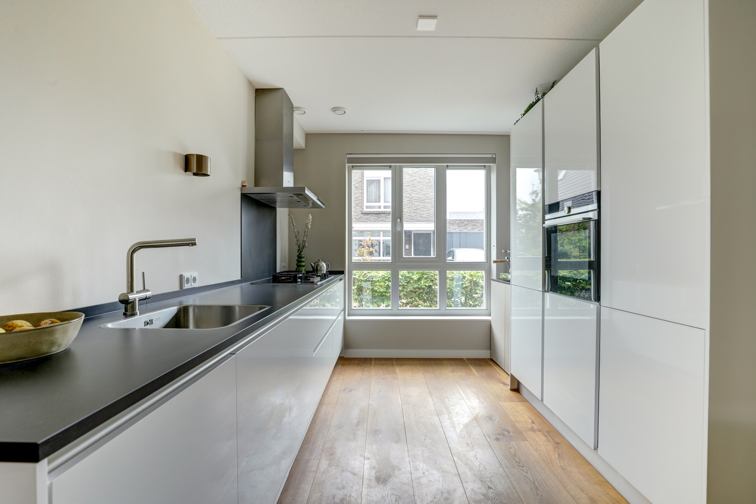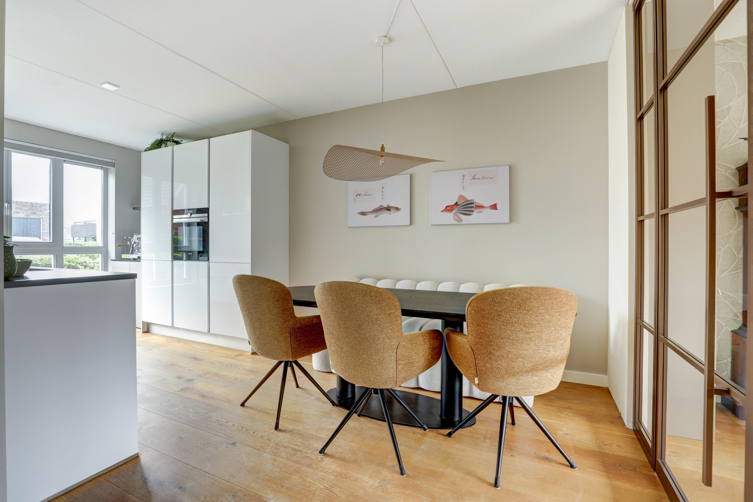 Bij binnenkomst valt meteen de ruimte op. De woonkamer is dankzij de uitbouw verrassend groot en heeft veel lichtinval door de brede raampartijen en de en suite stalen binnendeuren, die de eetkamer met de woonkamer verbinden. De strakke afwerking en rustige kleuren zorgen voor een prettige, moderne uitstraling. De open keuken sluit hier mooi bij aan. Deze is uitgerust met moderne apparatuur en biedt volop werkruimte.