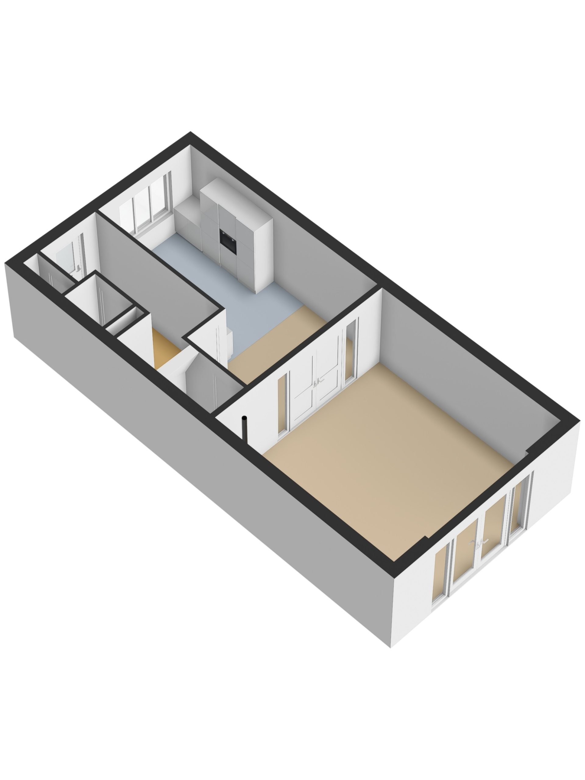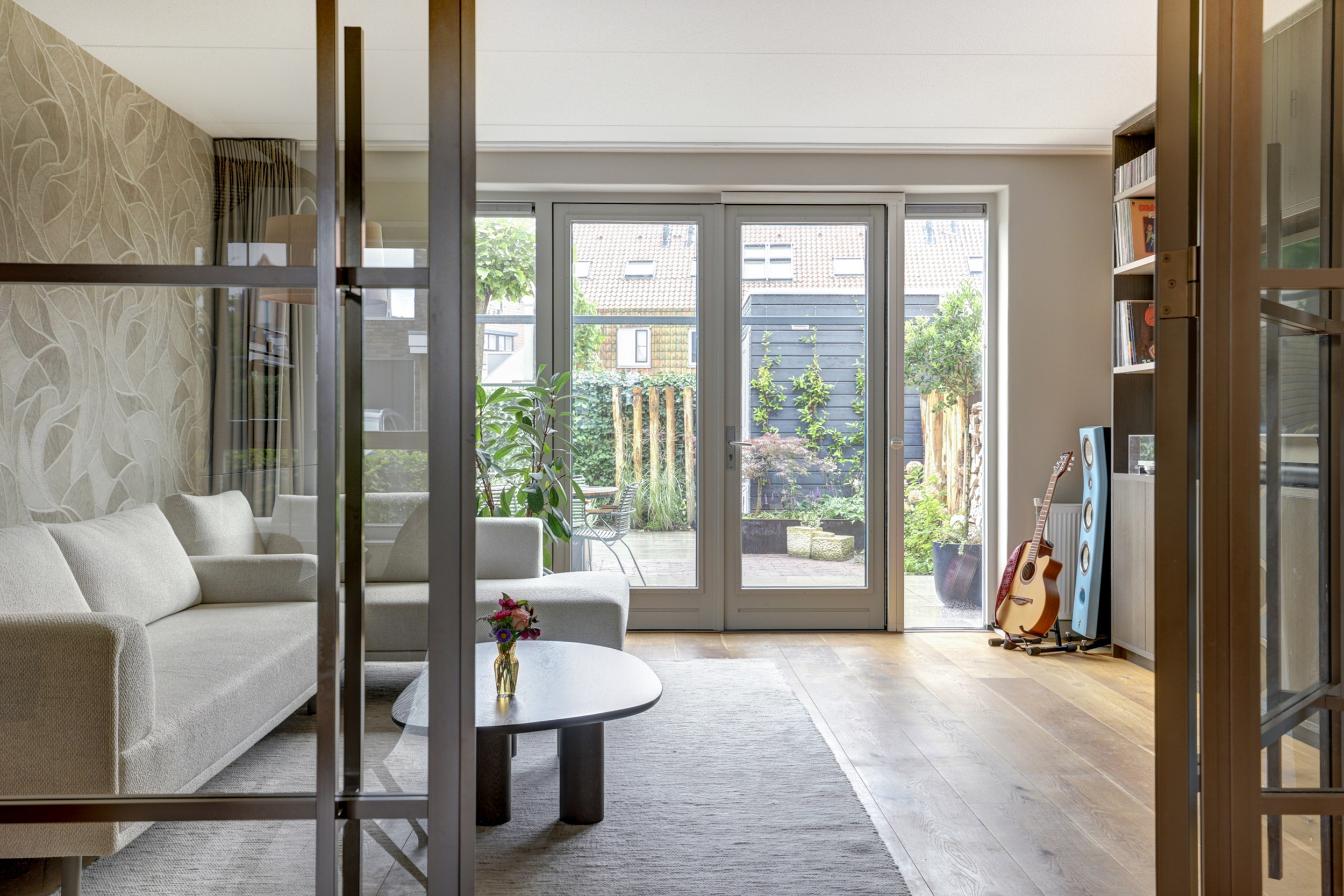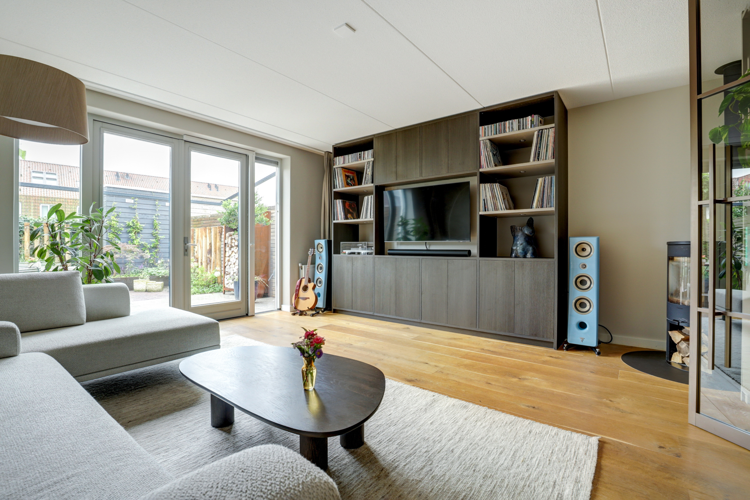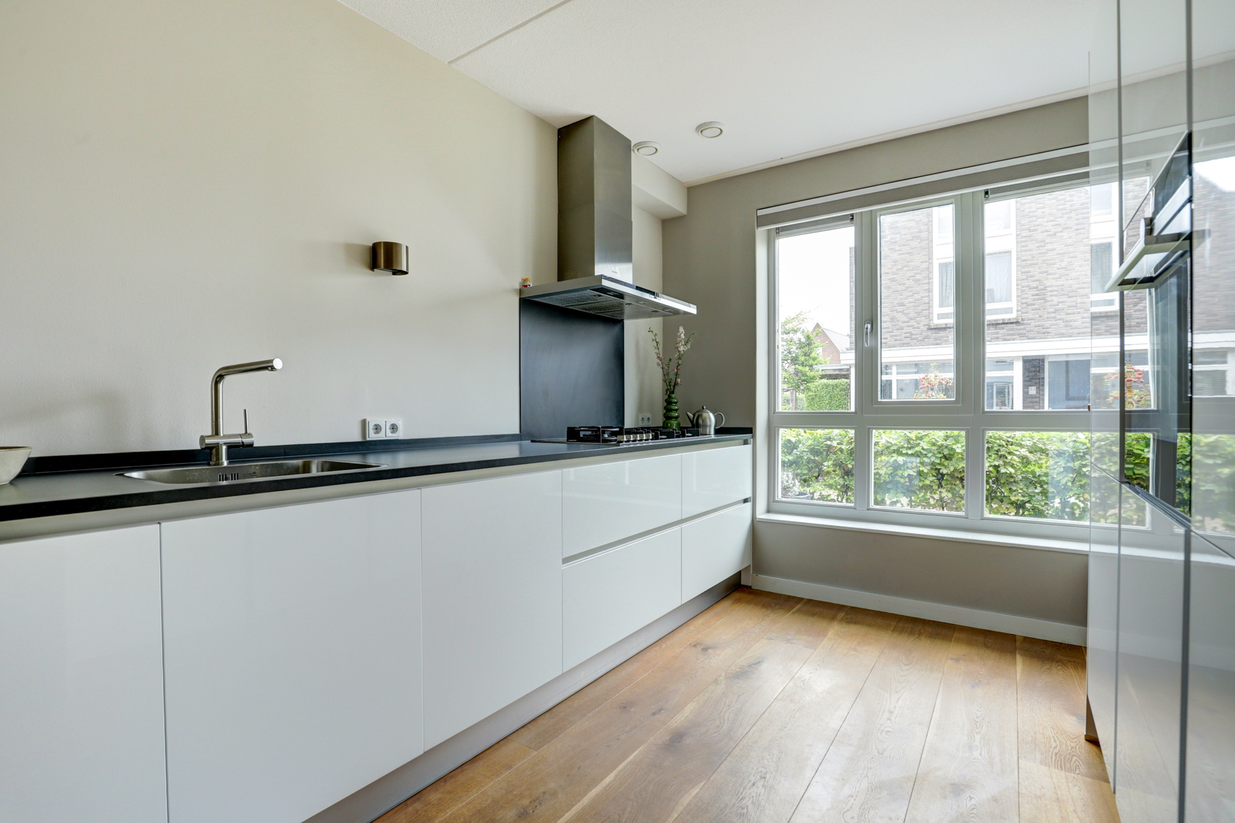 Bij binnenkomst valt meteen de ruimte op. De woonkamer is dankzij de uitbouw verrassend groot en heeft veel lichtinval door de brede raampartijen en de en suite stalen binnendeuren, die de eetkamer met de woonkamer verbinden. De strakke afwerking en rustige kleuren zorgen voor een prettige, moderne uitstraling. De open keuken sluit hier mooi bij aan. Deze is uitgerust met moderne apparatuur en biedt volop werkruimte.