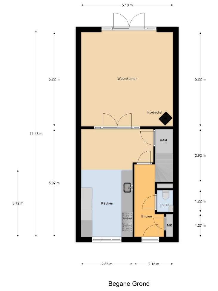 Entree, hal, meterkast, toilet, trapopgang naar de eerste verdieping. Open keuken met fornuis, afzuigkap, oven, koel-vriescombinatie en vaatwasser, en-suite stalen binnendeuren naar de woonkamer met houtkachel en openslaande deuren naar de tuin op het zuidoosten.