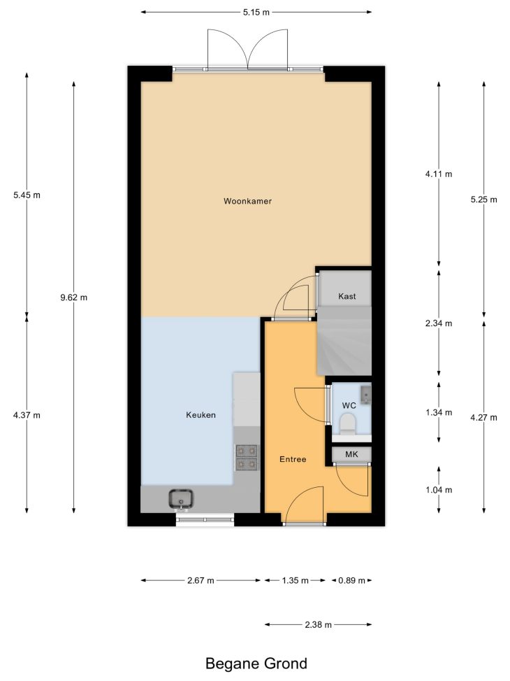 Entree, hal, meterkast, toilet, trapopgang naar de eerste verdieping. Open keuken met inductie kookplaat, afzuigkap, oven, koel-vriescombinatie en vaatwasser, tuingerichte woonkamer met openslaande deuren naar de achtertuin.