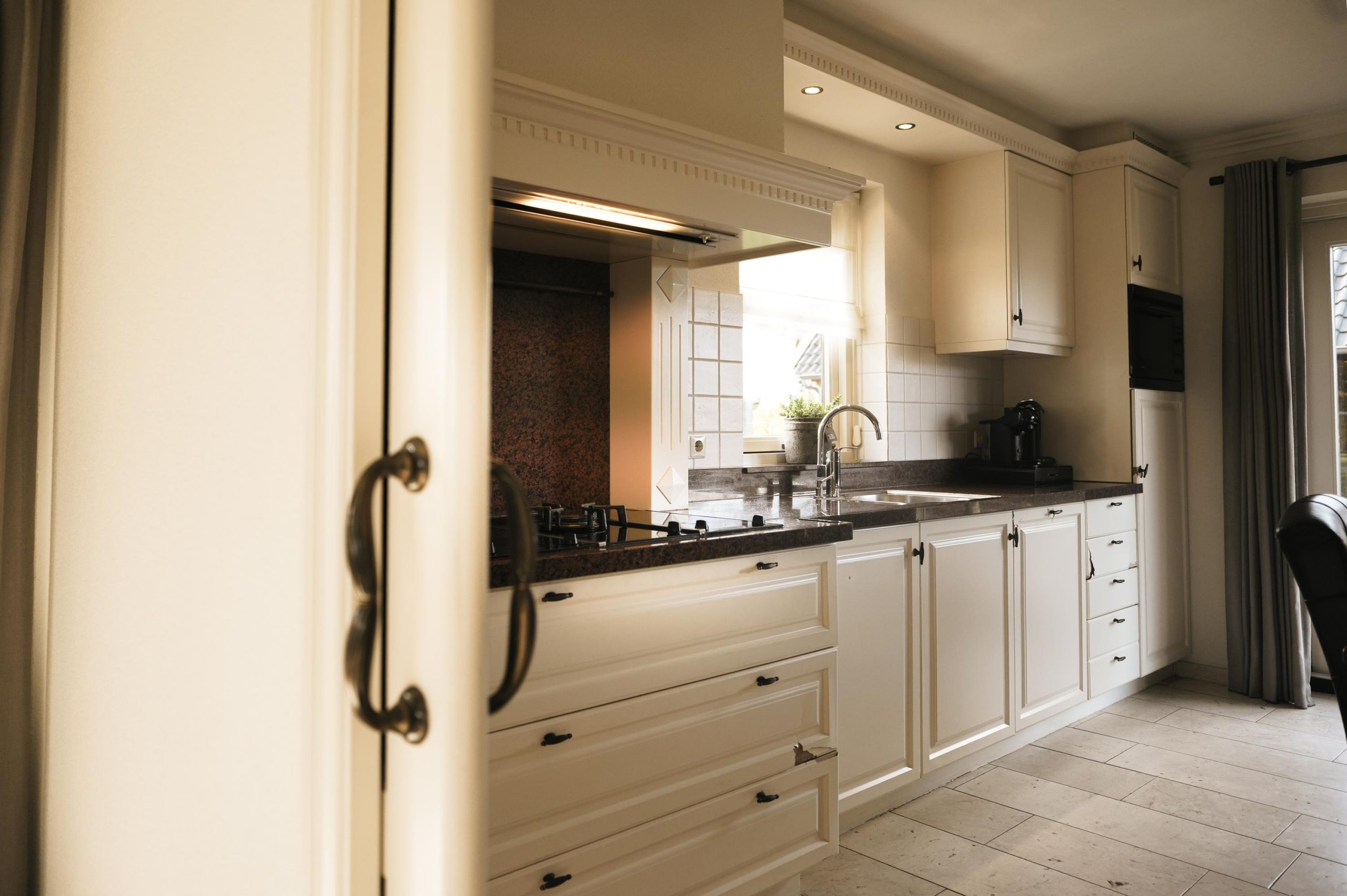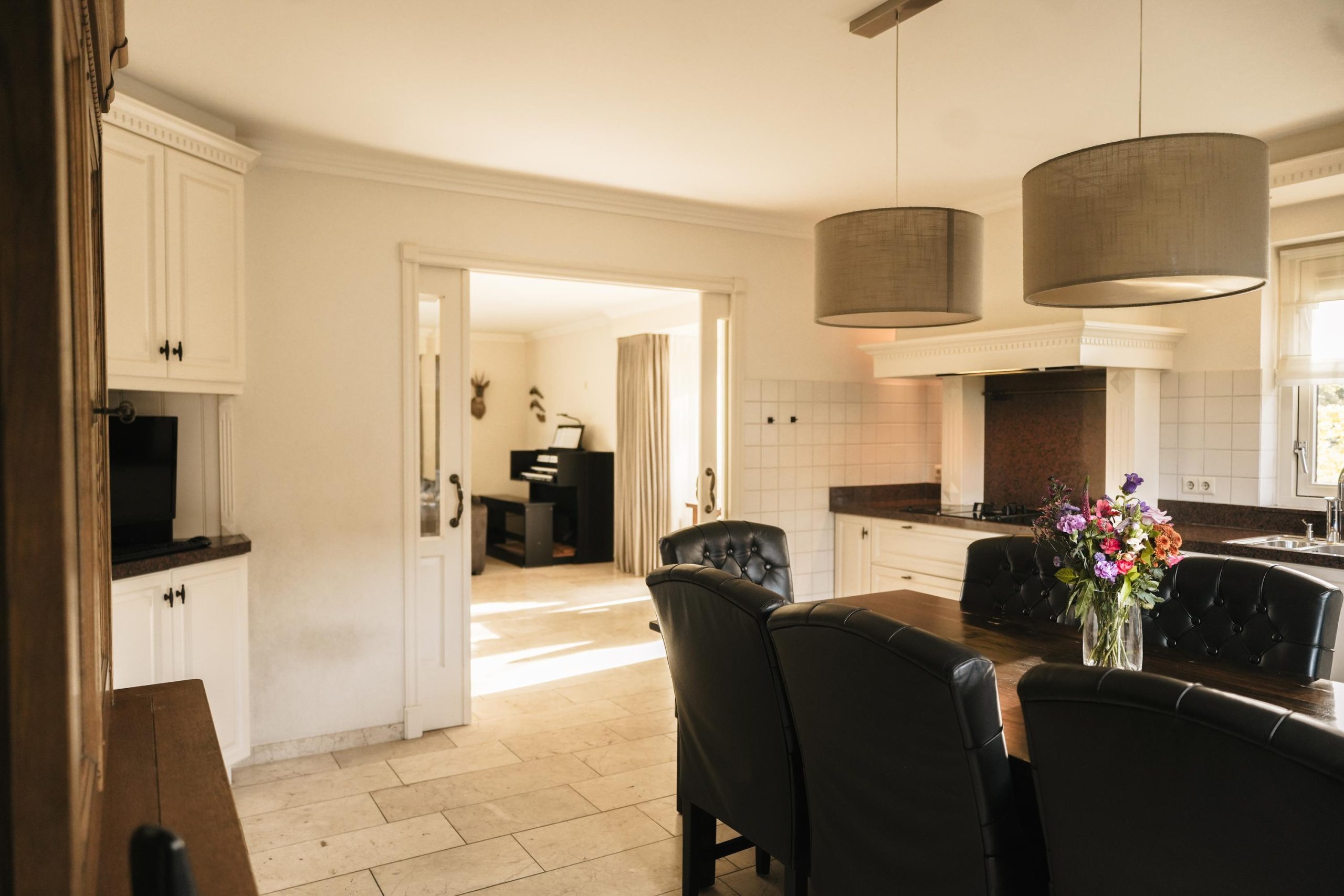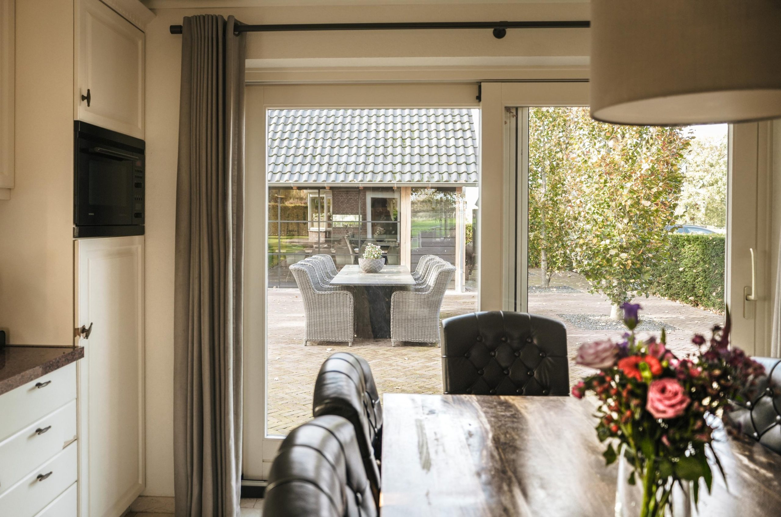 De landelijke keuken, gesitueerd aan de achterzijde van de woning, vormt het hart van het huis. Via de schuifpui is er direct toegang tot het terras en de tuin, waardoor binnen en buiten mooi in elkaar overlopen.