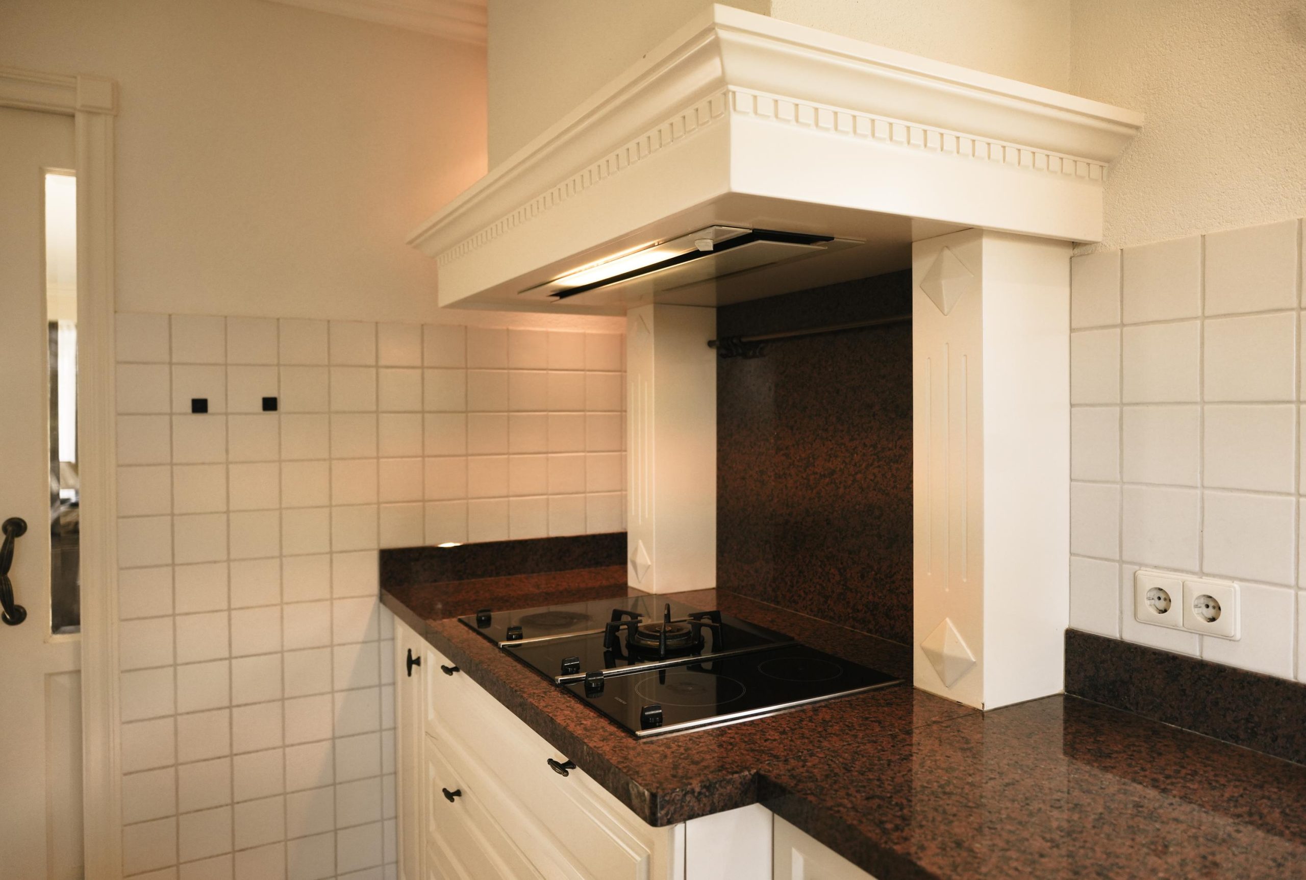 Het keukenblok is uitgevoerd in landelijke stijl met een natuurstenen aanrechtblad en voorzien van diverse inbouwapparatuur, waaronder een inductiekookplaat met aparte wokbrander, 1½ spoelbak, afzuiginstallatie, vaatwasser, koelkast en combimagnetron-oven.