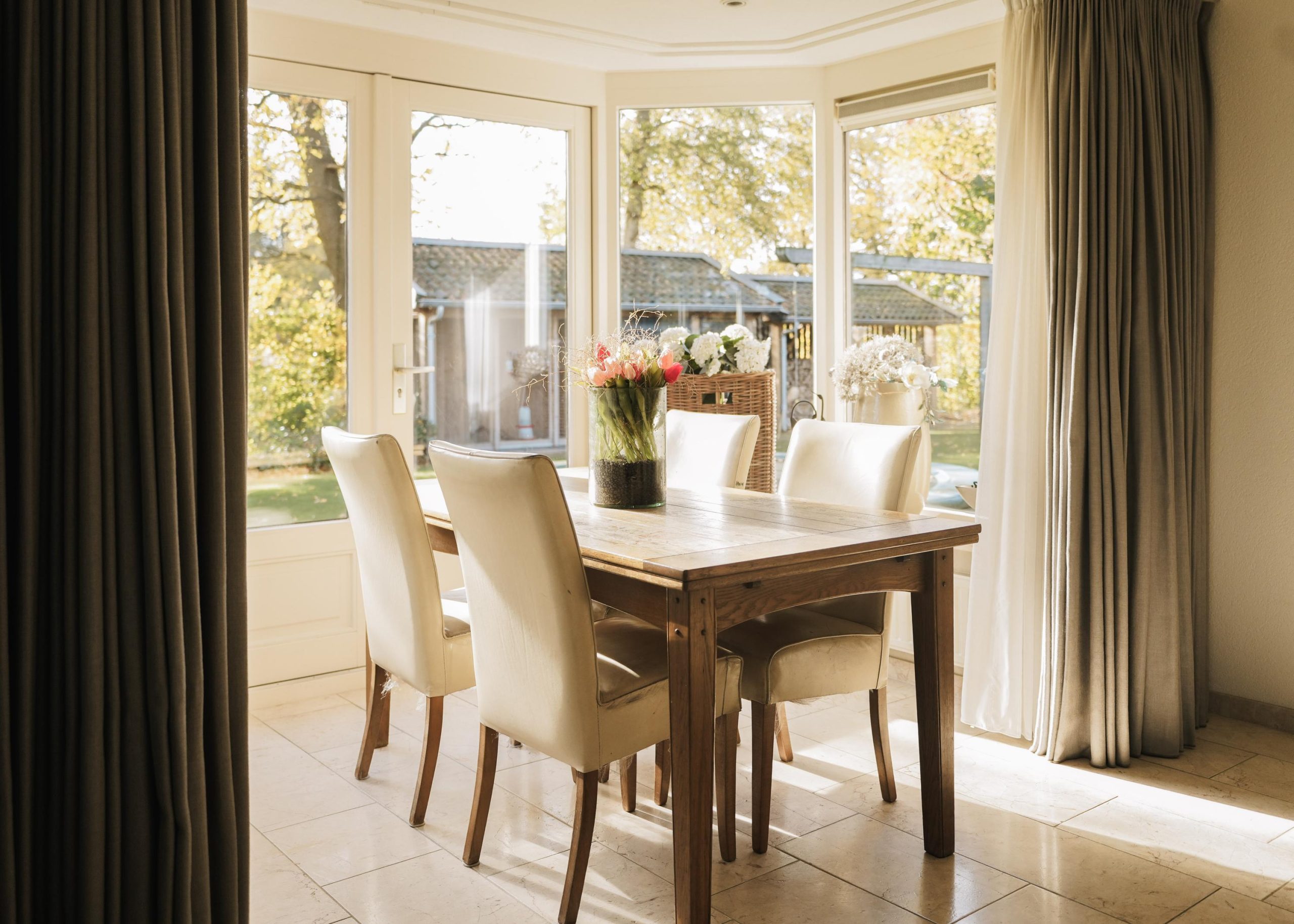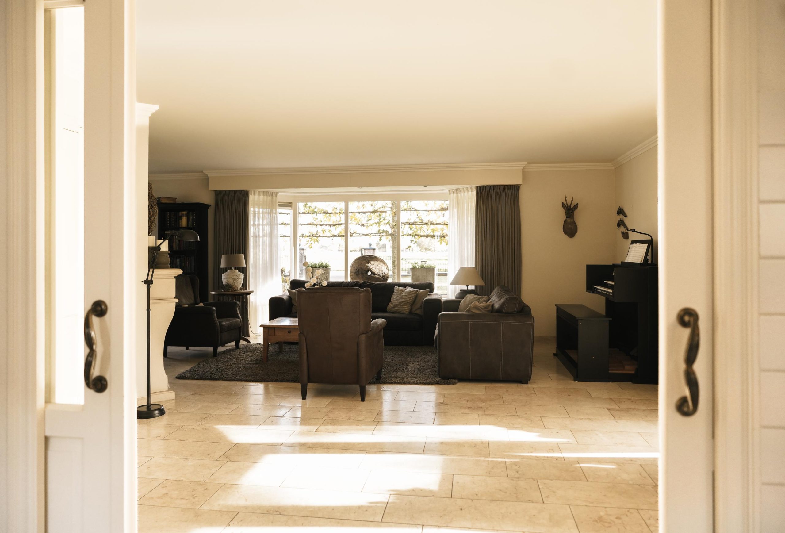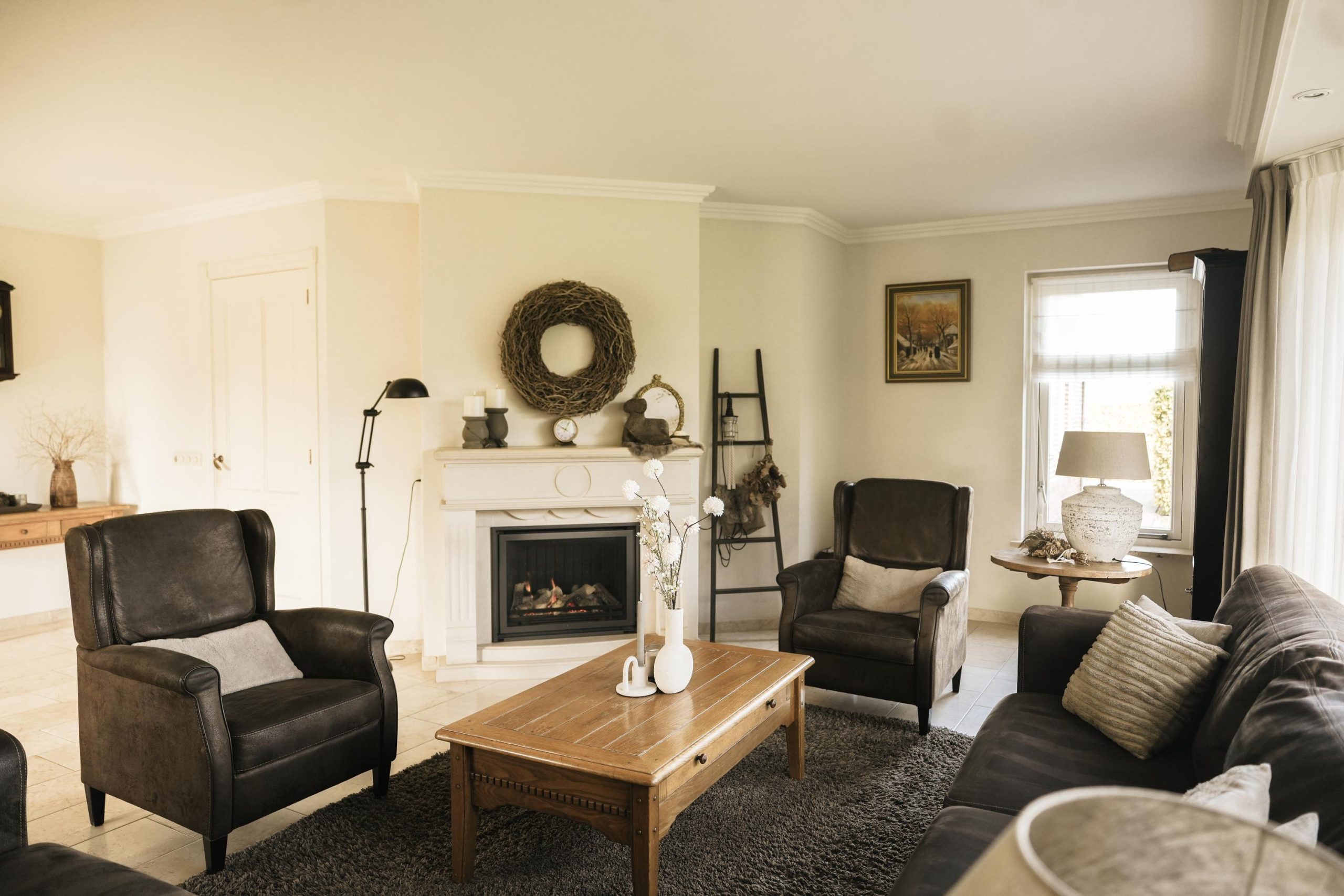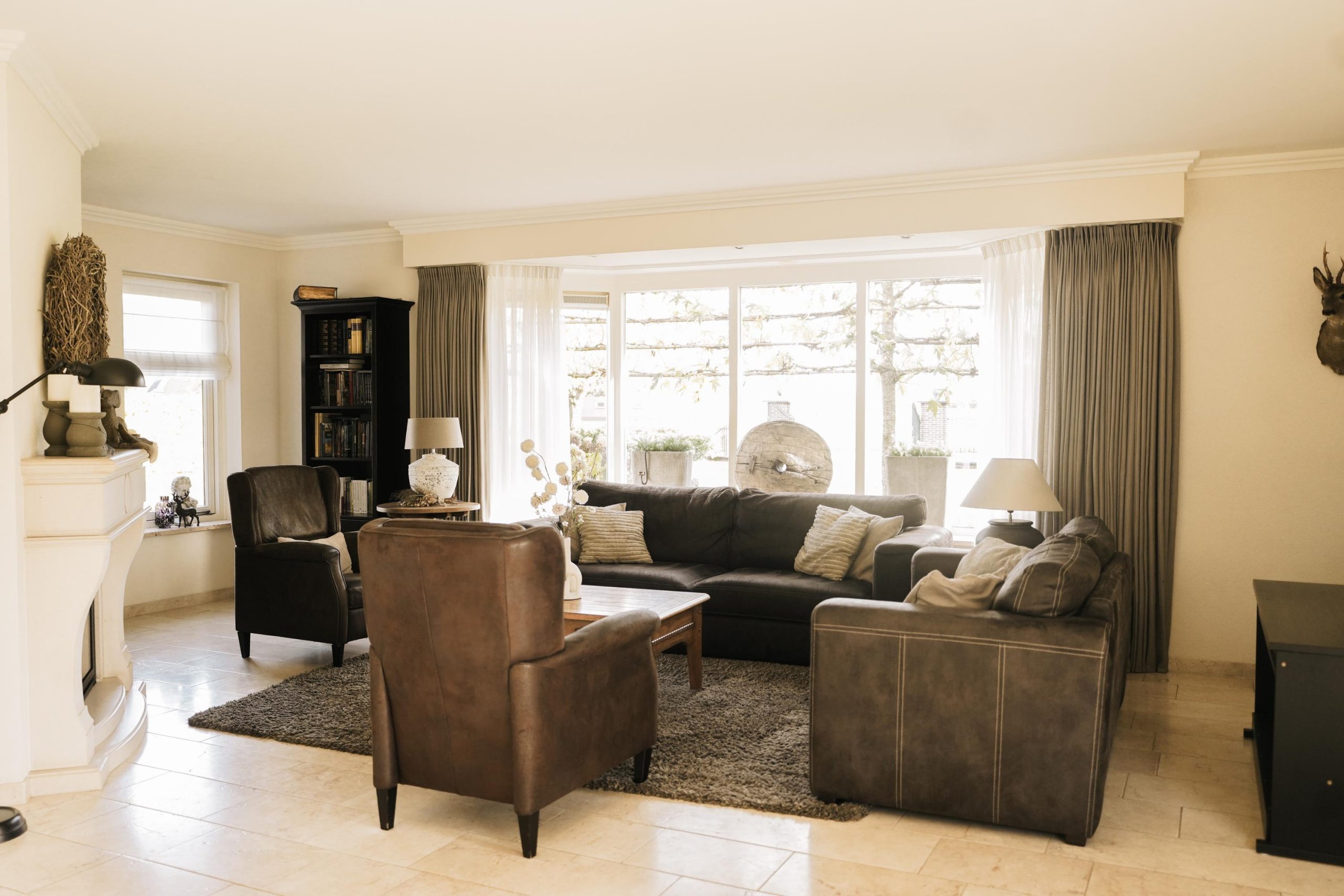 Ensuite bevindt zich de lichte woonkamer met een sfeervolle schouw met gashaard en fraaie erkers die een prachtig uitzicht bieden over de tuin.