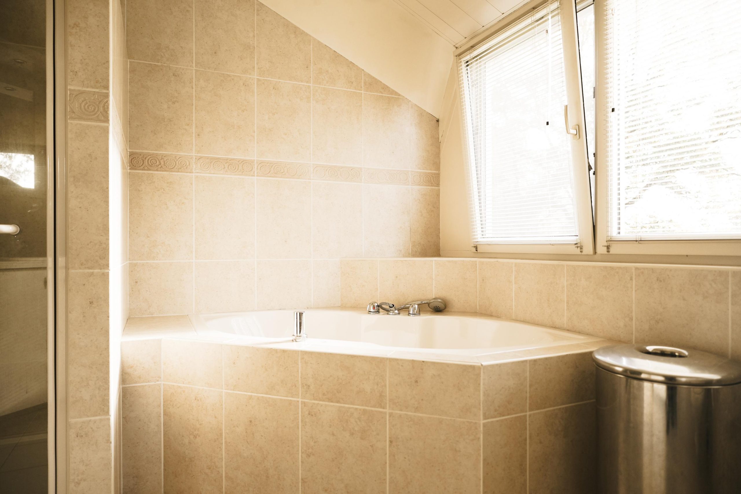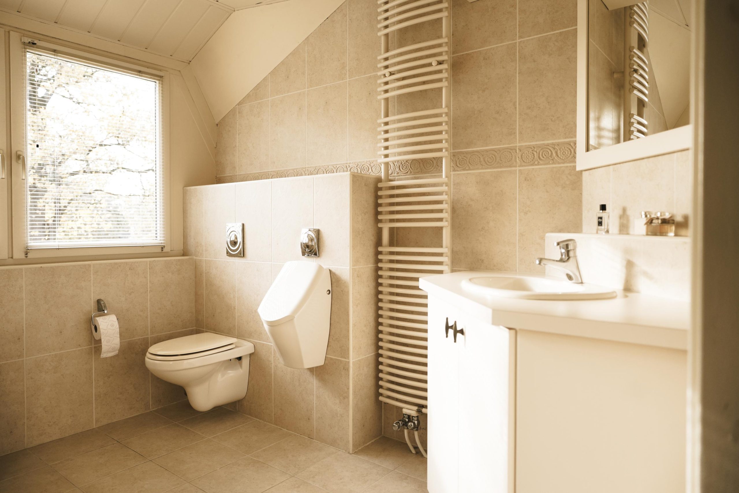 De badkamer is luxe uitgevoerd met een ligbad, toilet, urinoir, douchecabine, designradiator en wastafelmeubel.