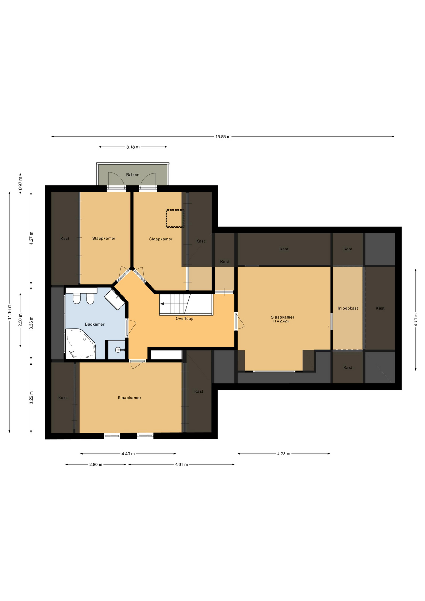 Op de verdieping bevindt zich een ruime overloop met inbouwkast. De ouderslaapkamer is voorzien van een dakkapel en een inloopkast. Verder zijn er nog drie royale slaapkamers, waarvan twee aan de achterzijde met toegang tot het balkon en één aan de voorzijde van de woning.