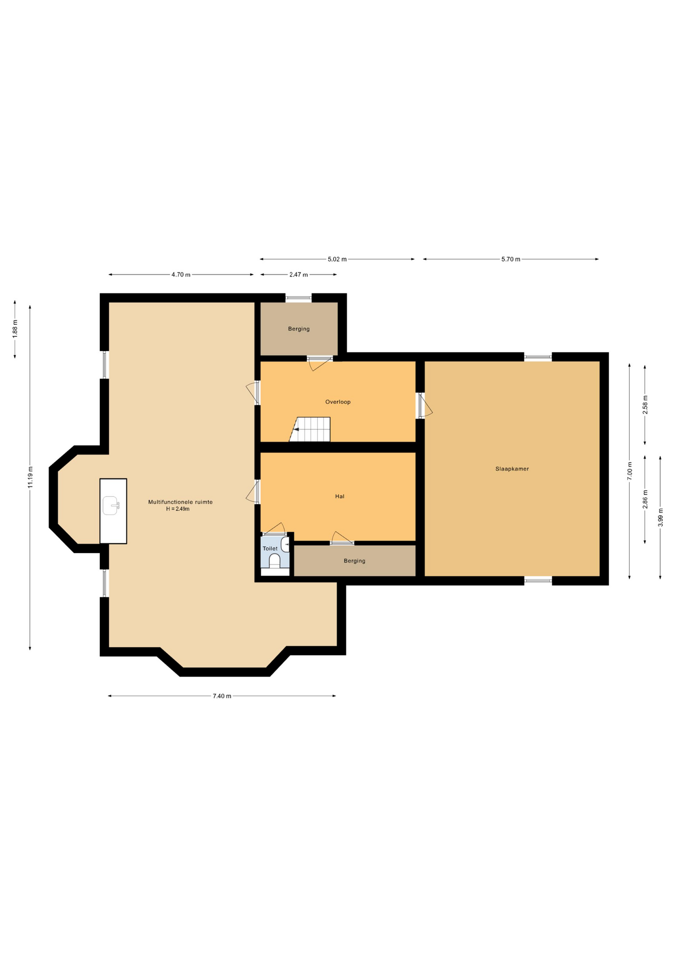 Aan de voorzijde komt u de woning binnen in een ruime hal met trapopgang, meterkast en toilet met fonteintje. Op de begane grond bevindt zich tevens een slaapkamer (momenteel in gebruik als kantoorruimte) met vaste kast en een aangrenzende badkamer in neutrale kleurstelling, voorzien van douche, designradiator, wastafel met badkamermeubel en vloerverwarming.
