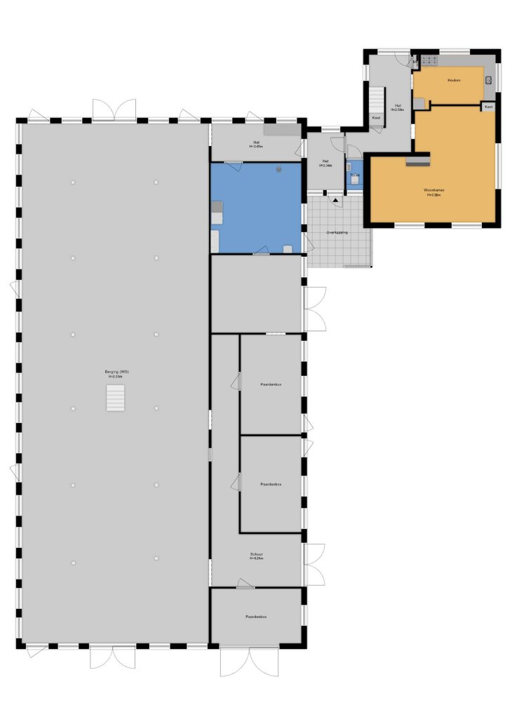 Grote stal/schuur, via een hal/bijkeuken gekoppeld aan het woonhuis. De schuur is opgetrokken in steen en gedekt met geïsoleerde sandwichpanelen. In de schuur zijn een drietal zeer grote design paardenboxen van Corton, type Rembrandt, aangebracht. Ook is er een wasplaats met een douche en warm water en een aparte zadelkamer. Het overige gedeelte van deze schuur is in gebruik als berging/opslag en heeft een grote hooizolder met stenen vloer. Er is een eigen waterbron met hydrofoorinstallatie aanwezig.