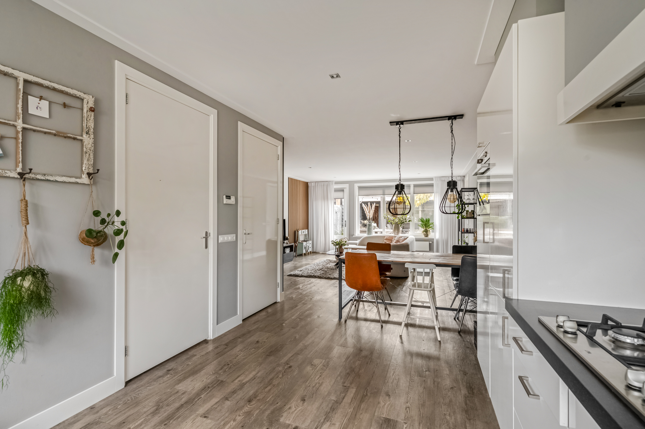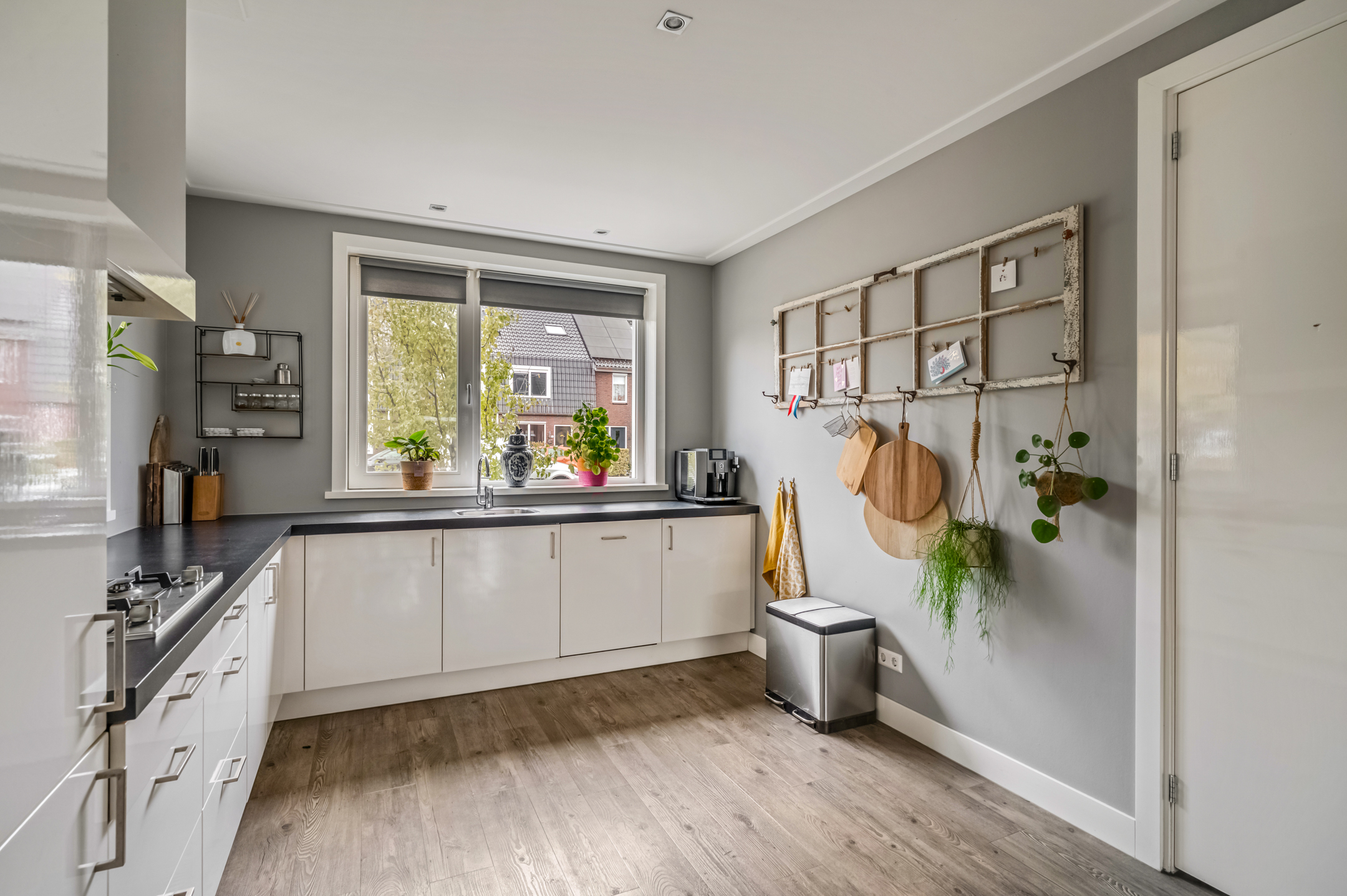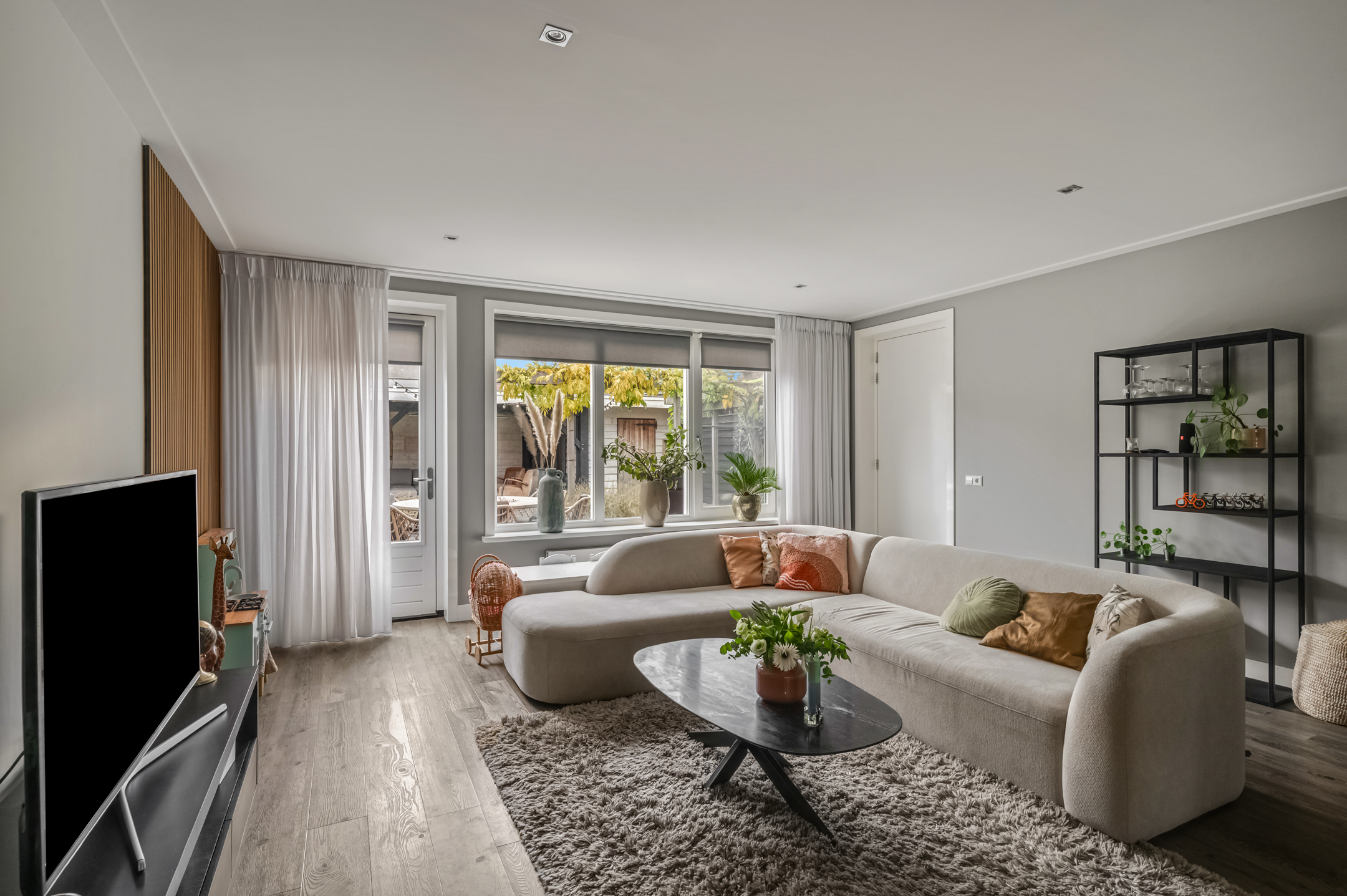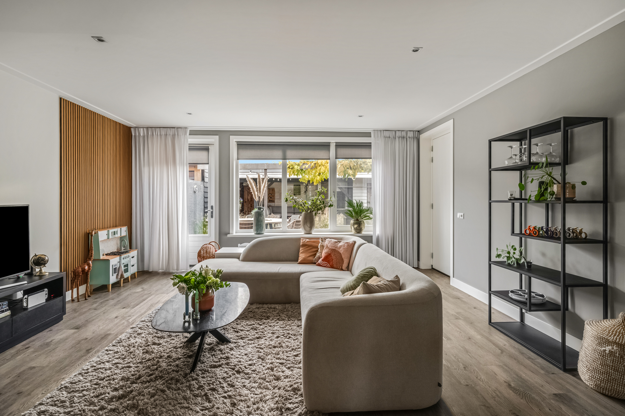 Bij binnenkomst valt direct de verzorgde afwerking op: lichte kleuren, strak gestucte wanden en plafonds, inbouwspots en een nette vloer zorgen voor een moderne en sfeervolle uitstraling. De tuingerichte woonkamer is royaal van opzet en biedt via een deur toegang tot de achtertuin. Aan de voorzijde ligt de open keuken in een lichte kleurstelling, ruim ingedeeld en voorzien van diverse inbouwapparatuur. Hier kook je met plezier, terwijl je uitkijkt over de rustige straat. Aansluitend aan de woonkamer bevindt zich een praktische bijkeuken met achterdeur naar de tuin, ideaal voor extra voorraad of opbergruimte. Vanuit de bijkeuken heb je direct toegang tot de garage, die ook bereikbaar is via de carport. Parkeren op eigen terrein is dus altijd mogelijk, overdekt en direct bij de hand.