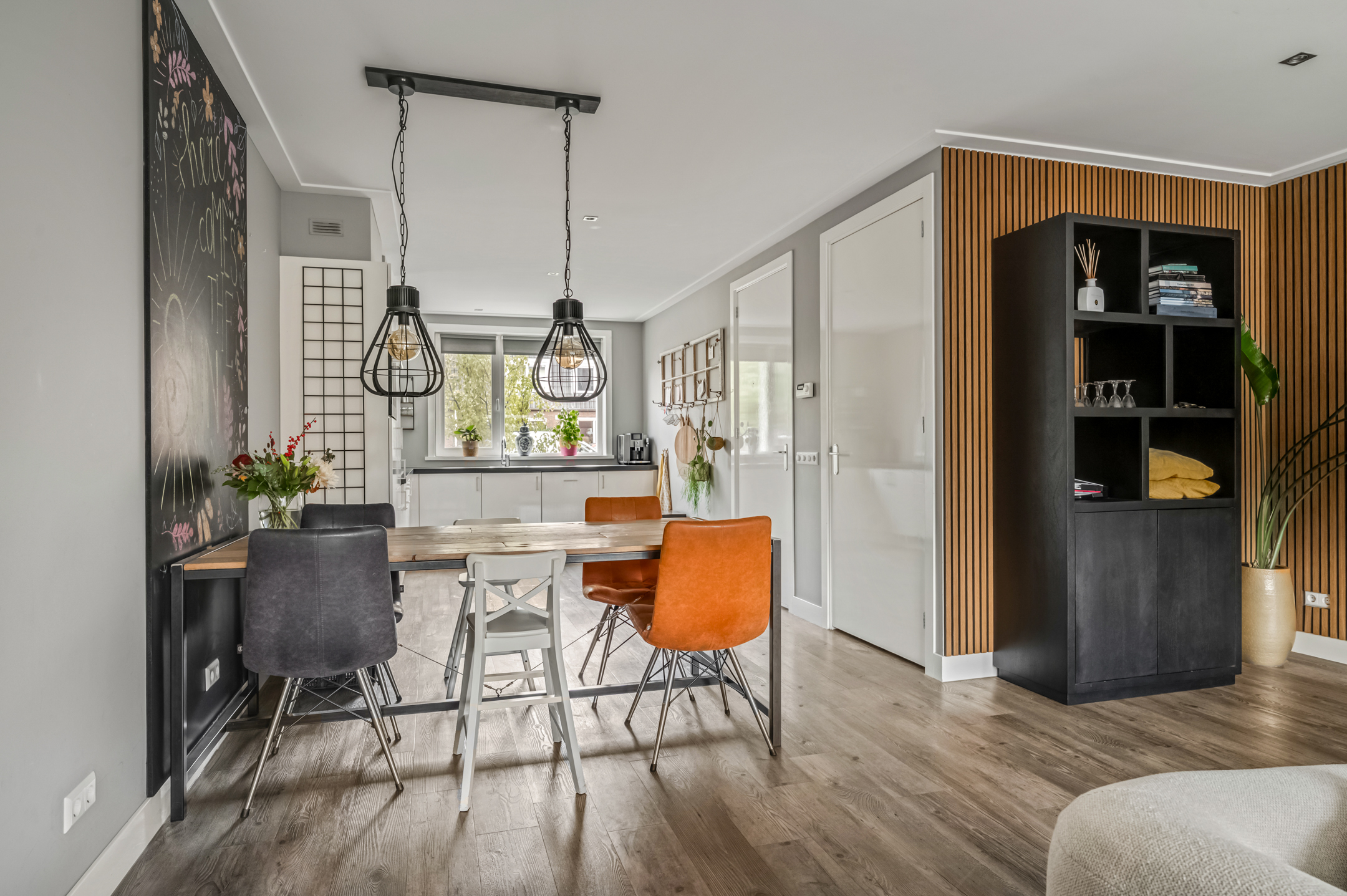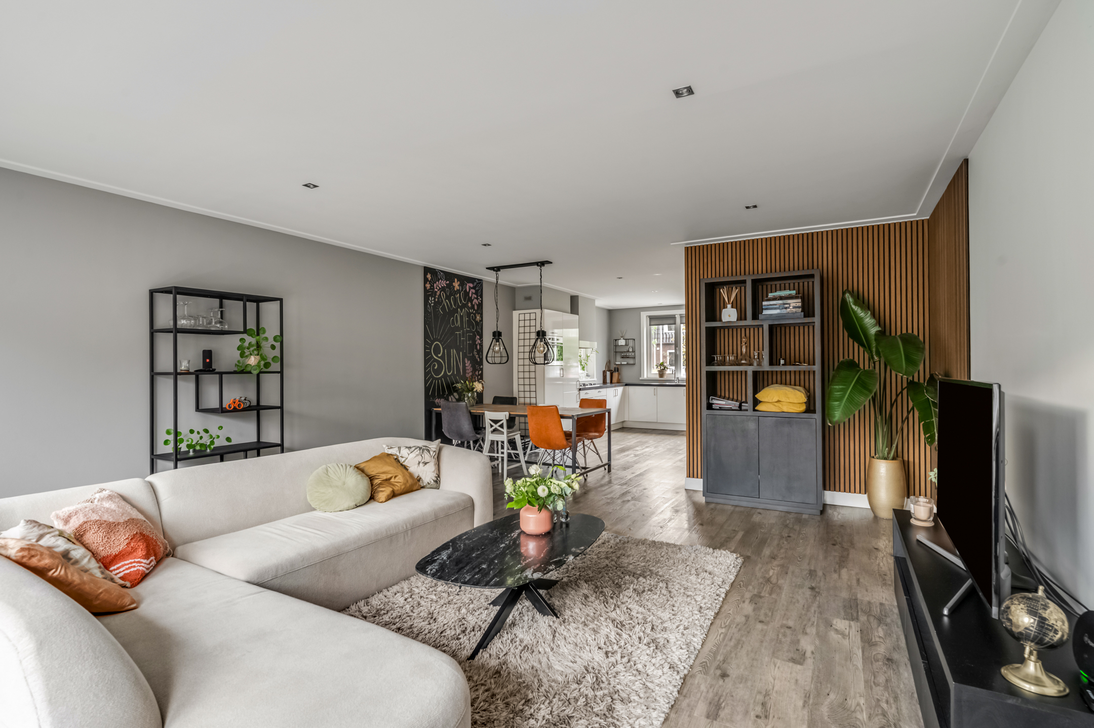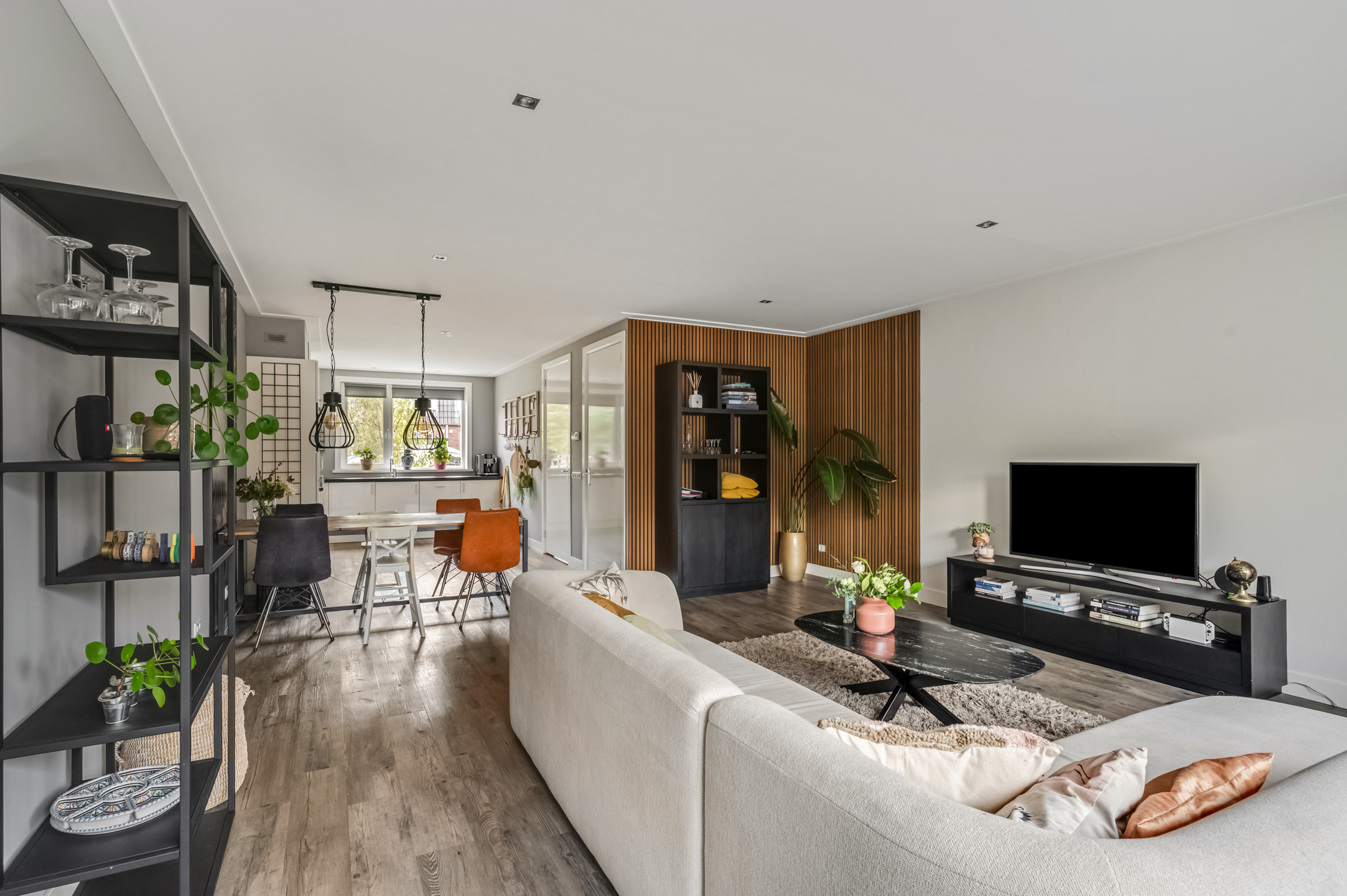 Bij binnenkomst valt direct de verzorgde afwerking op: lichte kleuren, strak gestucte wanden en plafonds, inbouwspots en een nette vloer zorgen voor een moderne en sfeervolle uitstraling. De tuingerichte woonkamer is royaal van opzet en biedt via een deur toegang tot de achtertuin. Aan de voorzijde ligt de open keuken in een lichte kleurstelling, ruim ingedeeld en voorzien van diverse inbouwapparatuur. Hier kook je met plezier, terwijl je uitkijkt over de rustige straat. Aansluitend aan de woonkamer bevindt zich een praktische bijkeuken met achterdeur naar de tuin, ideaal voor extra voorraad of opbergruimte. Vanuit de bijkeuken heb je direct toegang tot de garage, die ook bereikbaar is via de carport. Parkeren op eigen terrein is dus altijd mogelijk, overdekt en direct bij de hand.