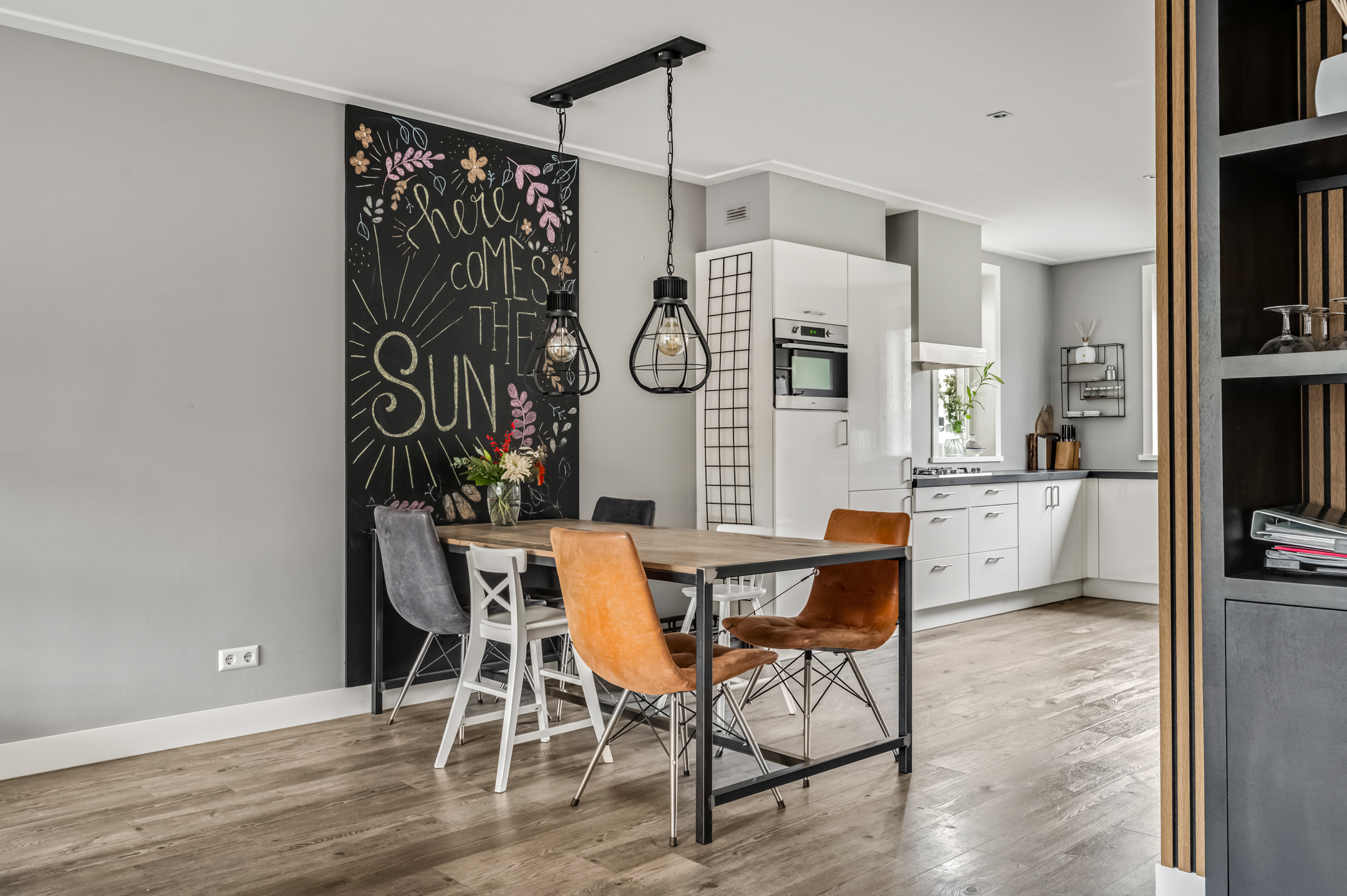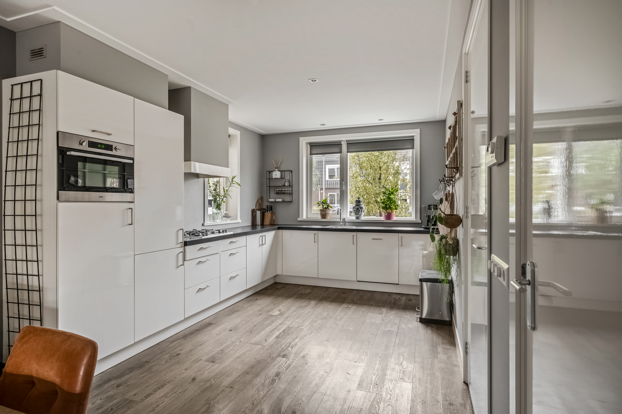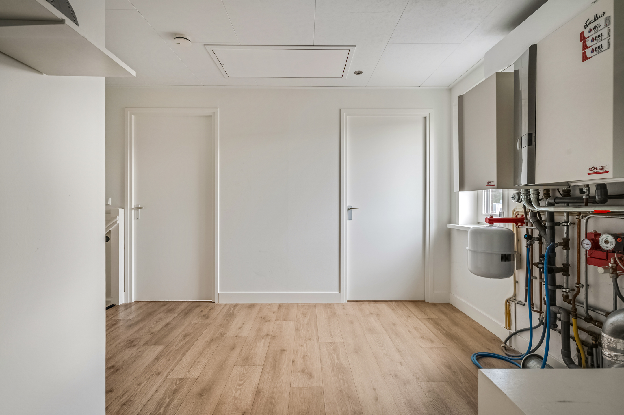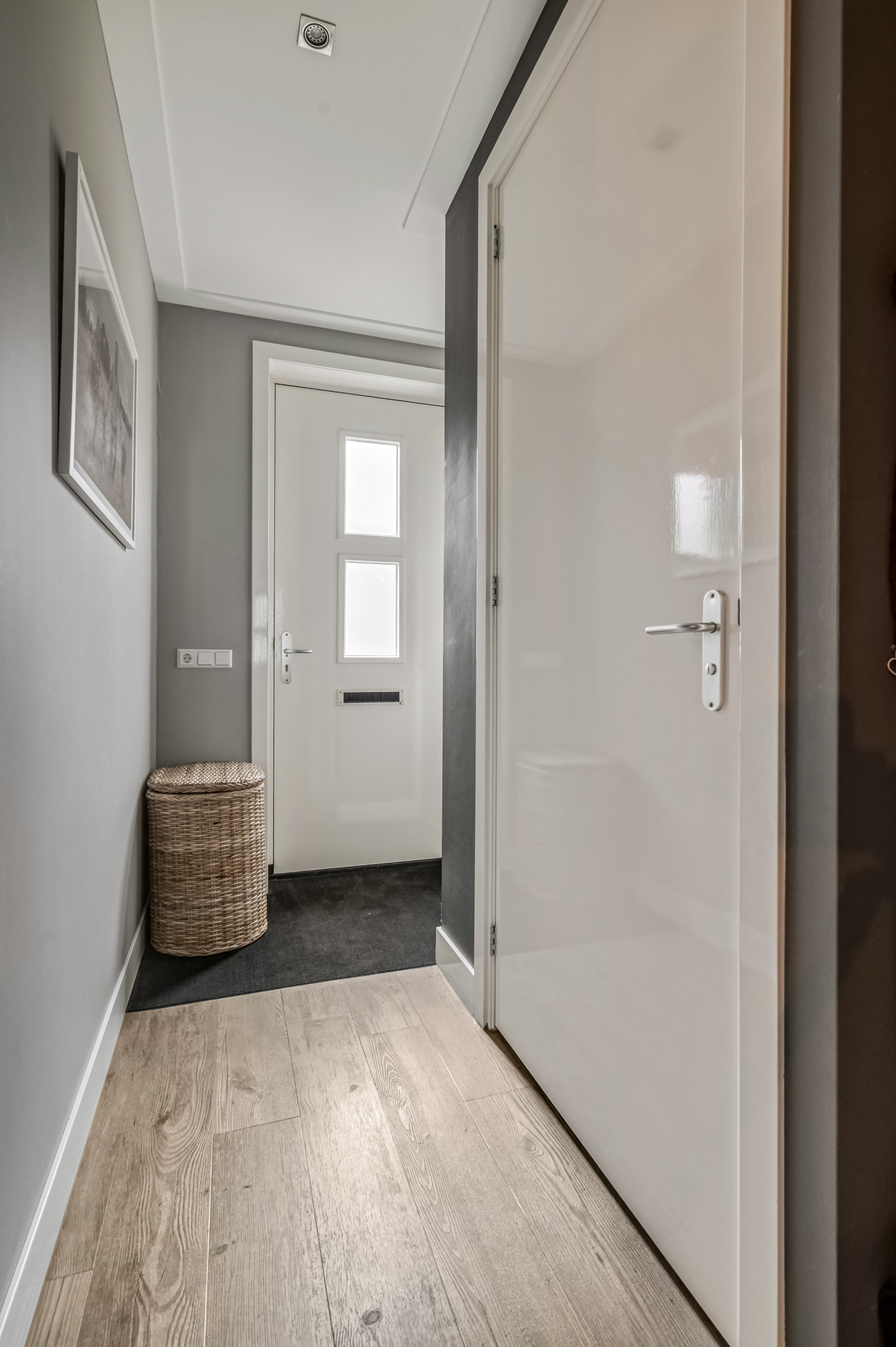 Bij binnenkomst valt direct de verzorgde afwerking op: lichte kleuren, strak gestucte wanden en plafonds, inbouwspots en een nette vloer zorgen voor een moderne en sfeervolle uitstraling. De tuingerichte woonkamer is royaal van opzet en biedt via een deur toegang tot de achtertuin. Aan de voorzijde ligt de open keuken in een lichte kleurstelling, ruim ingedeeld en voorzien van diverse inbouwapparatuur. Hier kook je met plezier, terwijl je uitkijkt over de rustige straat. Aansluitend aan de woonkamer bevindt zich een praktische bijkeuken met achterdeur naar de tuin, ideaal voor extra voorraad of opbergruimte. Vanuit de bijkeuken heb je direct toegang tot de garage, die ook bereikbaar is via de carport. Parkeren op eigen terrein is dus altijd mogelijk, overdekt en direct bij de hand.