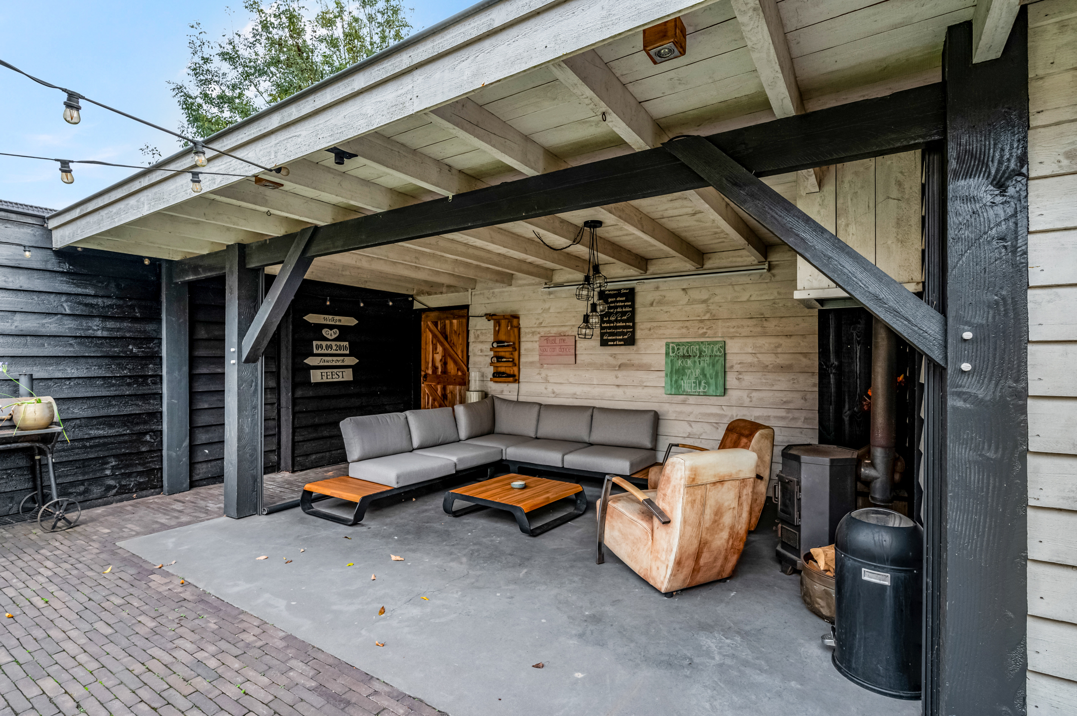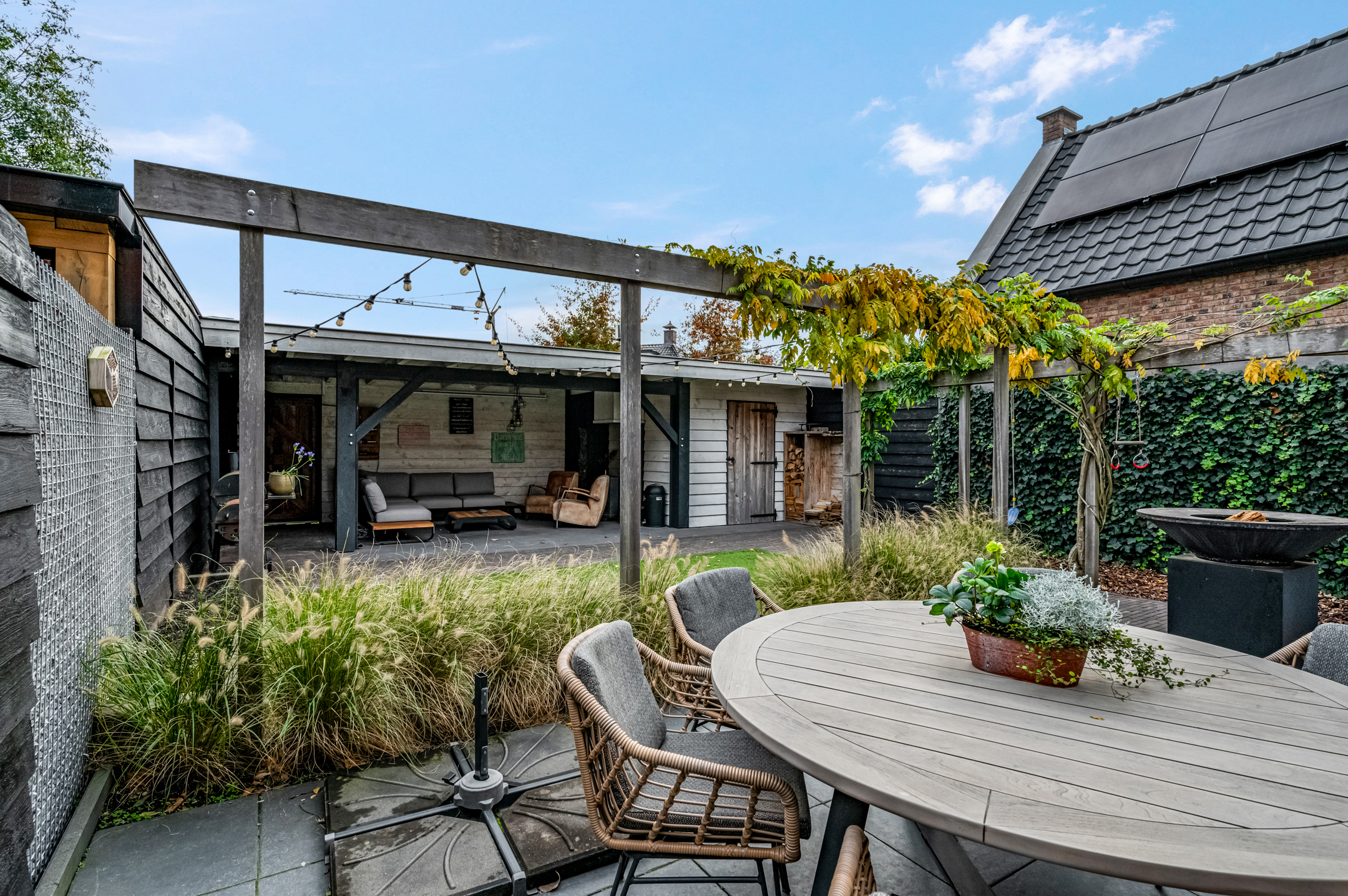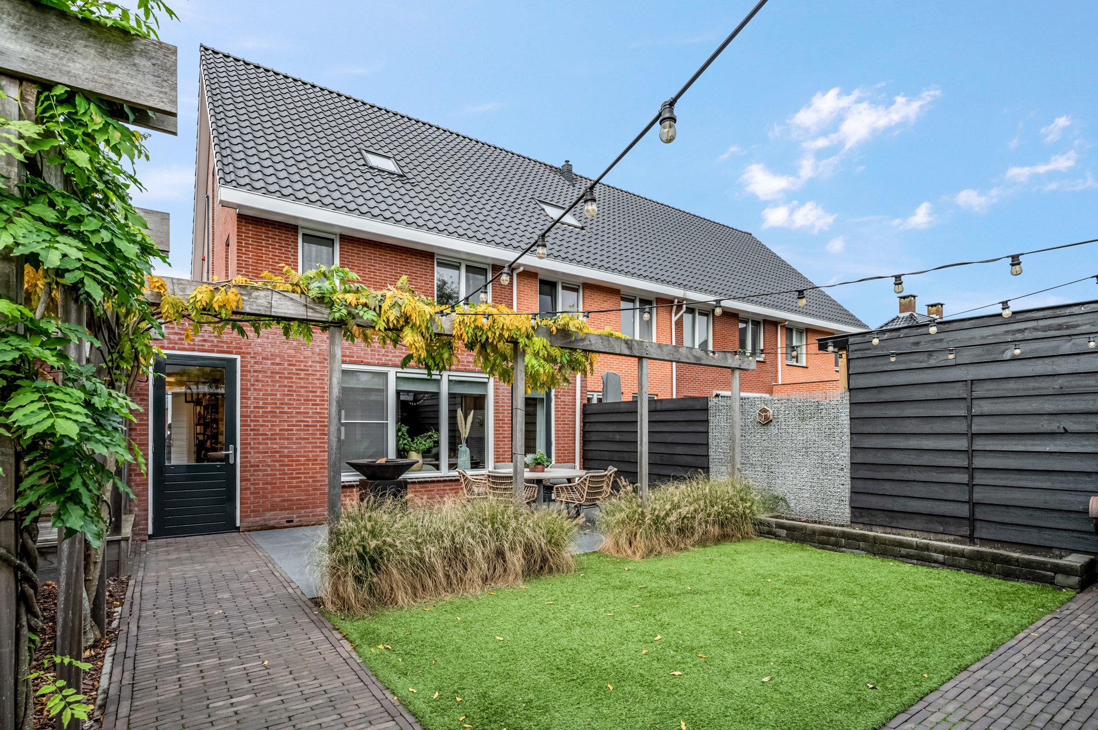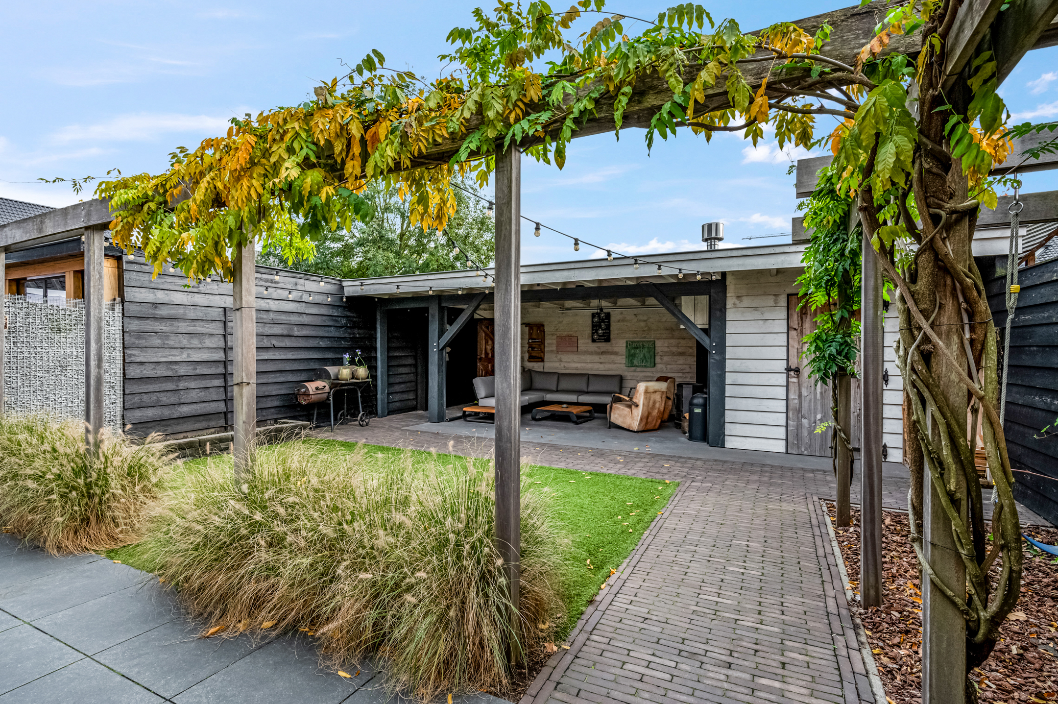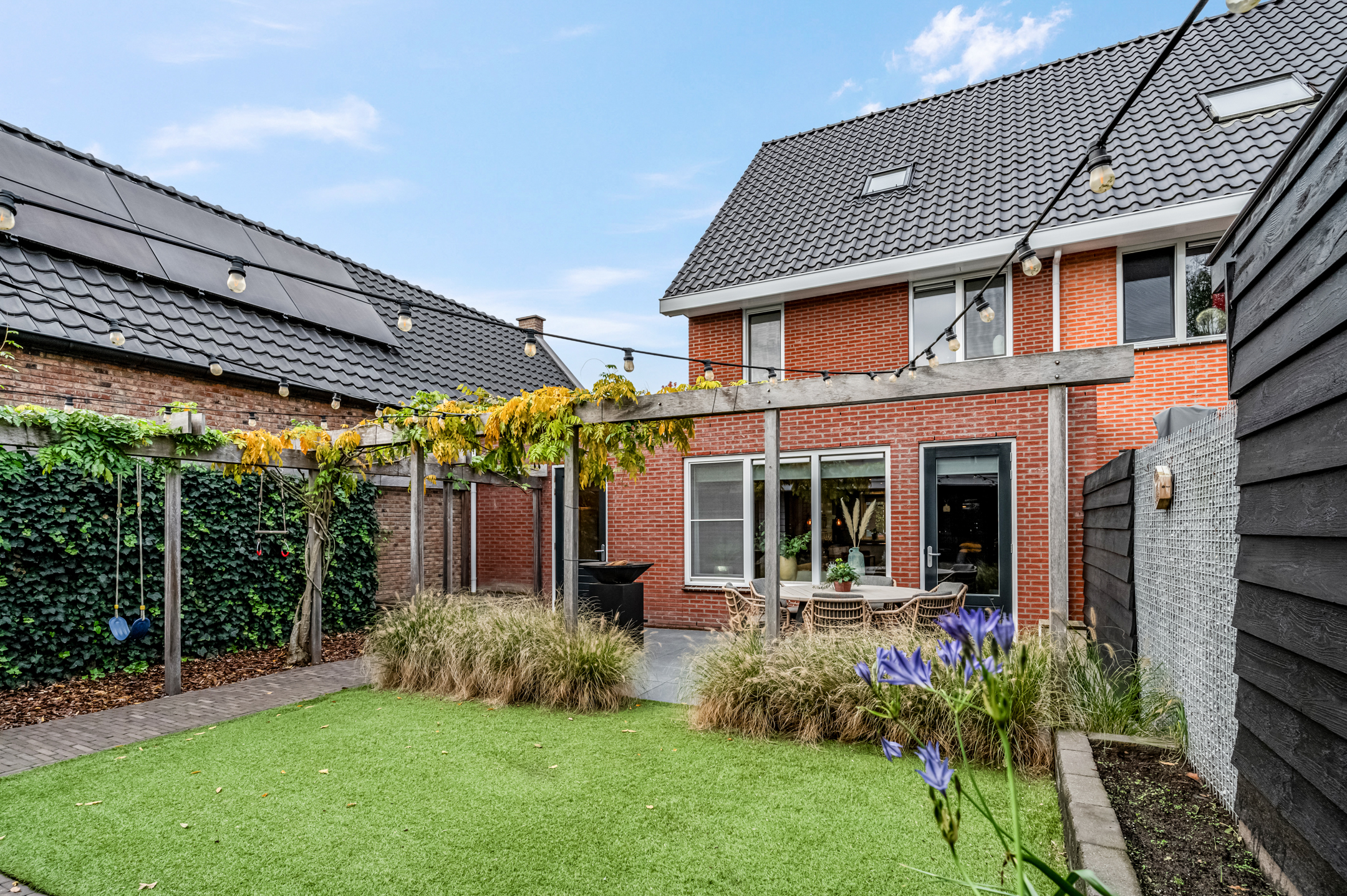 De achtertuin is keurig aangelegd met kunstgras, sierbestrating en beplanting. Absolute eyecatcher is de grote, houten veranda achter in de tuin: een heerlijke plek om te ontspannen. Dankzij de houtkachel is het hier ook in het voor- en najaar goed toeven. Direct grenzend aan de veranda bevindt zich een ruime berging, ideaal voor het stallen van fietsen, opbergen van gereedschap of het inrichten van een hobbyruimte. De tuin biedt directe toegang tot het groene plantsoen aan de achterzijde.