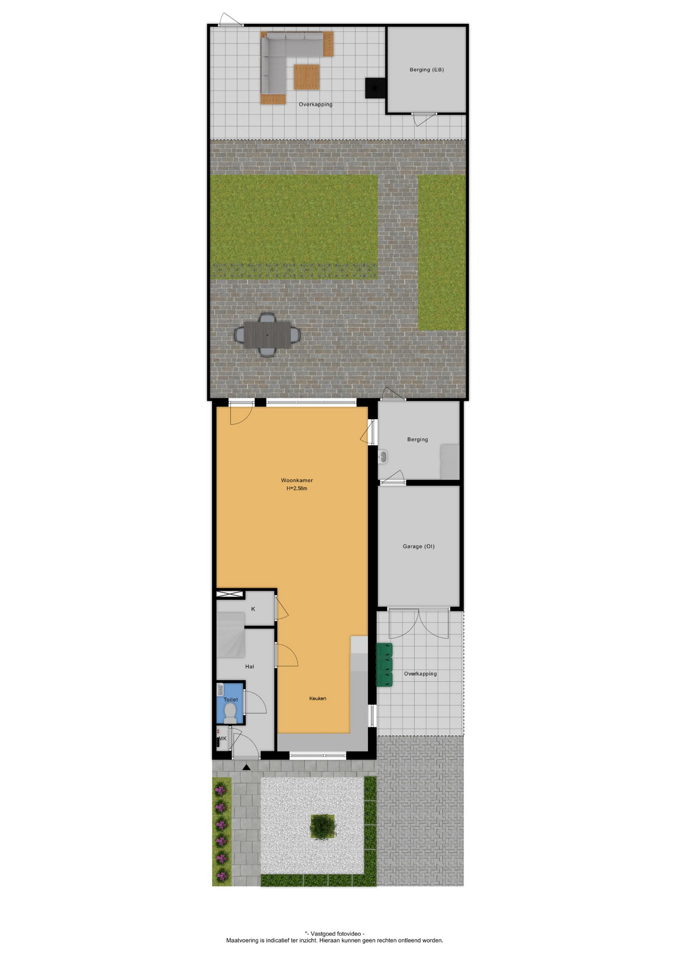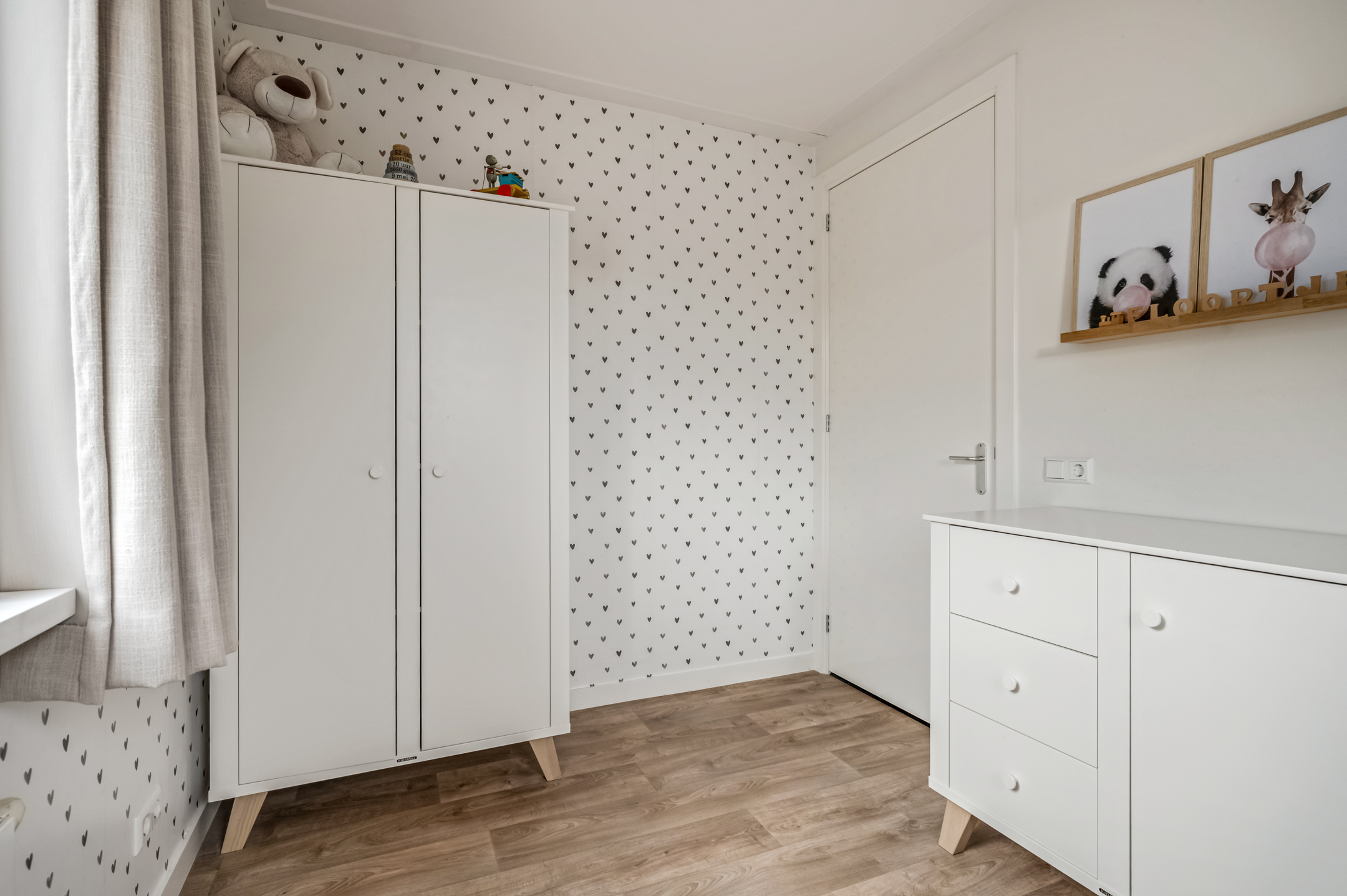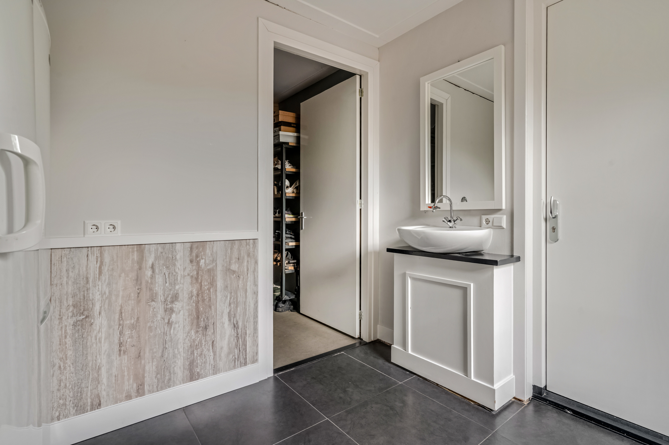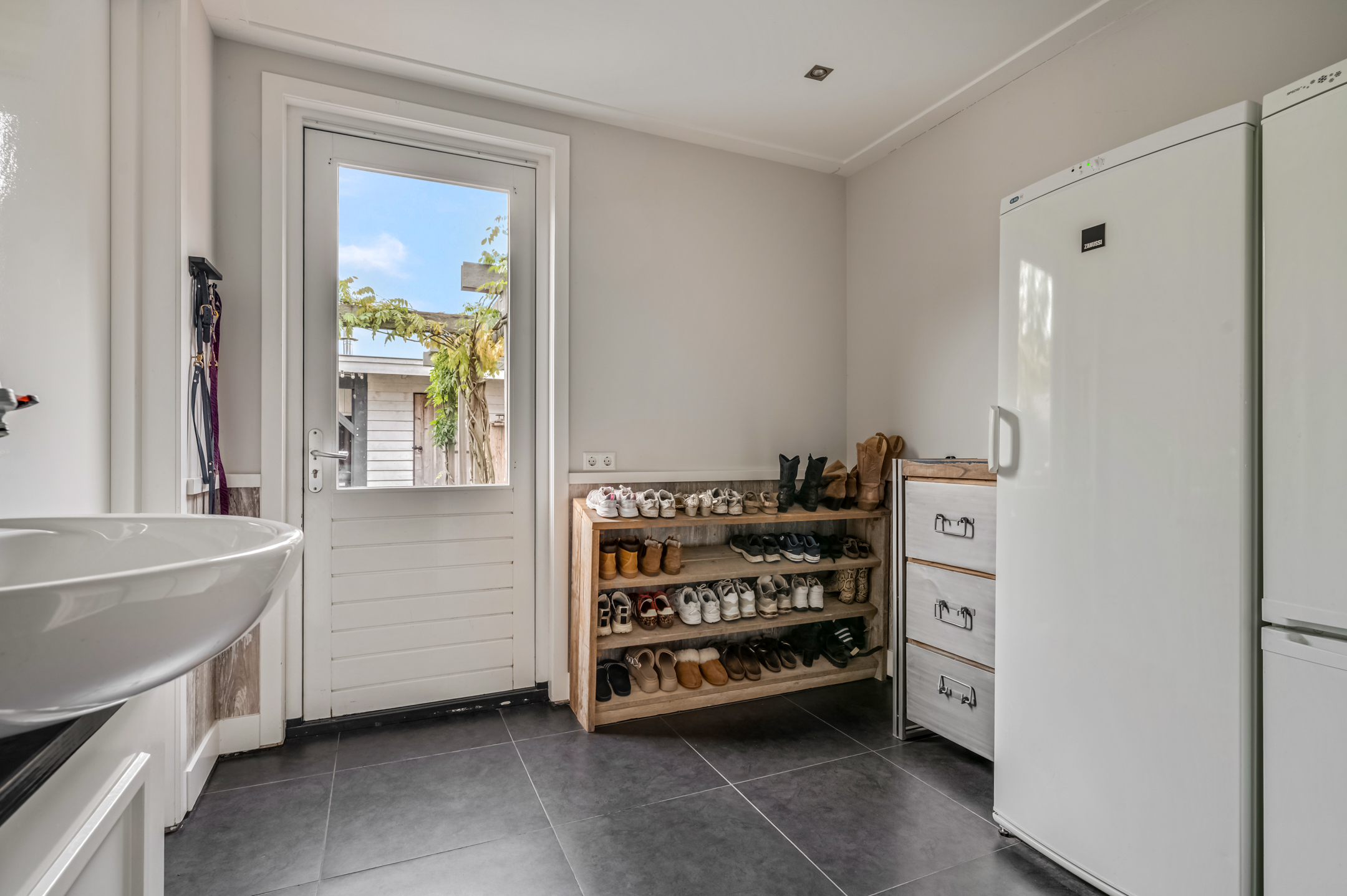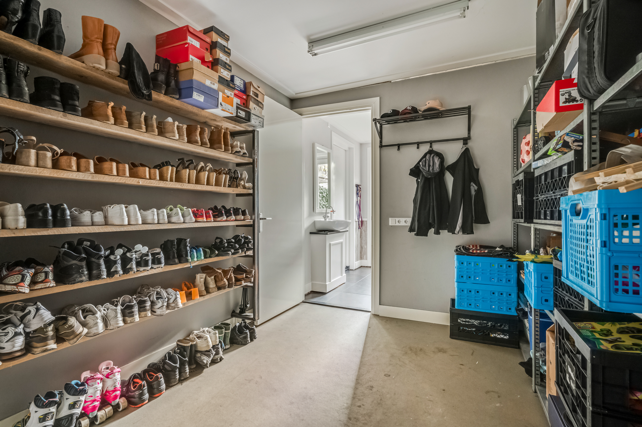 De achtertuin is keurig aangelegd met kunstgras, sierbestrating en beplanting. Absolute eyecatcher is de grote, houten veranda achter in de tuin: een heerlijke plek om te ontspannen. Dankzij de houtkachel is het hier ook in het voor- en najaar goed toeven. Direct grenzend aan de veranda bevindt zich een ruime berging, ideaal voor het stallen van fietsen, opbergen van gereedschap of het inrichten van een hobbyruimte. De tuin biedt directe toegang tot het groene plantsoen aan de achterzijde.