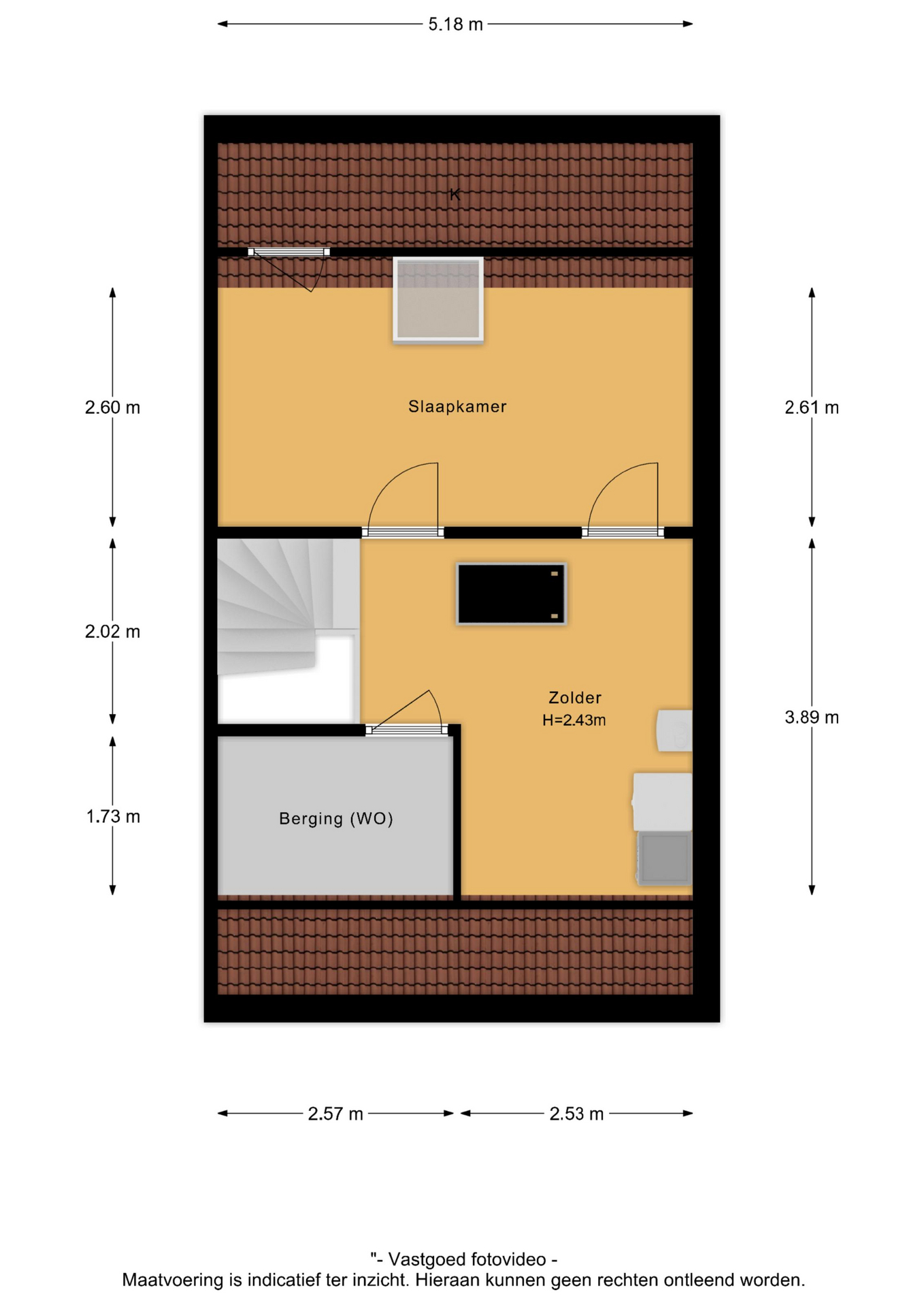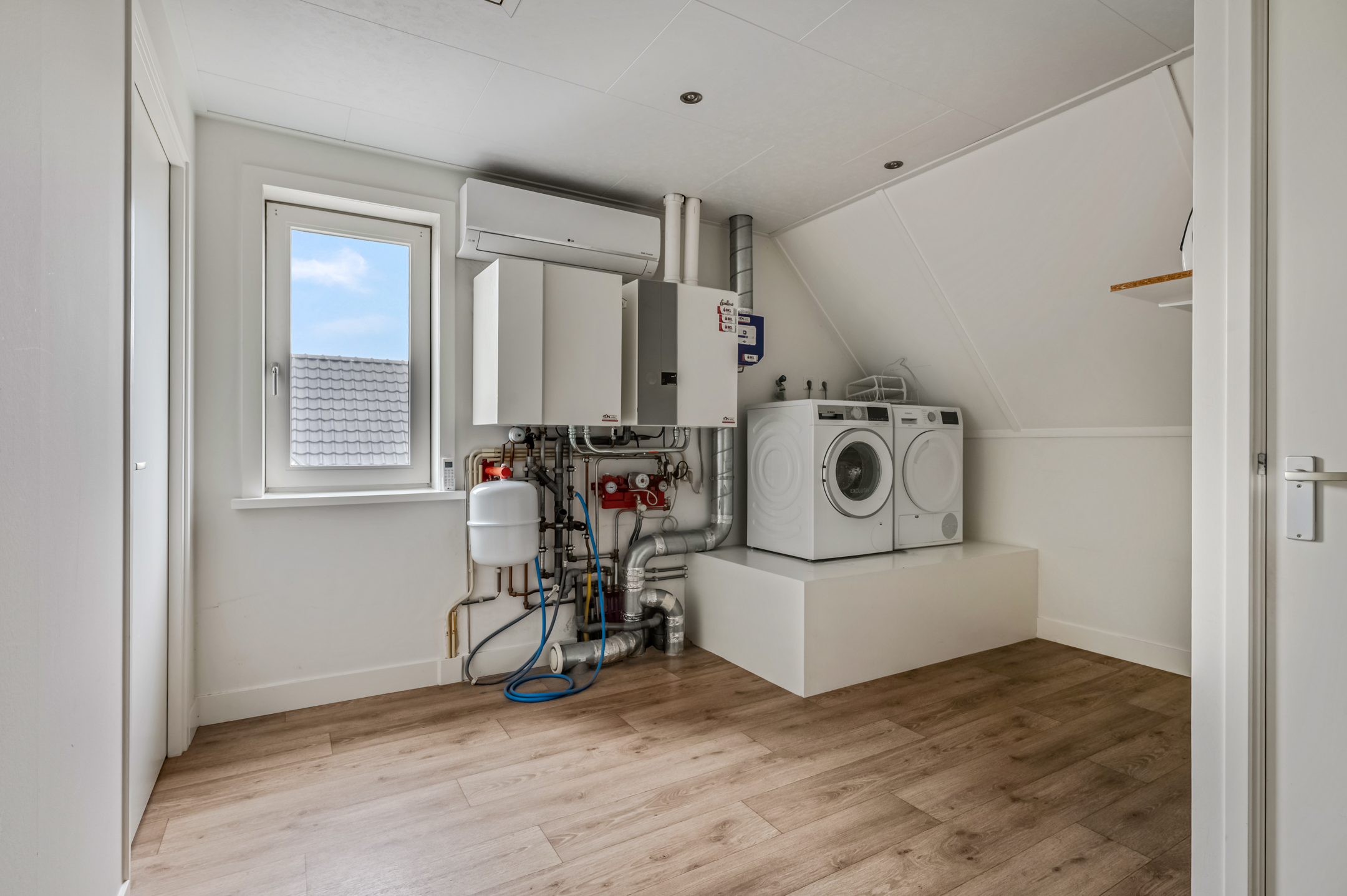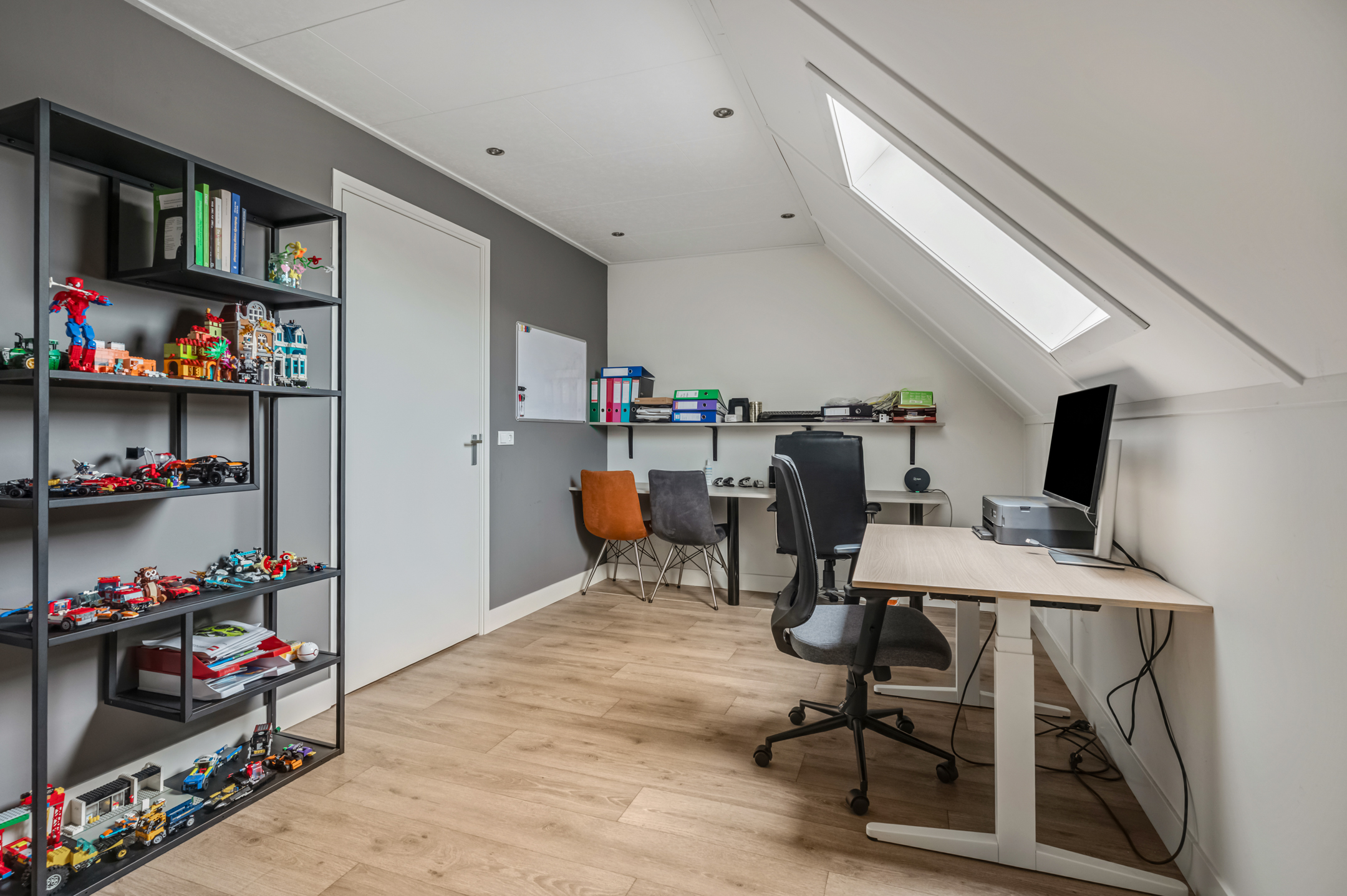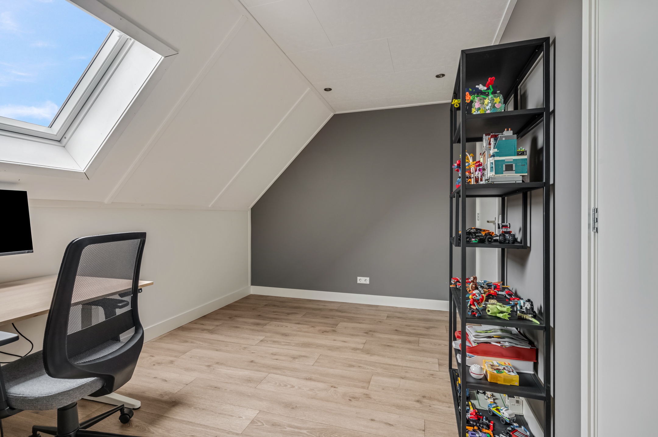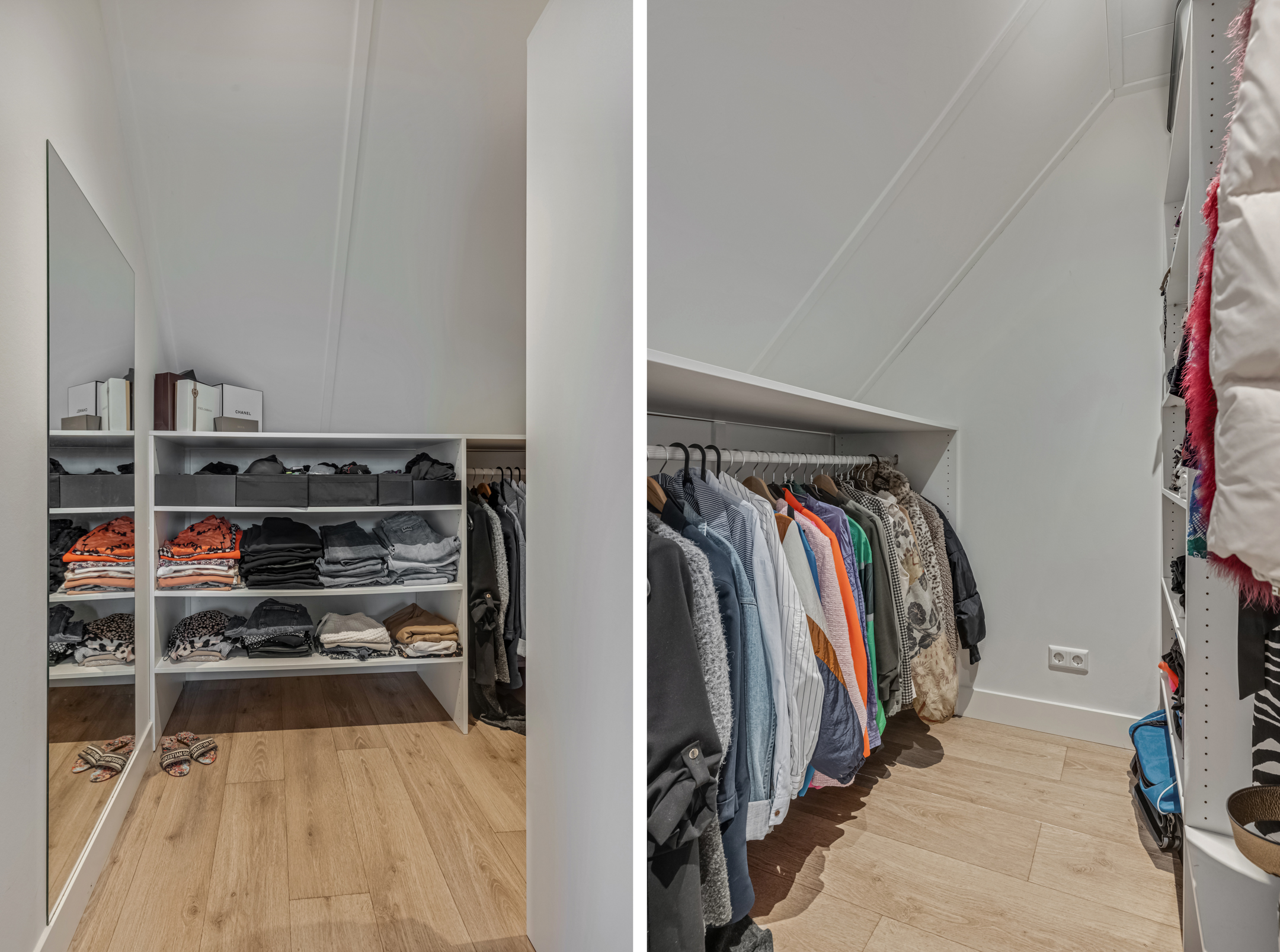 De zolderverdieping is via een vaste trap bereikbaar. Hier vind je een inloopkast en een ruime vierde slaapkamer, maar er is voldoende ruimte om een vijfde kamer te realiseren. De airconditioning op de verdieping zorgt voor een prettige koelte op warme dagen. Extra bergruimte is beschikbaar achter de knieschotten en op de vliering die bereikbaar is via een vlizotrap.