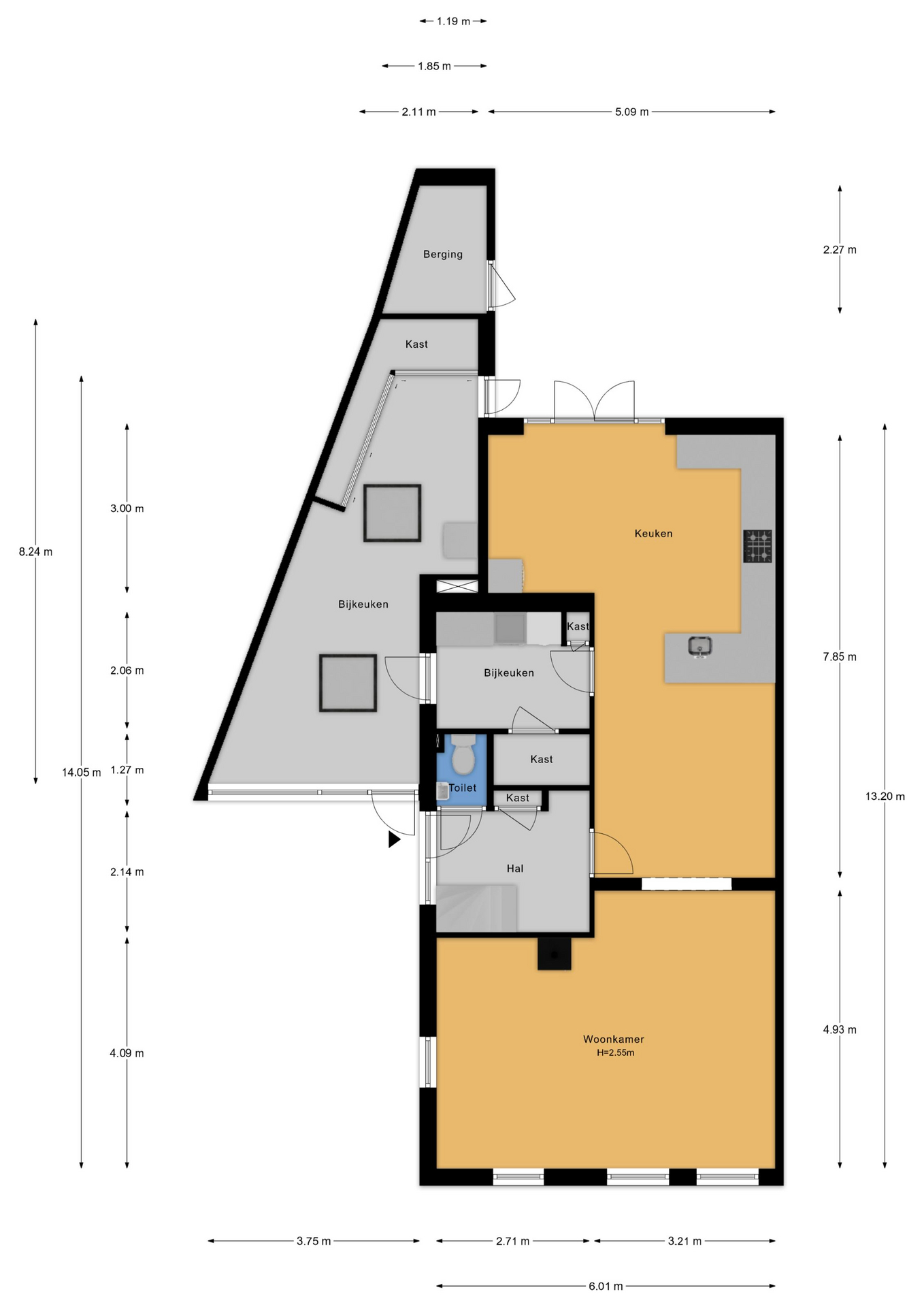 Via de entree kom je in de hal met toegang tot het toilet en de trapopgang naar de eerste verdieping. De woonkamer is ruim opgezet en voorzien van grote raampartijen, waardoor er veel natuurlijk licht binnenvalt en een houtkachel. De keuken is voorzien van diverse inbouwapparatuur en veel kastruimte en bovendien uitgerust met comfortabele vloerverwarming, wat zorgt voor extra wooncomfort. Vanuit de keuken geven openslaande deuren direct toegang tot de achtertuin, waardoor binnen en buiten op een natuurlijke manier met elkaar worden verbonden. Daarnaast is er voldoende ruimte voor een grote eettafel waar je gezellig met familie of vrienden kunt dineren. Aansluitend aan de keuken bevindt zich een praktische bijkeuken. Ideaal voor extra bergruimte en het plaatsen van de wasapparatuur.