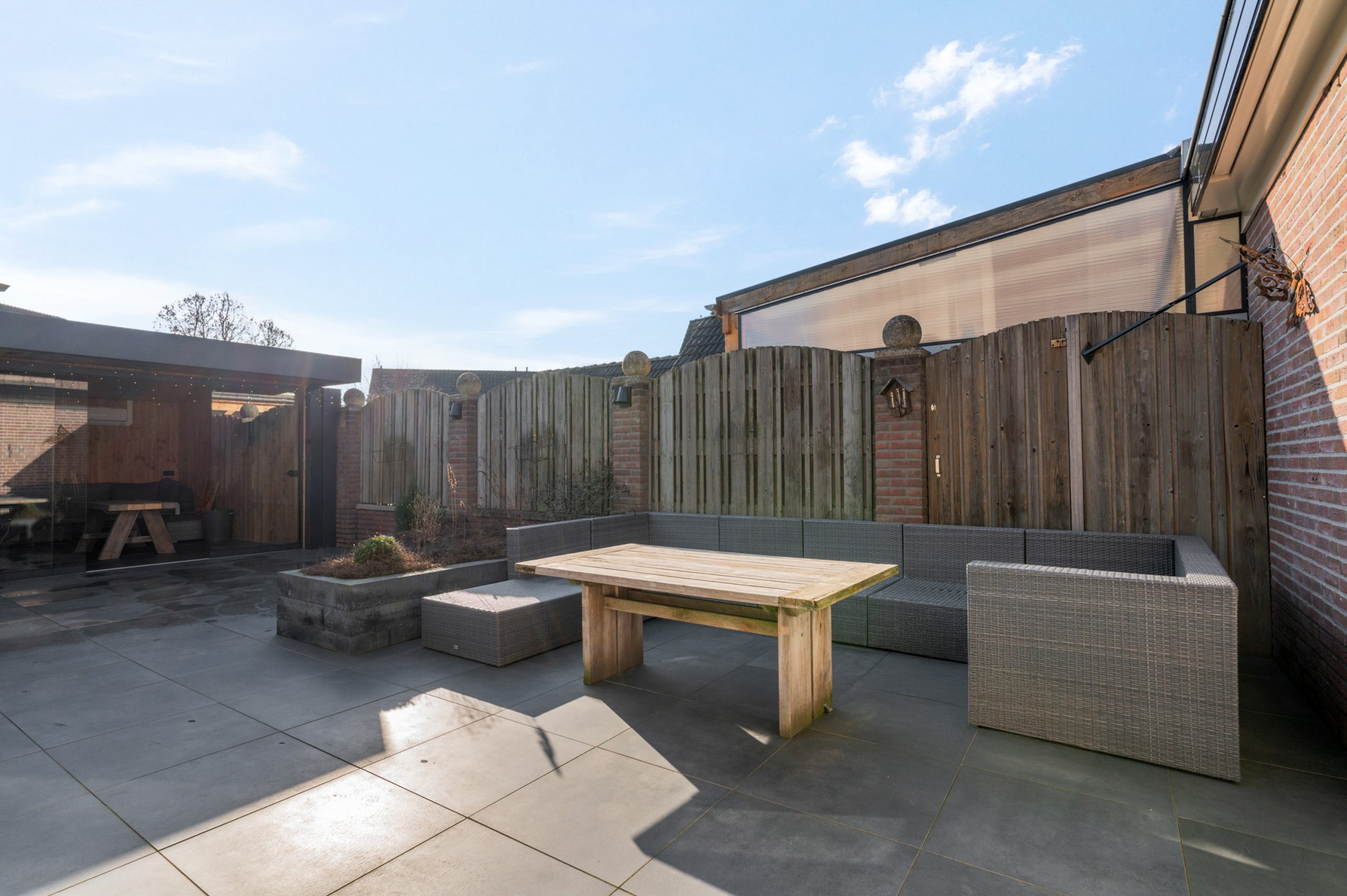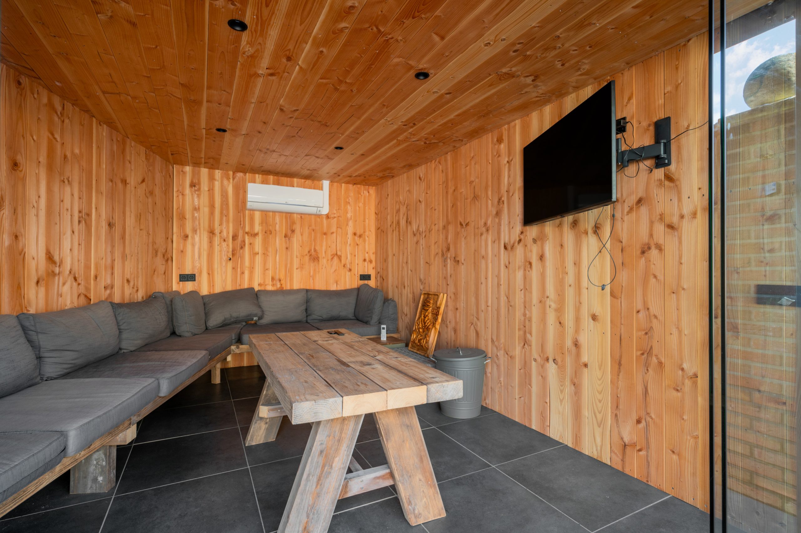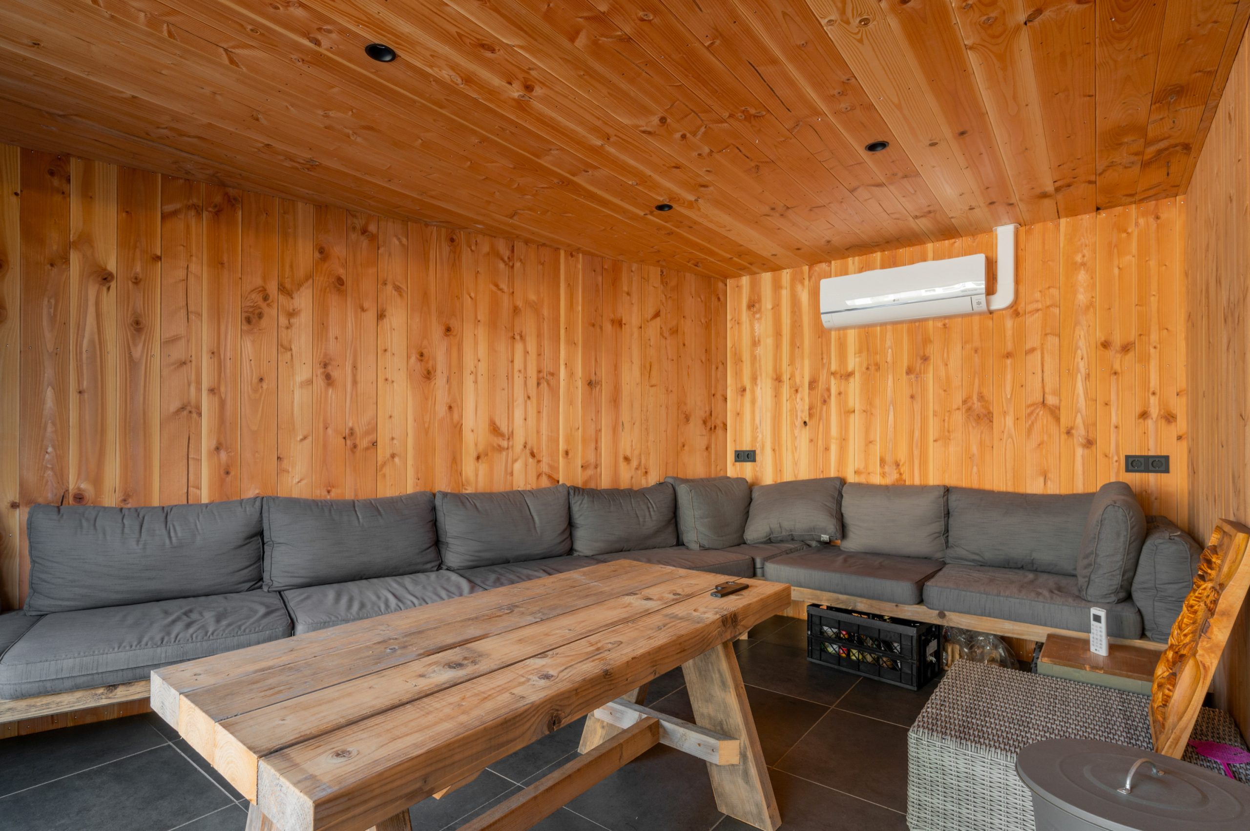De achtertuin is verzorgd aangelegd en biedt een heerlijke plek om te ontspannen. Dankzij het ruime terras is er volop ruimte voor een grote eettafel of loungehoek. Achterin de tuin bevindt zich een luxe veranda, volledig afgewerkt met houten wanden en voorzien van een televisieaansluiting en airconditioning. Dit maakt het een perfecte plek om het hele jaar door te genieten van gezellige avonden met familie of vrienden.