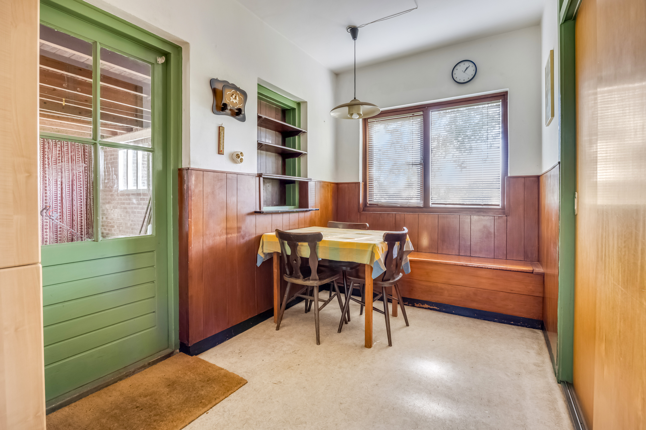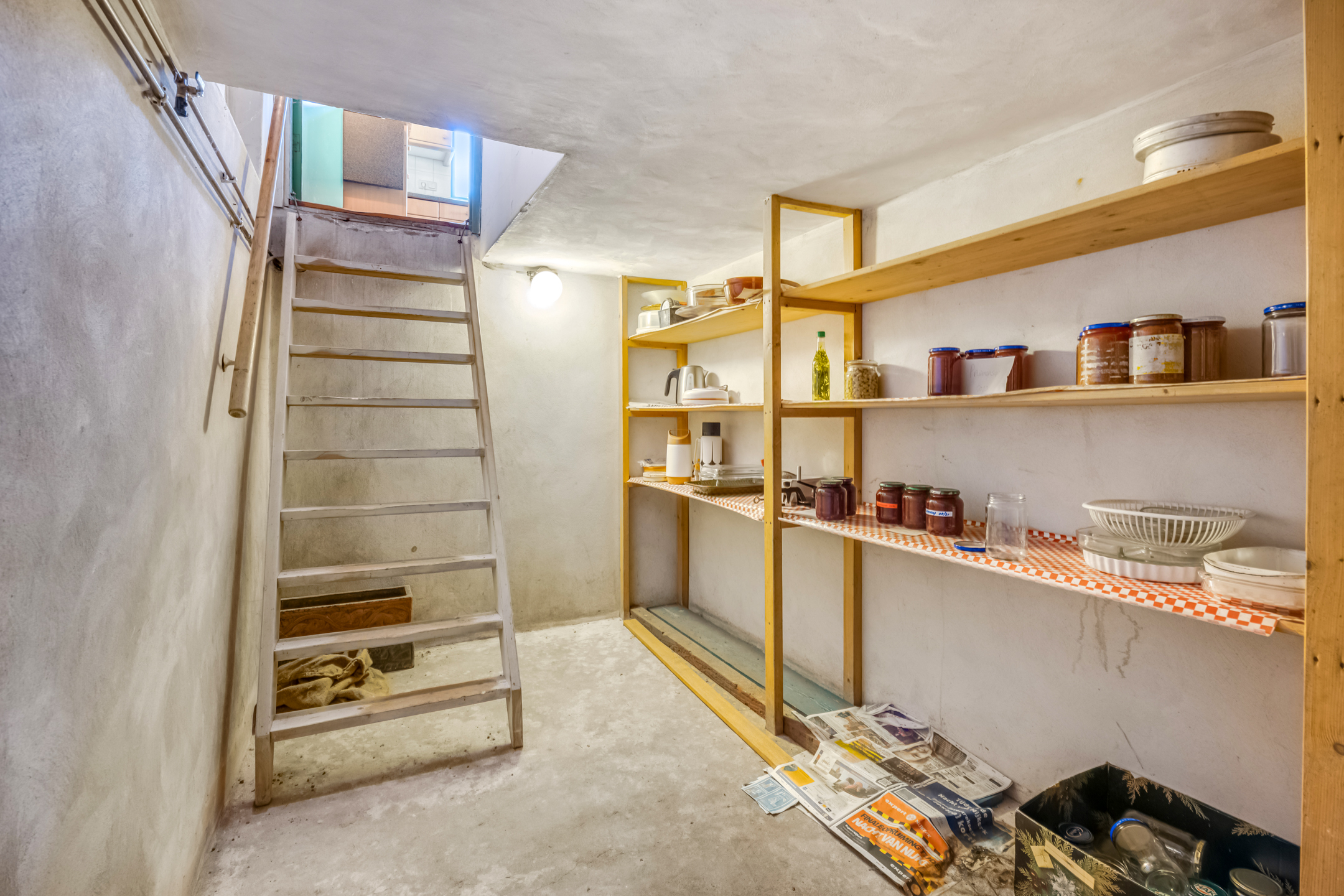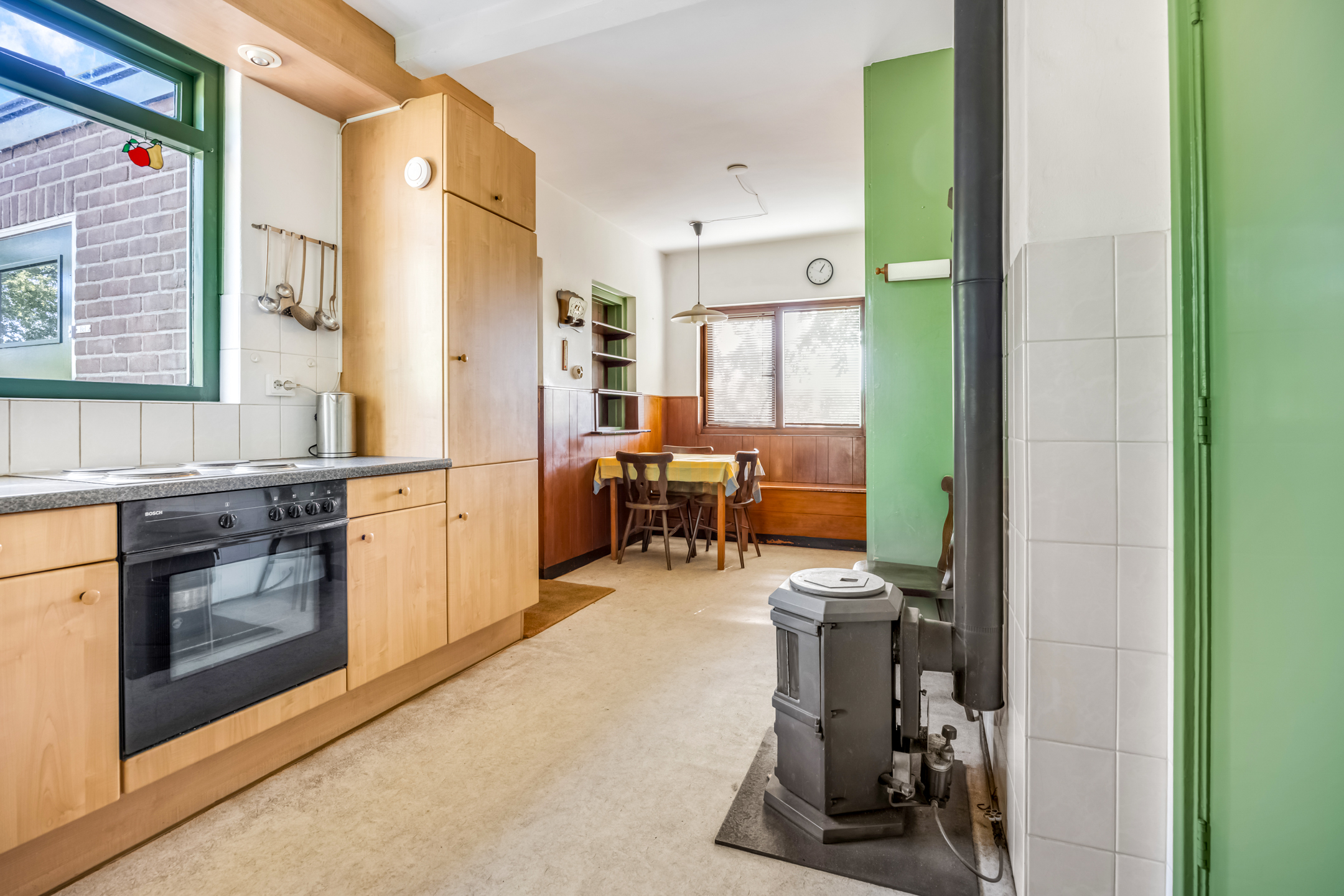 woonhuis is voorzien een keukenblok in hoekopstelling. Er is voldoende plaats voor een eethoek, vanwaar u zicht heeft op de tuin. Daarnaast is er een praktische provisiekelder, ideaal voor extra opslag, en een bijkeuken die de verbinding vormt tussen de woning en de aangebouwde schuur.