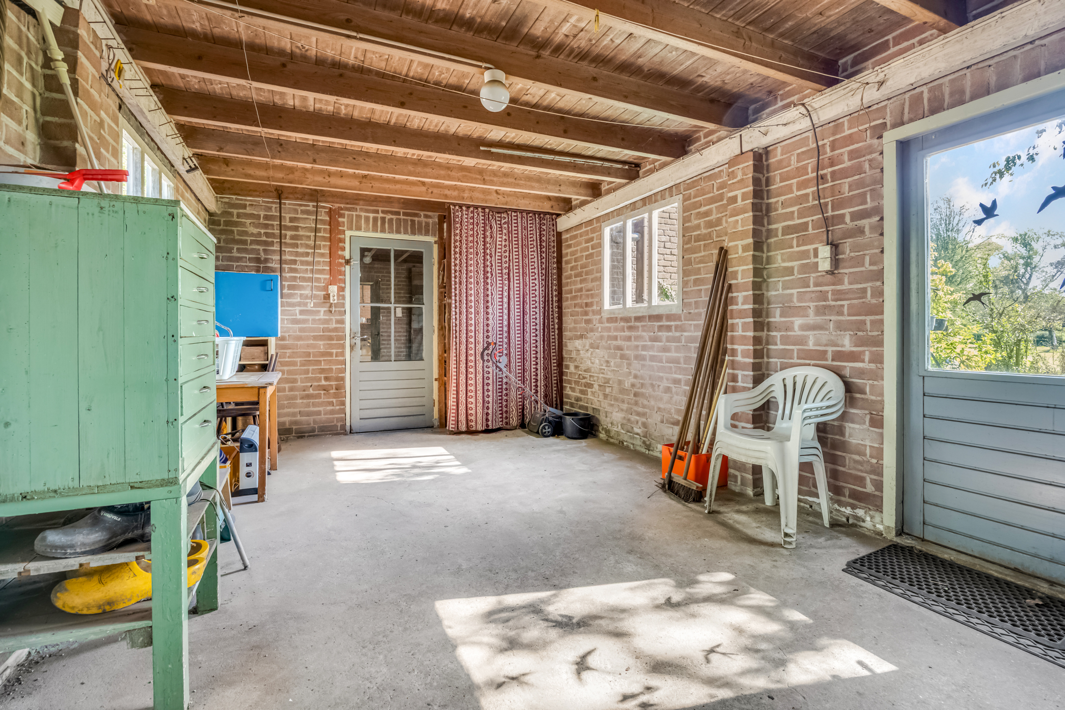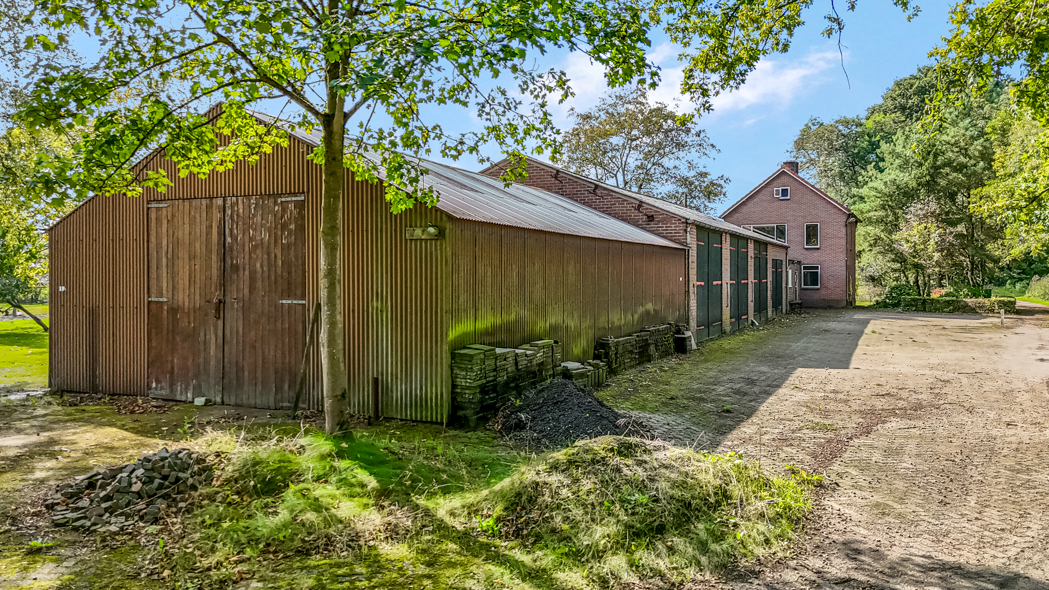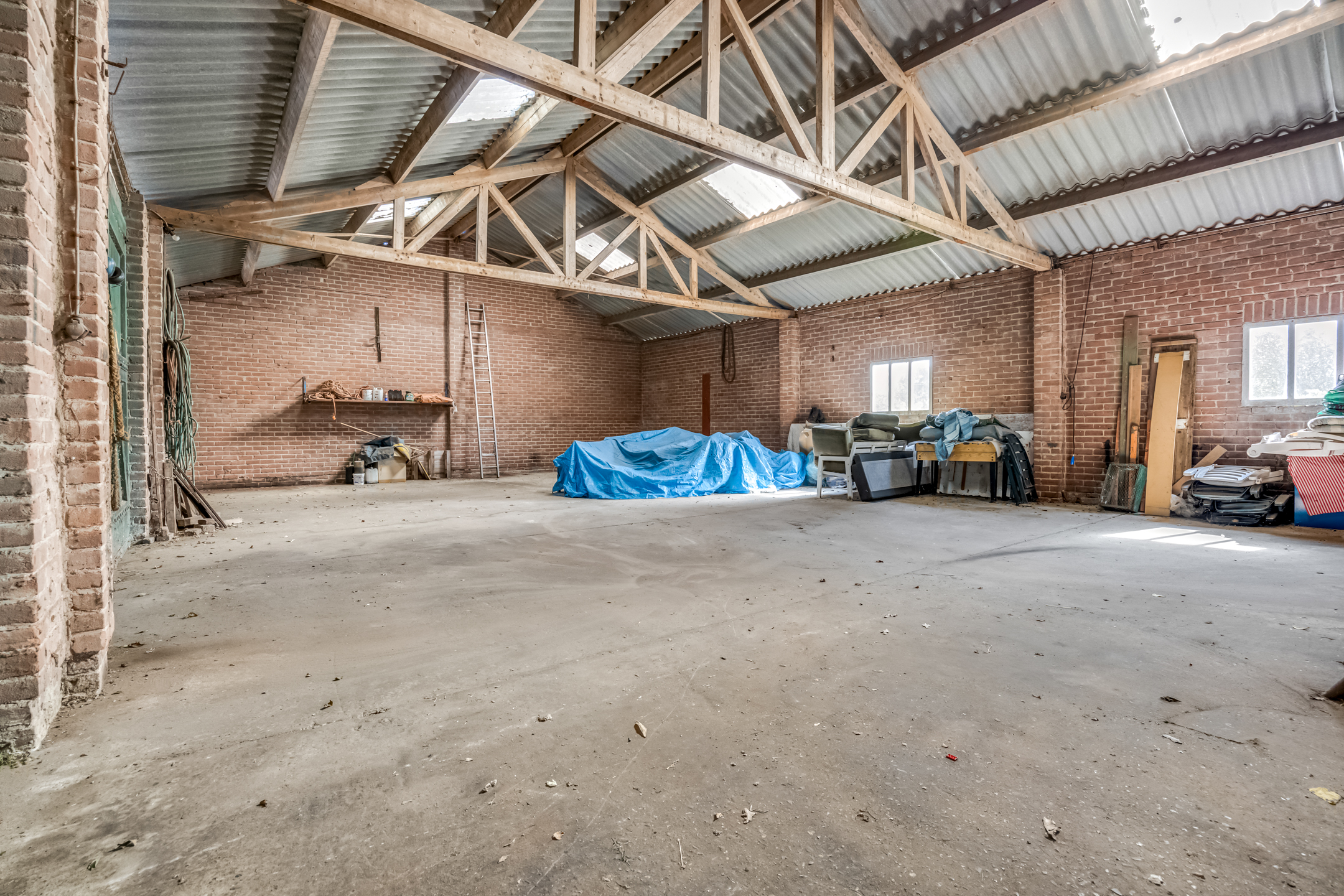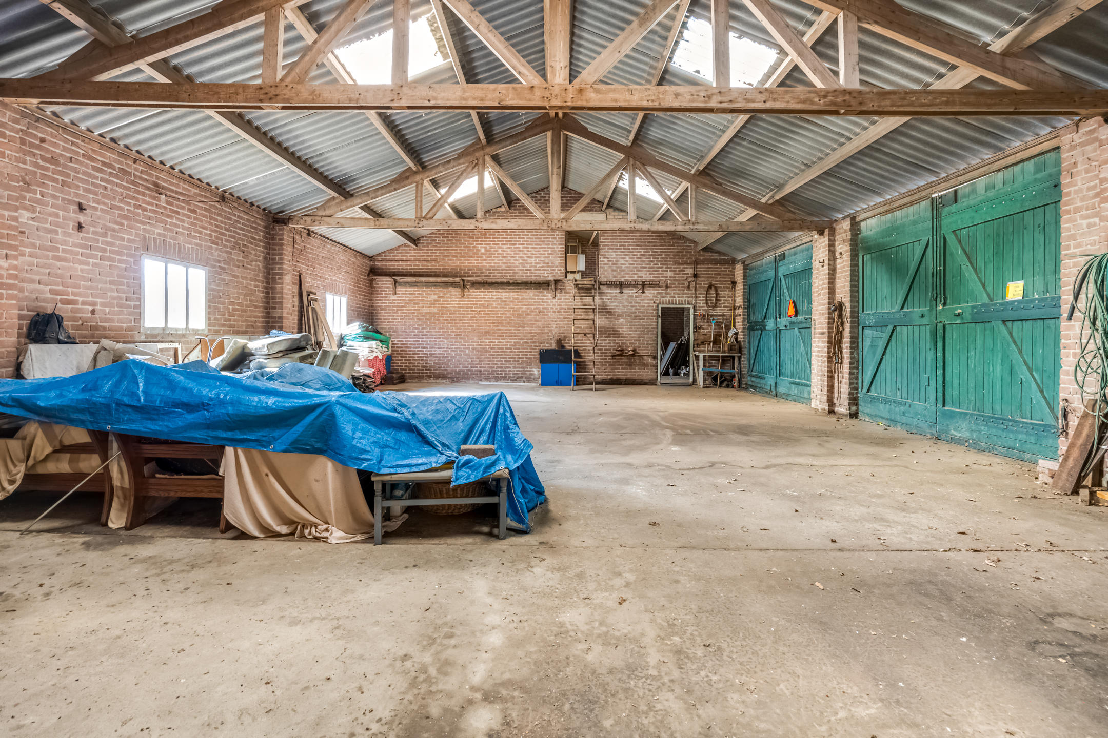 Vanuit de woning loopt u direct de aangebouwde berging met werkplaats in. Aangrenzend staat een royale loods van circa 200 m², opgetrokken uit steen met een prachtige houten spantenconstructie en voorzien van een betonvloer en grote openslaande deuren. De loods is gedekt met asbestvrije golfplaten en biedt diverse gebruiksmogelijkheden. Achter de loods is een niet-vergunde overkapping gerealiseerd, opgetrokken in blik met eveneens openslaande deuren.