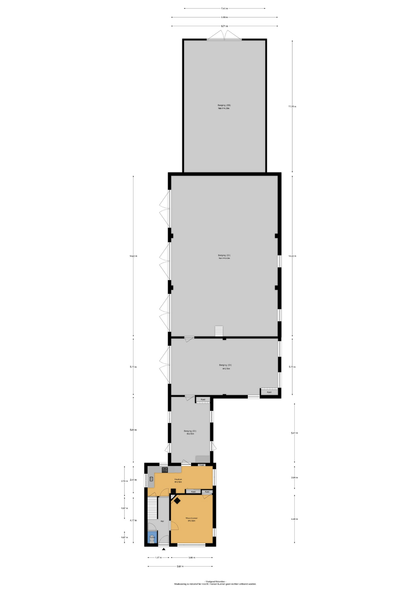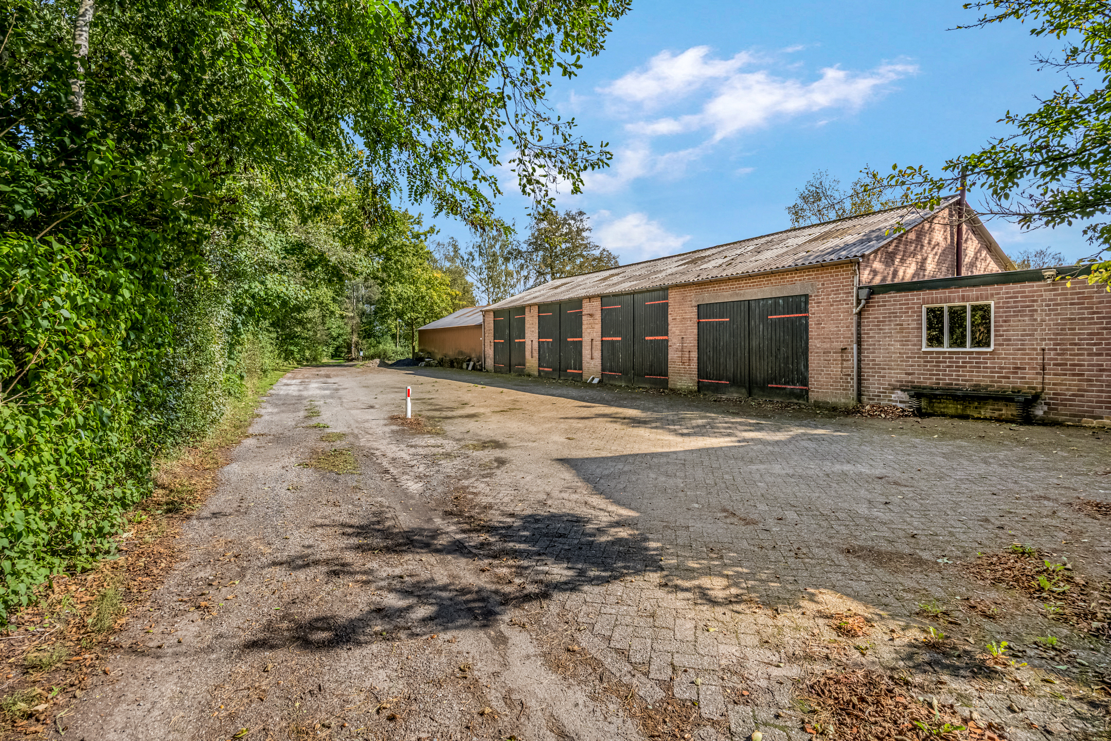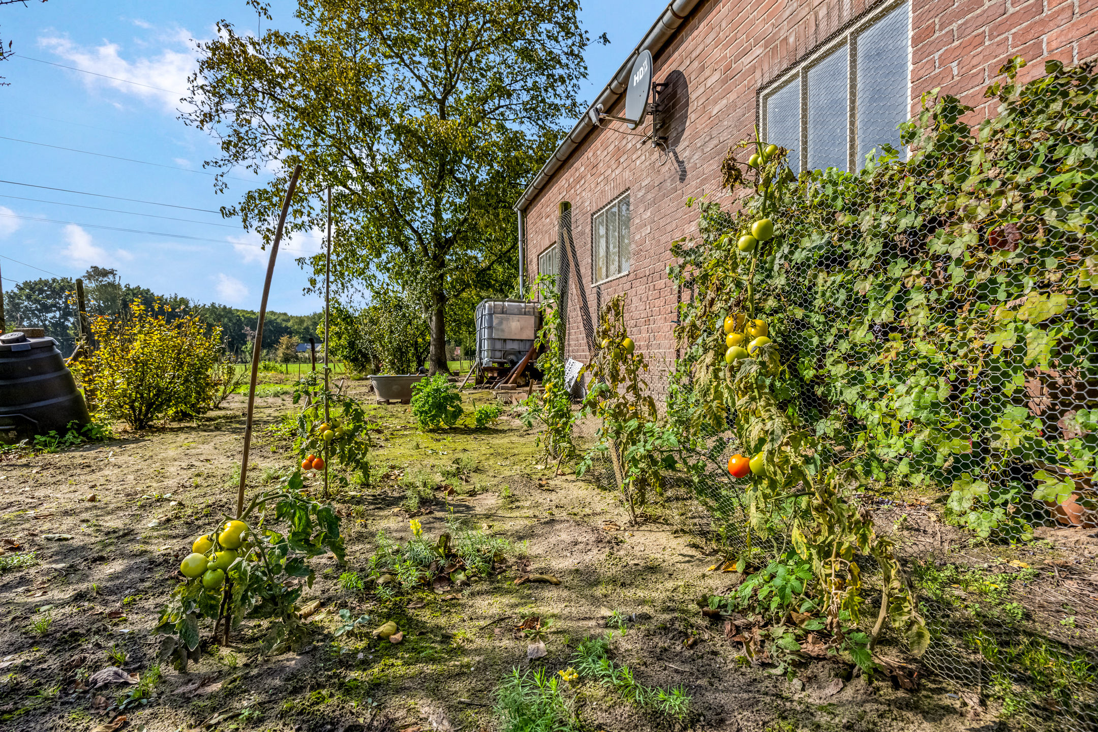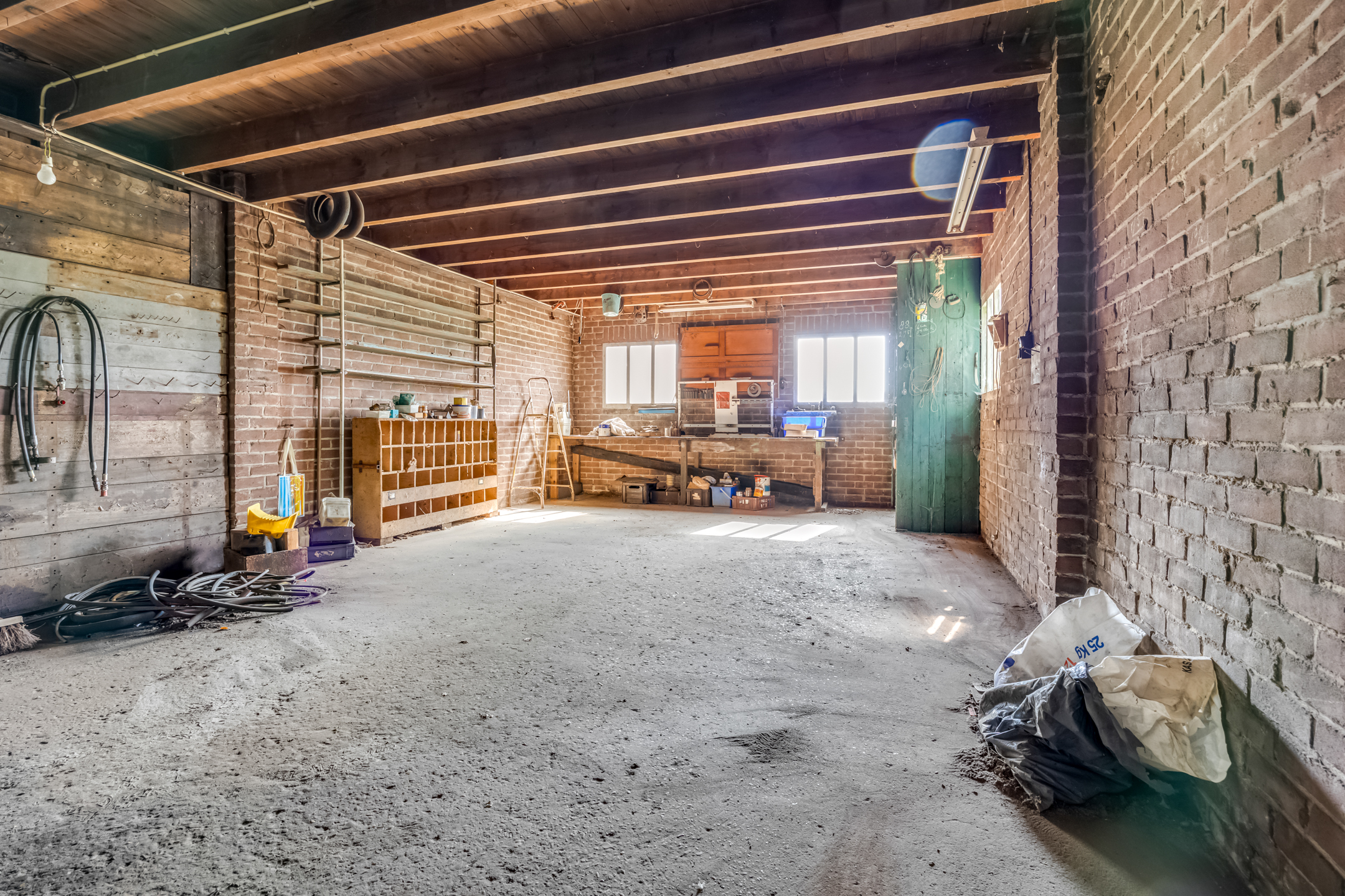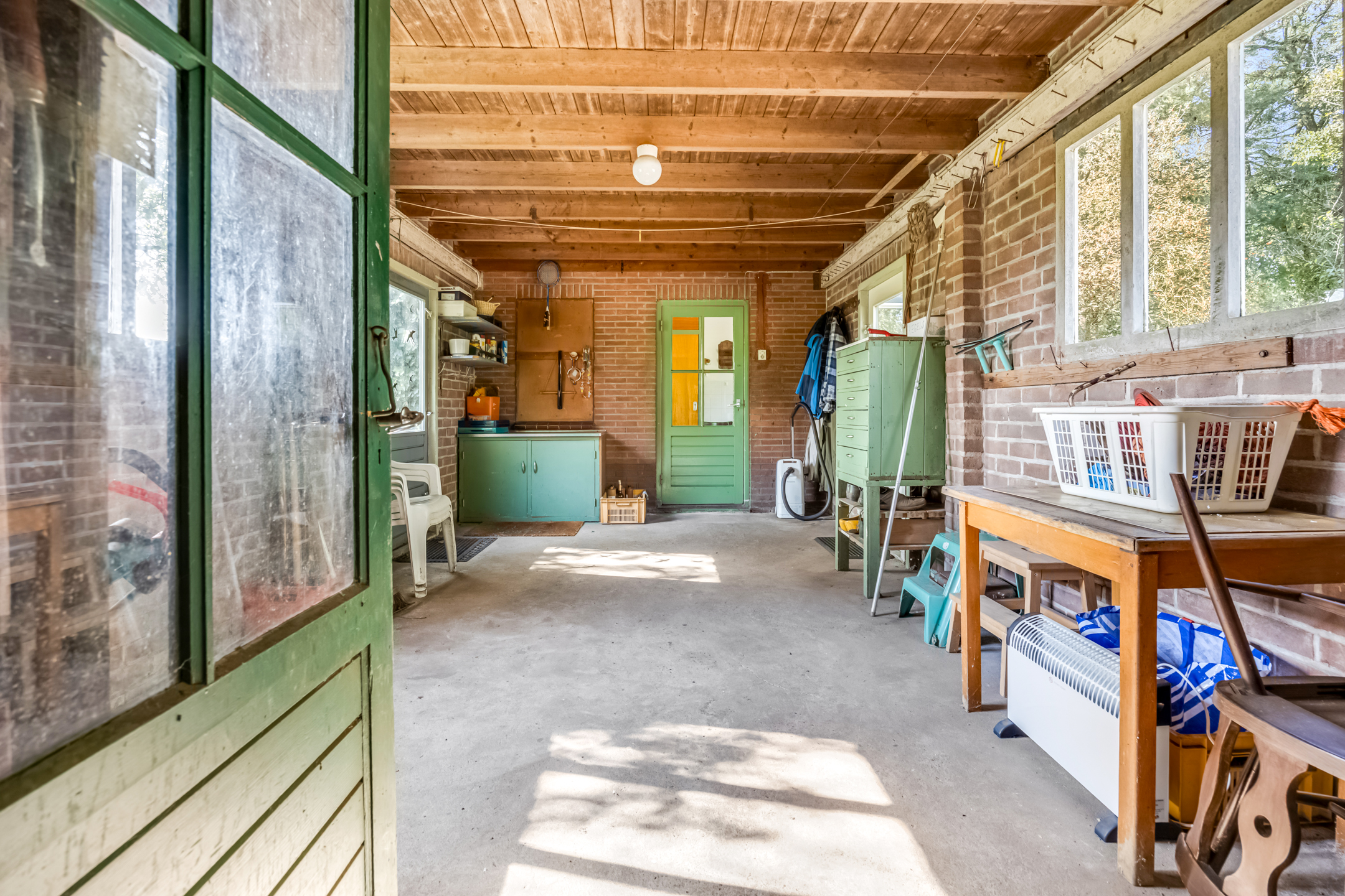 Vanuit de woning loopt u direct de aangebouwde berging met werkplaats in. Aangrenzend staat een royale loods van circa 200 m², opgetrokken uit steen met een prachtige houten spantenconstructie en voorzien van een betonvloer en grote openslaande deuren. De loods is gedekt met asbestvrije golfplaten en biedt diverse gebruiksmogelijkheden. Achter de loods is een niet-vergunde overkapping gerealiseerd, opgetrokken in blik met eveneens openslaande deuren.
