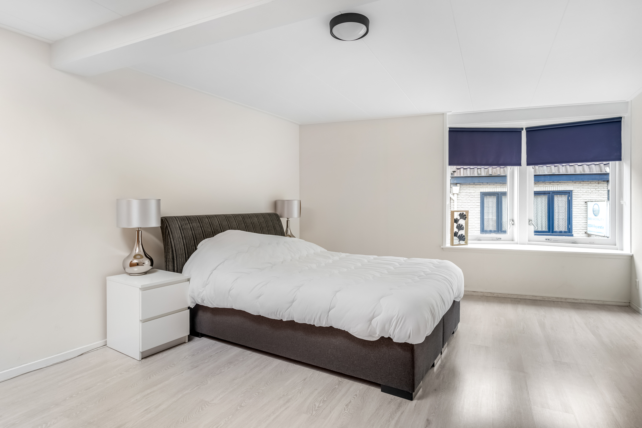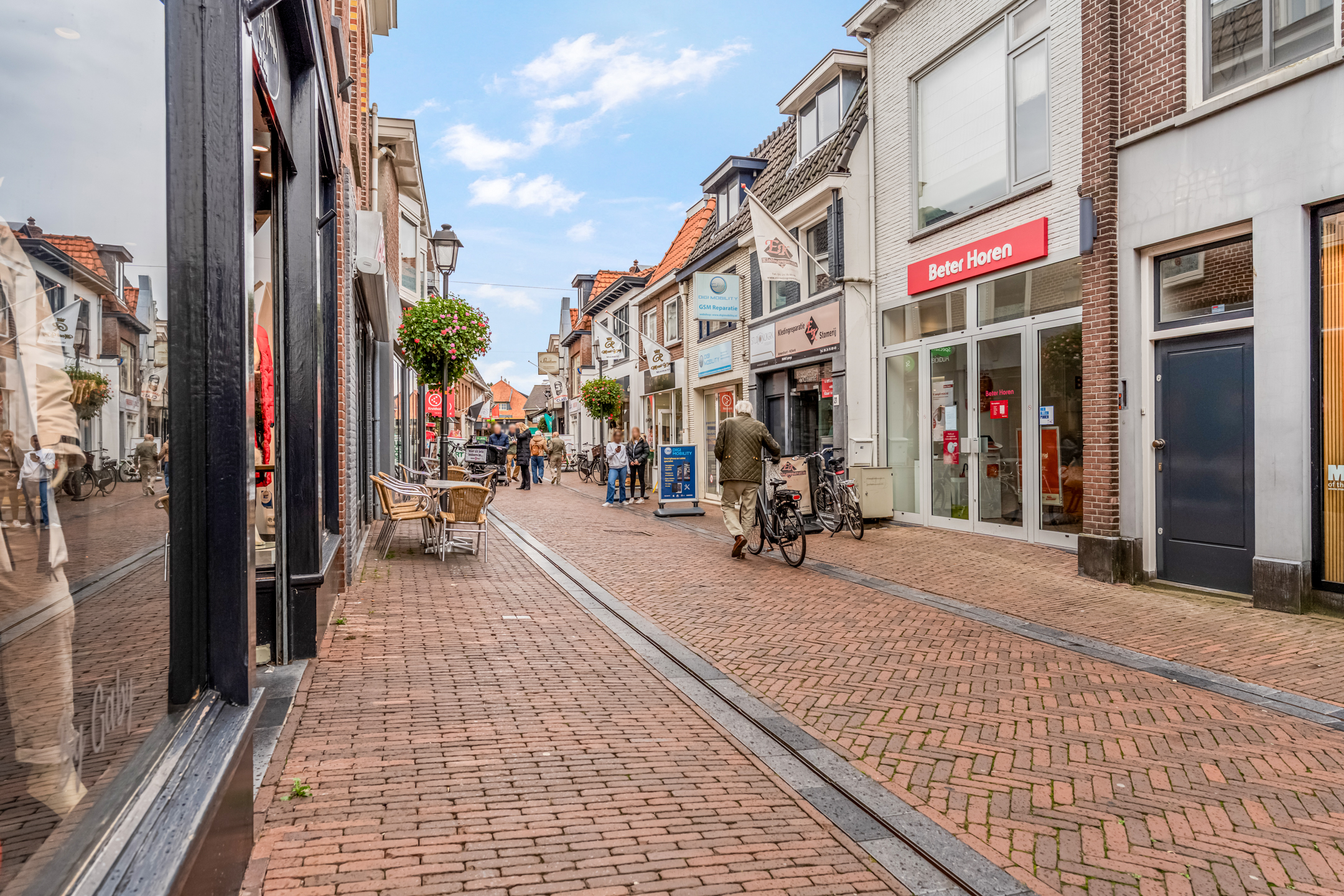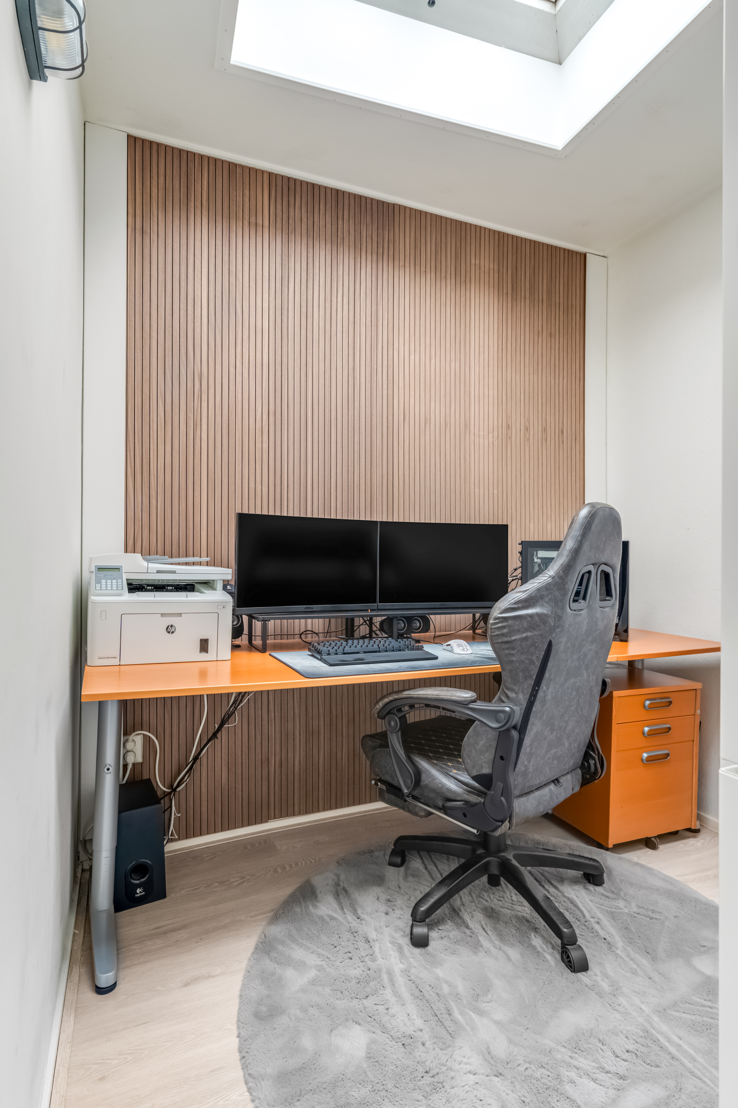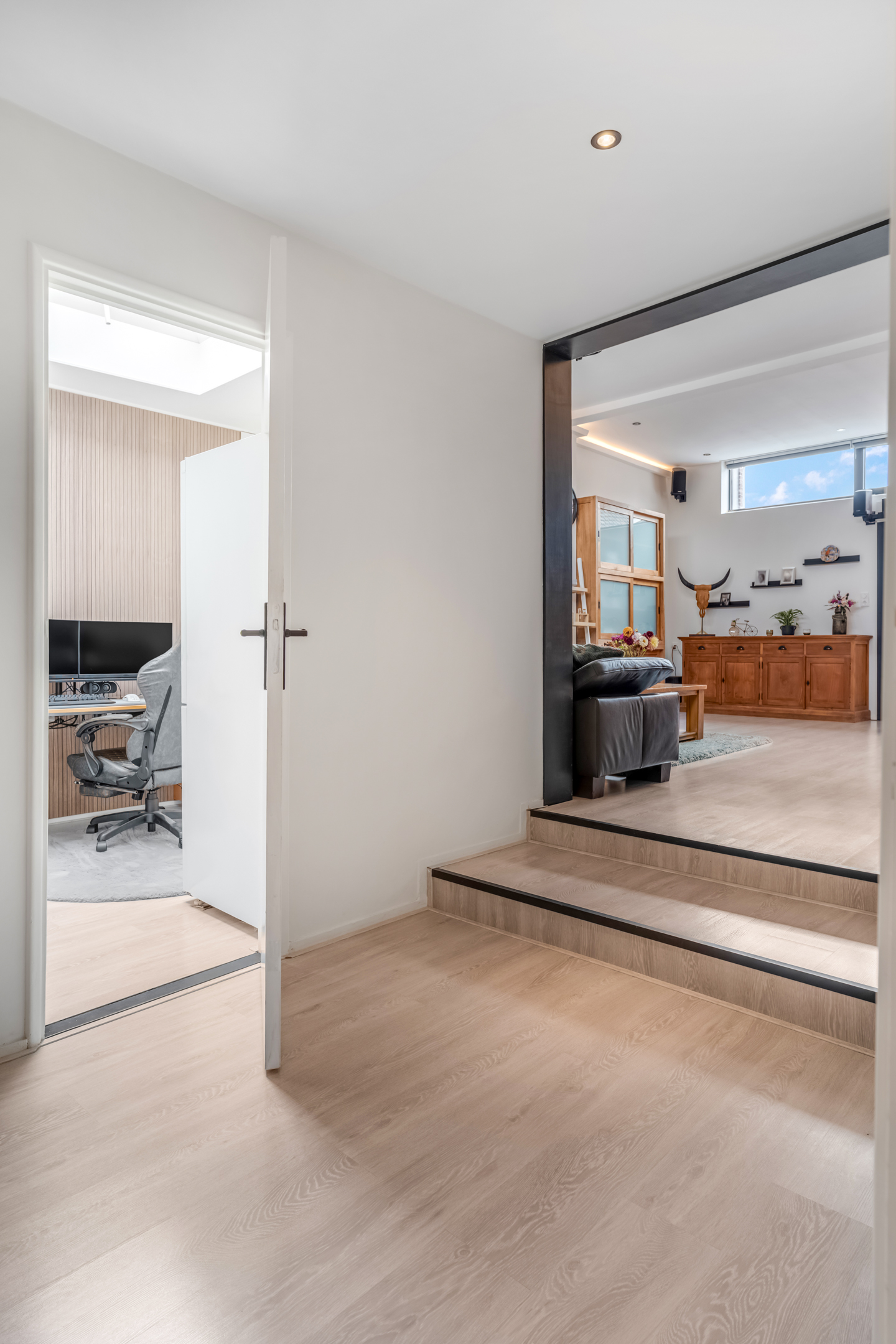 Op de eerste verdieping stap je binnen in een ruime hal die toegang biedt tot alle vertrekken. Hier vind je onder andere de meterkast en een aparte berging met aansluitingen voor wasapparatuur. Via een klein opstapje bereik je de lichte woonkamer, die dankzij hooggeplaatste ramen aan twee zijden baadt in daglicht. Extra comfort in alle seizoenen? De woonkamer is voorzien van een airco-unit, waardoor het hier ook op warme dagen heerlijk koel blijft. Deze lichte leefruimte staat in open verbinding met de voorgelegen slaapkamer, die uitkijkt op de winkelstraat en voorzien is van een lichtkoepel voor extra daglicht. Daarnaast is er een aparte kamer die ideaal dienstdoet als kantoor, werkplek of hobbyruimte, perfect voor wie thuiswerkt of gewoon graag wat extra ruimte heeft.