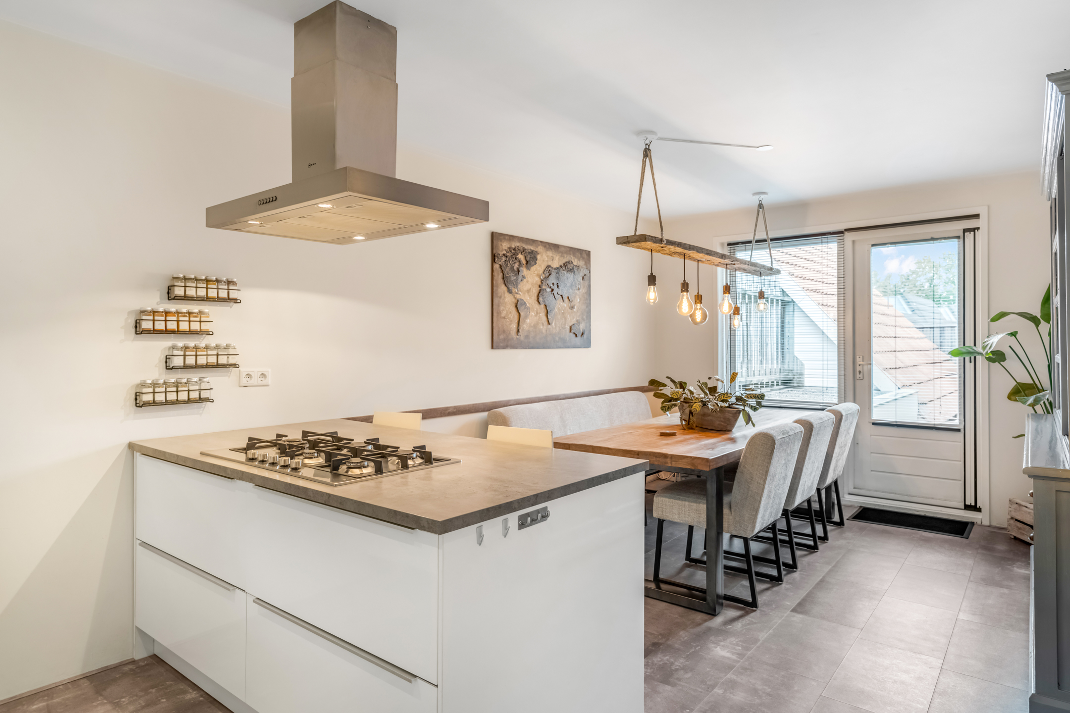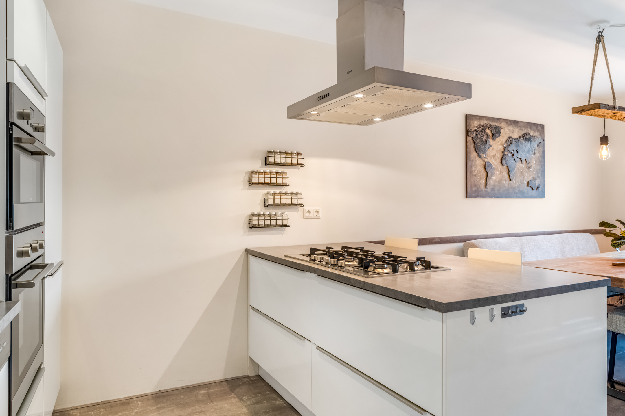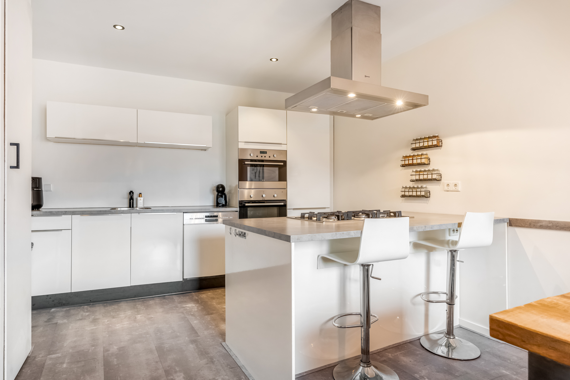 De keuken is compleet uitgerust met inbouwapparatuur, waaronder een gaskookplaat, afzuigkap, spoelbak, vaatwasser, koelkast, vriezer en oven. Het kookschiereiland met bar nodigt uit tot gezelligheid, perfect voor een hapje of drankje terwijl je kookt. En vanuit de keuken stap je zó het ruime, zonnige dakterras op!