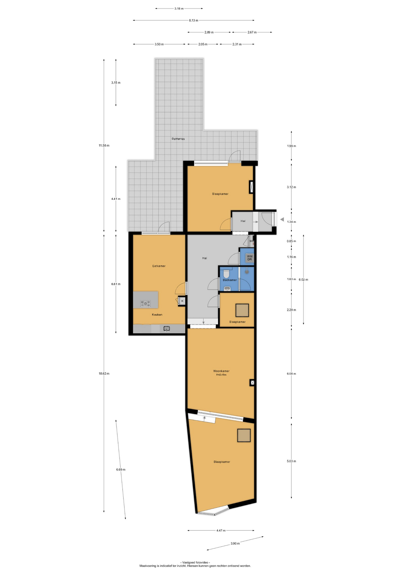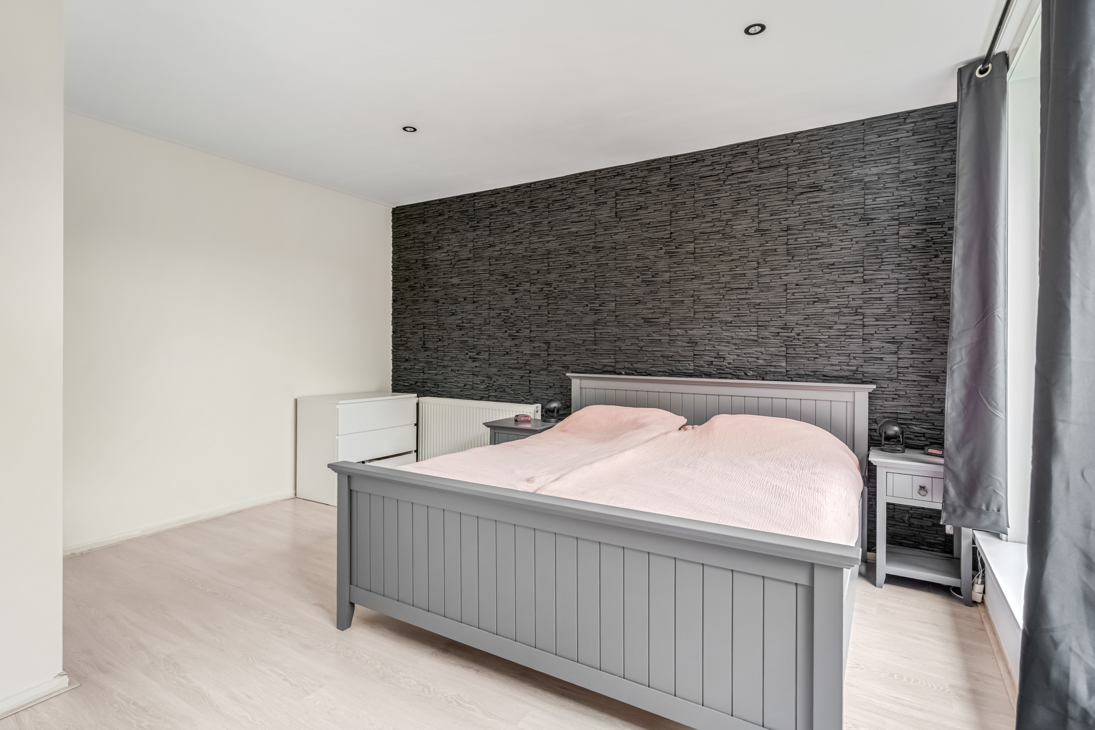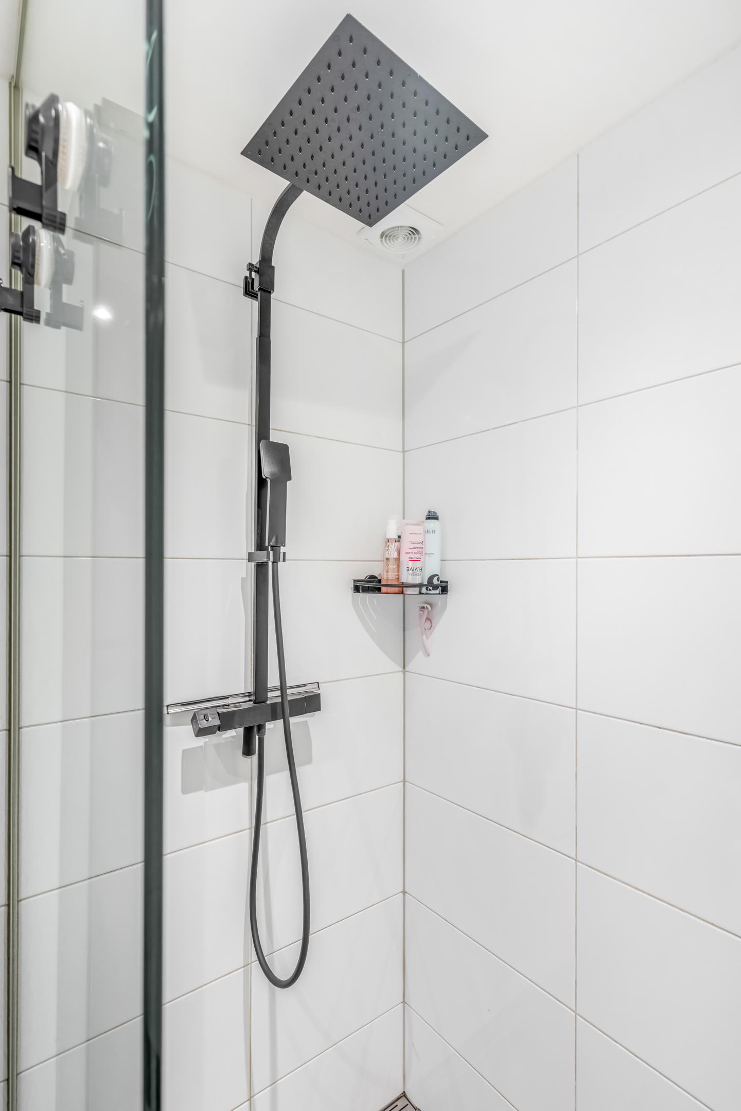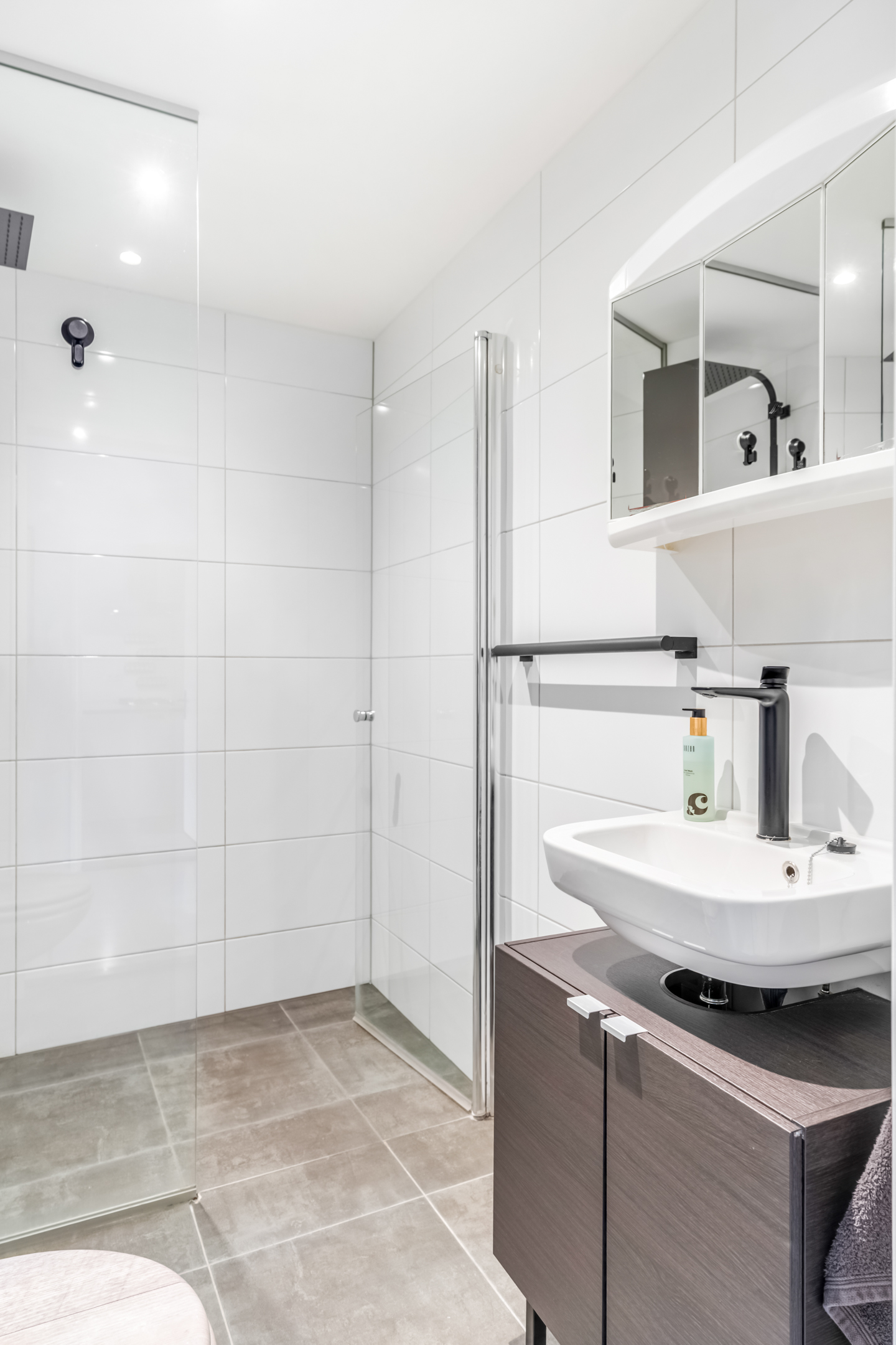 De badkamer is strak en modern afgewerkt met lichte wandtegels en een donkere tegelvloer. Hier vind je een inloopdouche, wastafel en een toilet. De tweede slaapkamer, aan de rustige achterzijde van het appartement, is royaal van formaat en biedt via een deur directe toegang tot het dakterras, waar een overkapping is gerealiseerd.