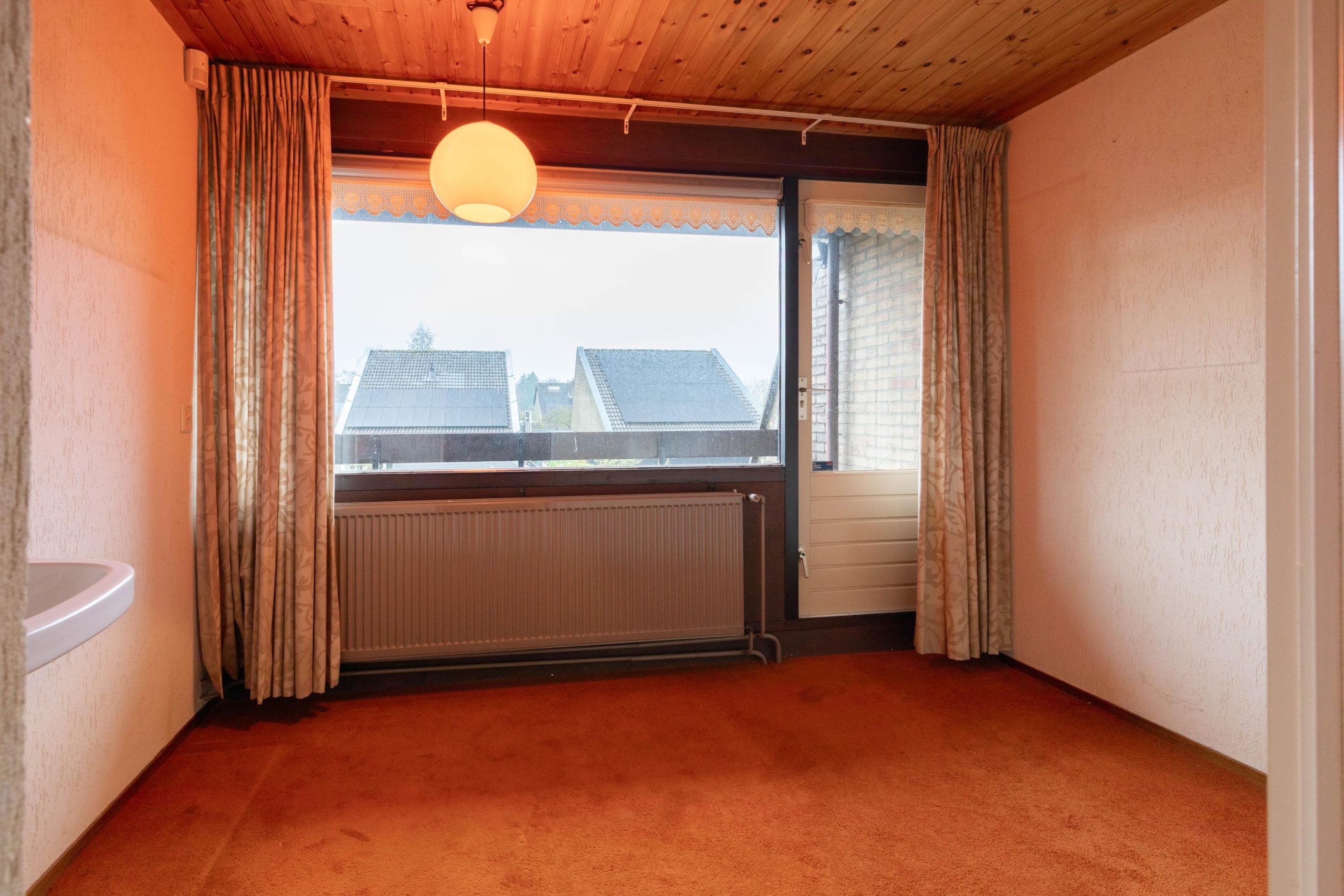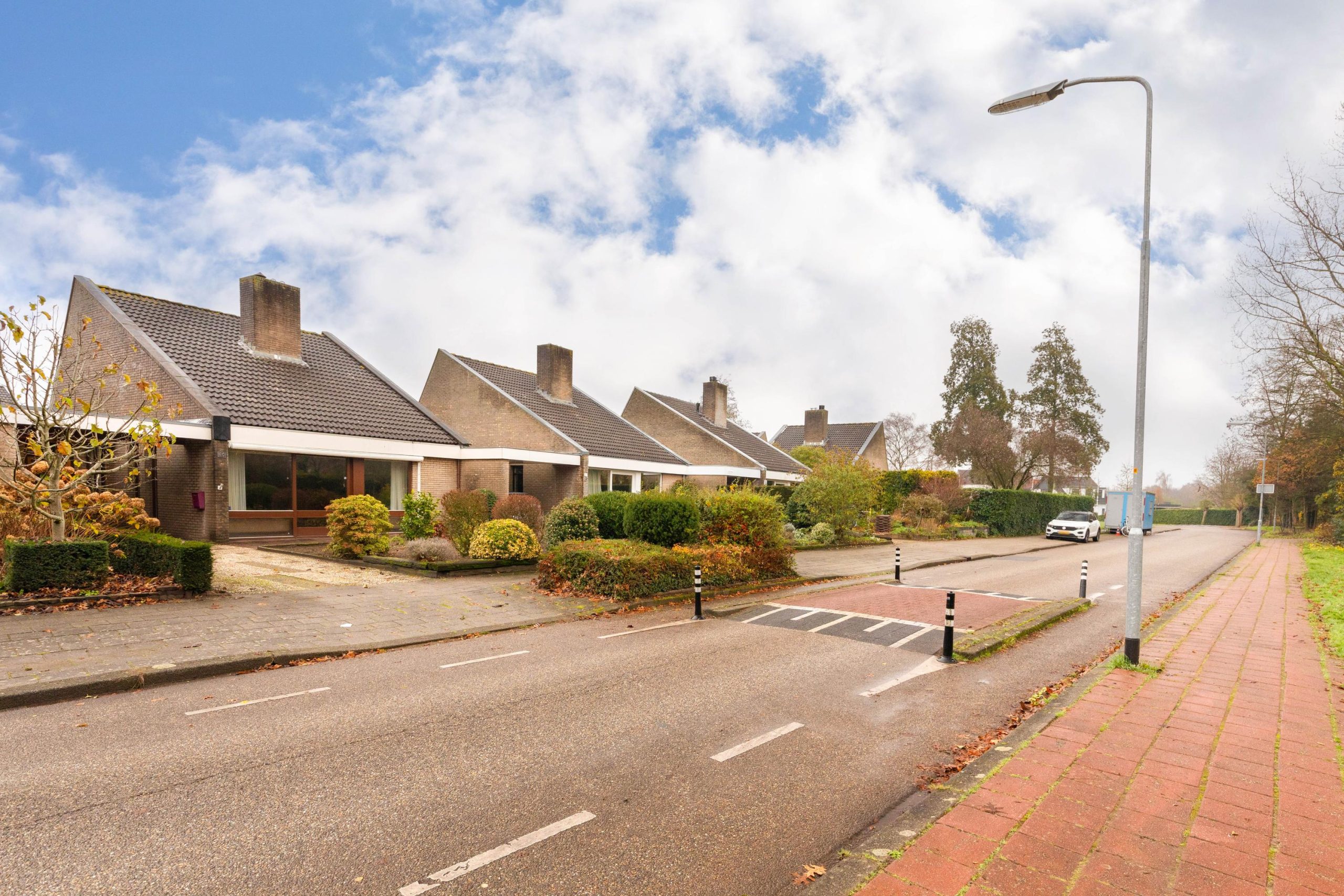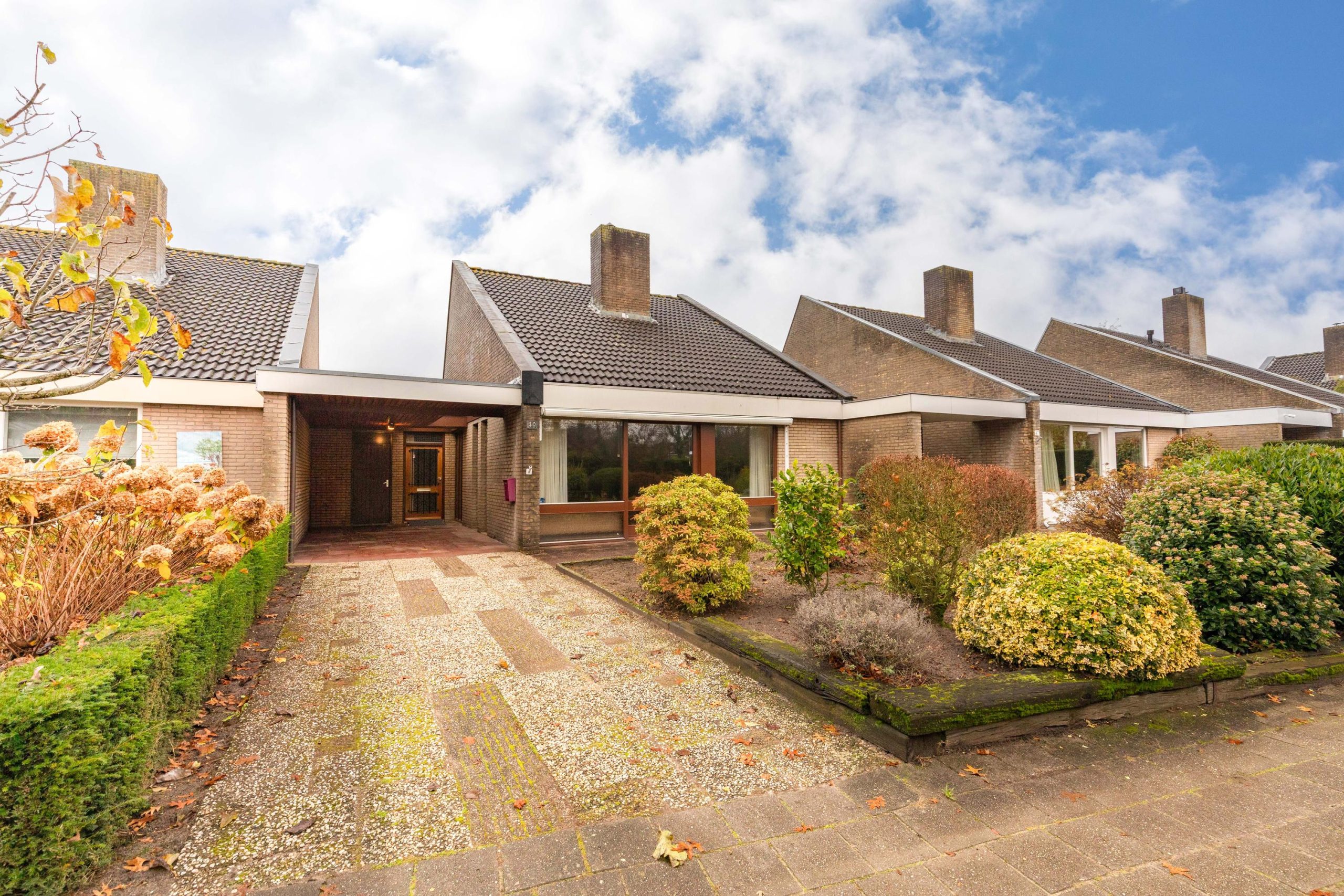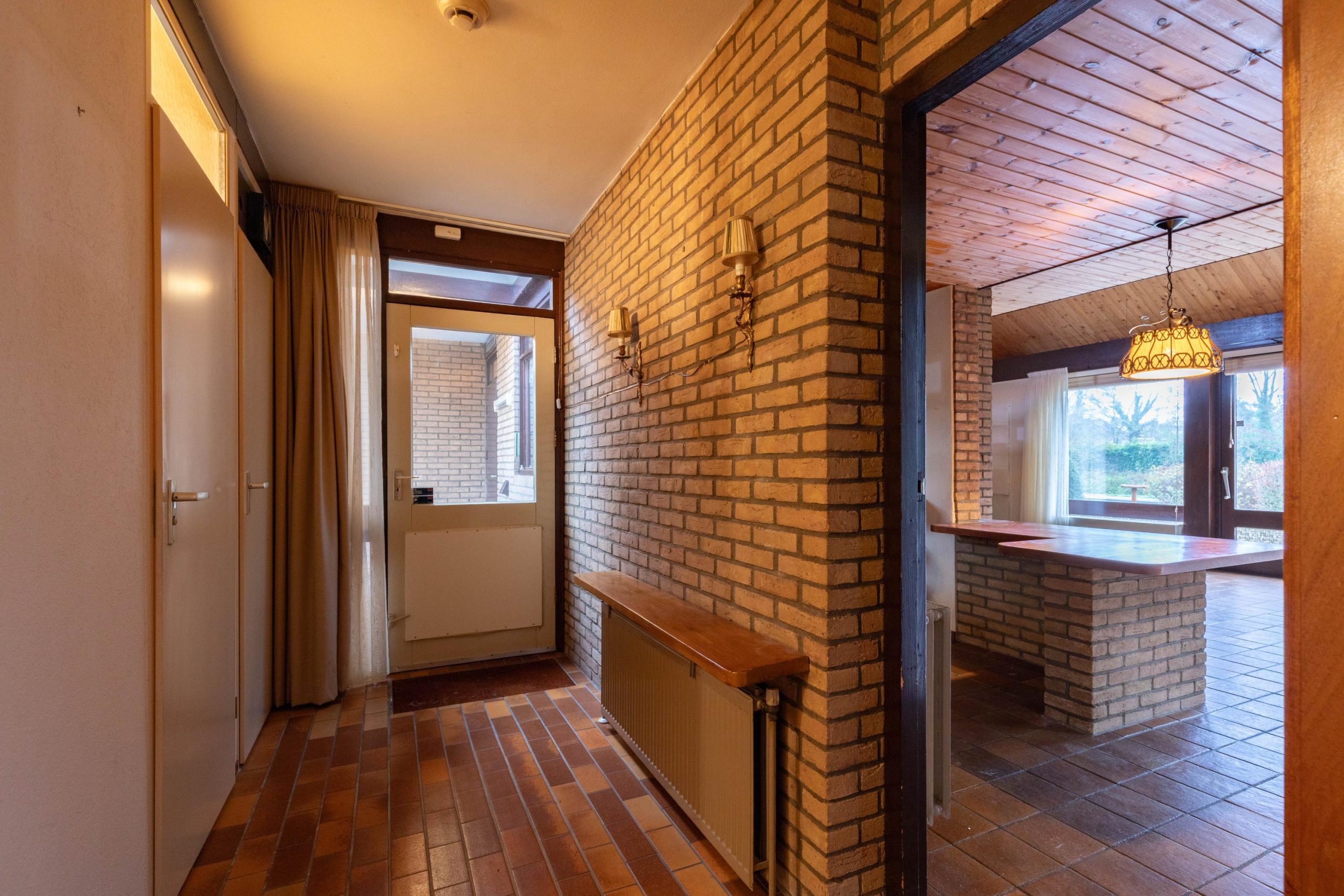 Via de eigen oprit, met ruimte voor twee auto’s en een overdekte entree loop je de woning binnen. In de hal vind je het separate toilet en toegang tot verschillende ruimtes. Aan de voorzijde bevindt zich de lichte woonkamer, waar de schuifpui voor een verbinding met buiten zorgt. De open haard geeft een fijne warmte en door de vide voelt de ruimte extra hoog en open. Aangrenzend ligt de open keuken, praktisch ingedeeld en met zicht op de woonkamer. Loop je verder, dan kom je in de bijkeuken, een ideale plek voor extra opslag en de wasmachine. Via de hal kom je bij de twee slaapkamers en de badkamer. De badkamer ligt centraal en biedt een goede basis om te moderniseren.