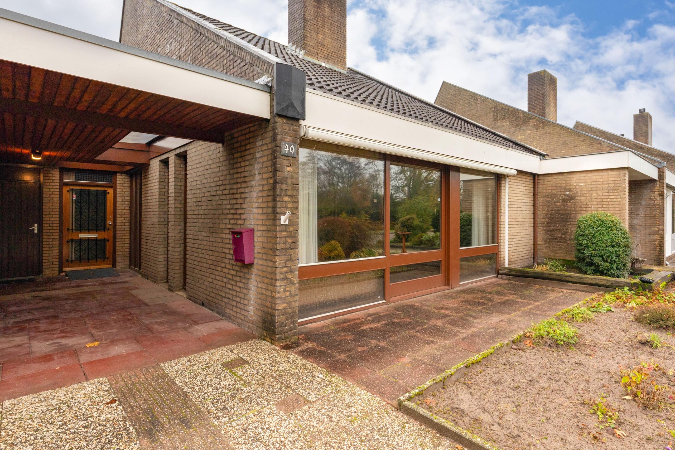 Tuin: Achter de woning ligt een royale, diepe tuin met een overkapping die direct aan het huis is geplaatst, een fijne plek om beschut buiten te zitten, ongeacht het weer. Ook aan de voorzijde is een overkapping aanwezig. De oprit biedt plaats aan meerdere auto’s, die dankzij de overkapping aan de voorzijde deels beschut kunnen staan.
