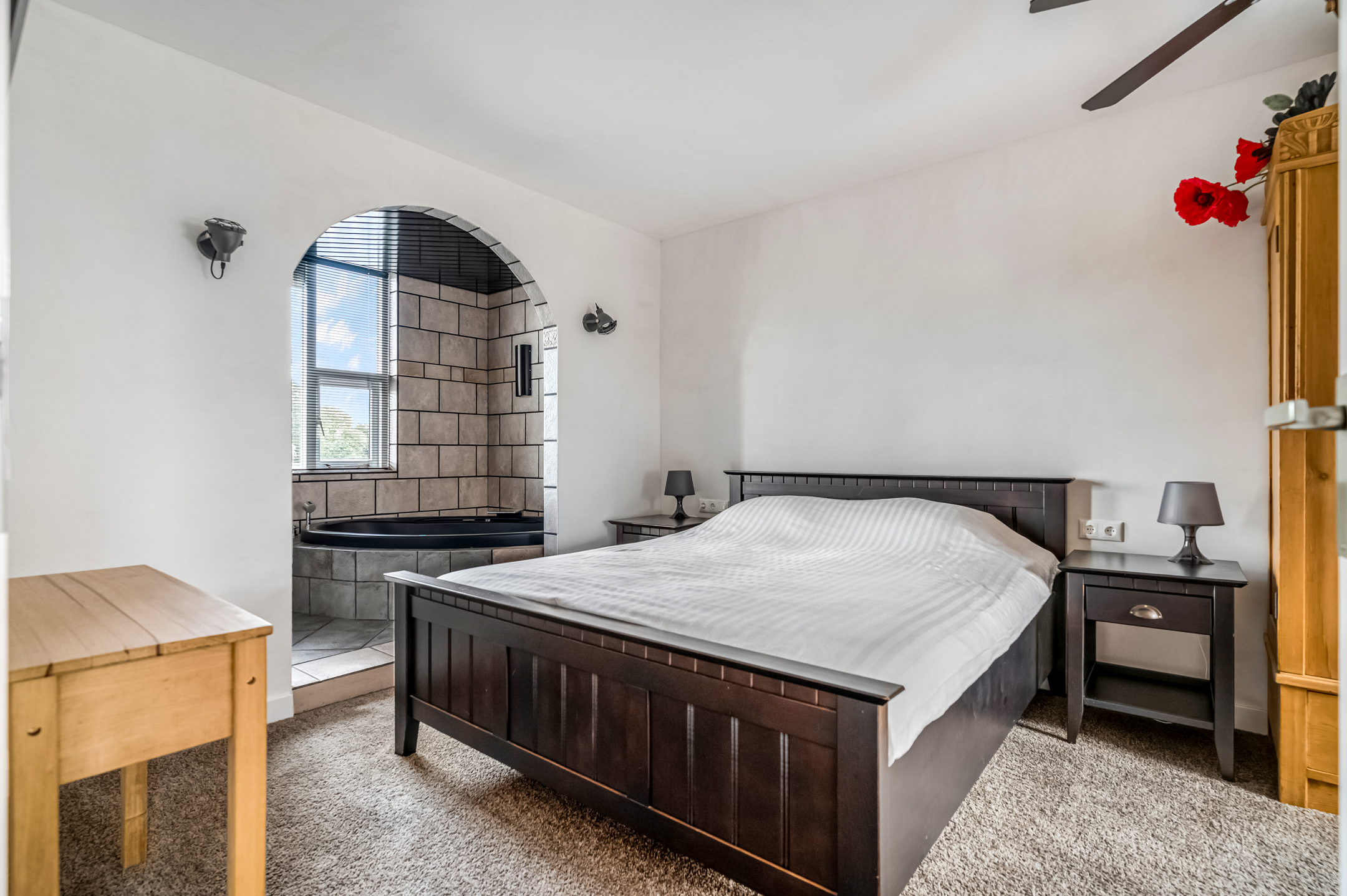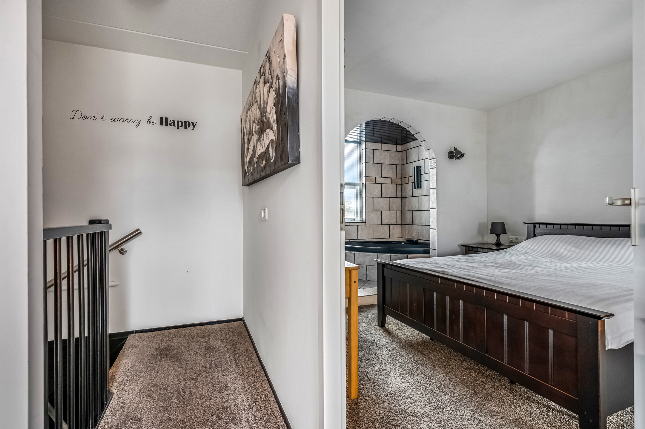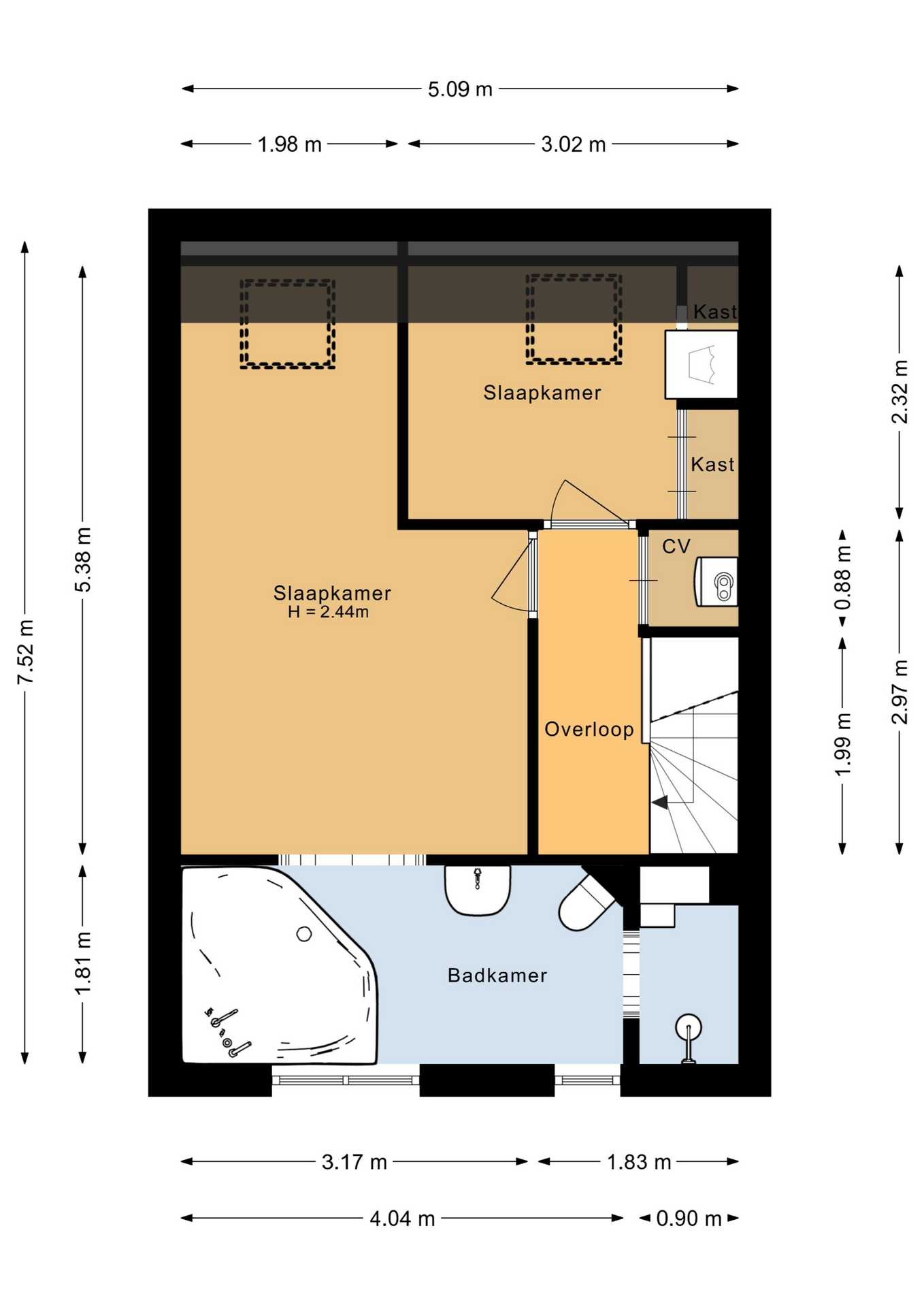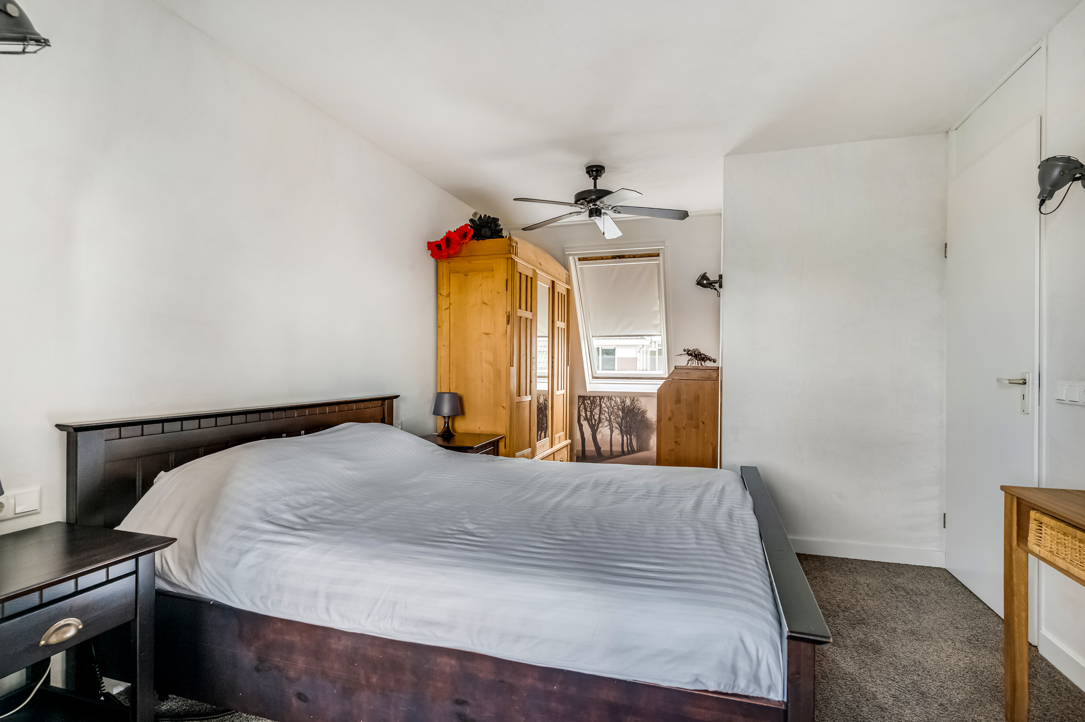 Op de verdieping vind je twee slaapkamers, waarvan de grootste toegang geeft tot de ruime badkamer aan de achterzijde. De badkamer is keurig verzorgd en heeft een ligbad (bubbel), douchehoek, wastafel en toilet. De badkamer beschikt tevens over elektrische vloerverwarming. De andere slaapkamer heeft een dakvenster en beschikt over witgoedaansluitingen.