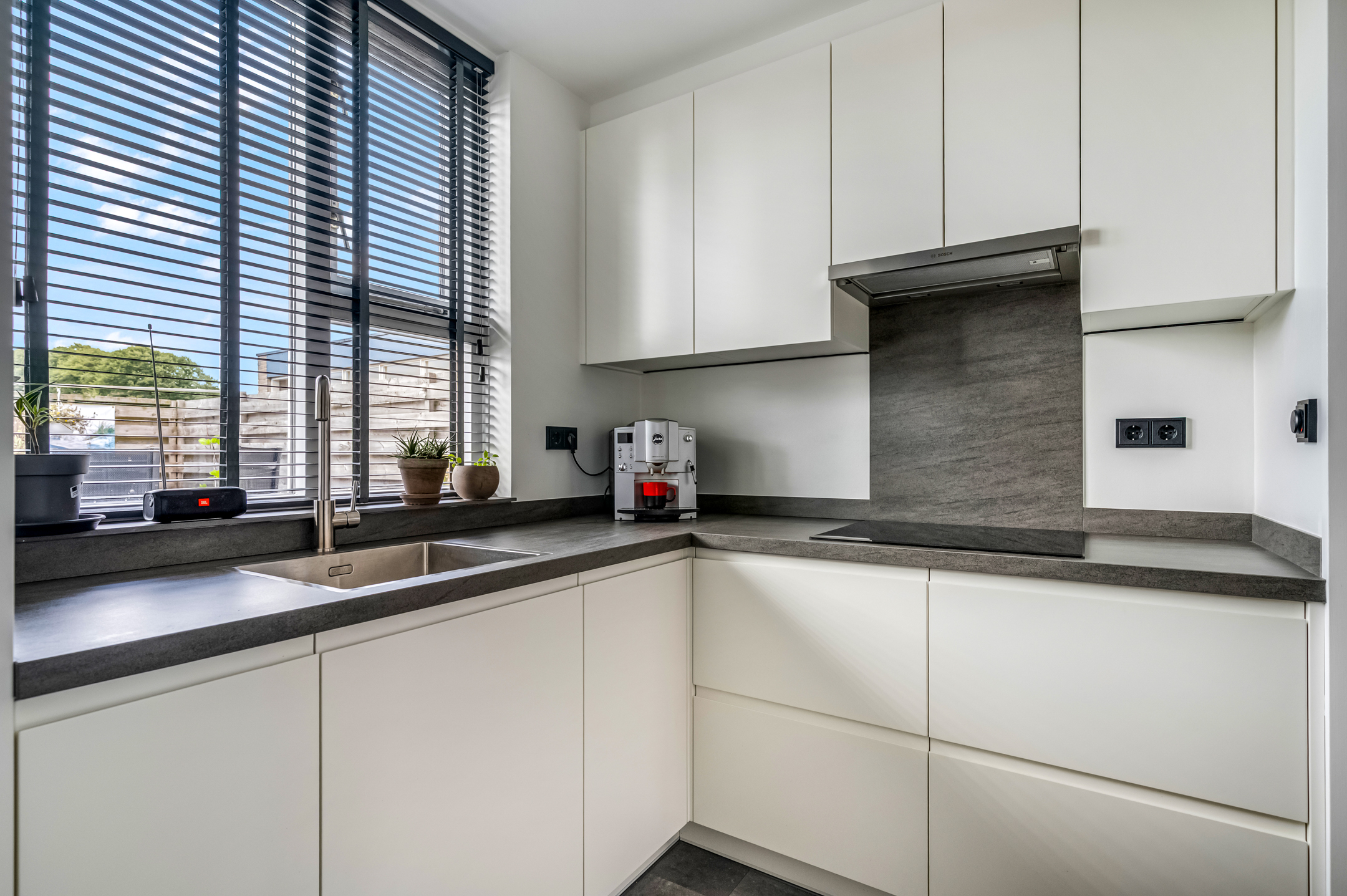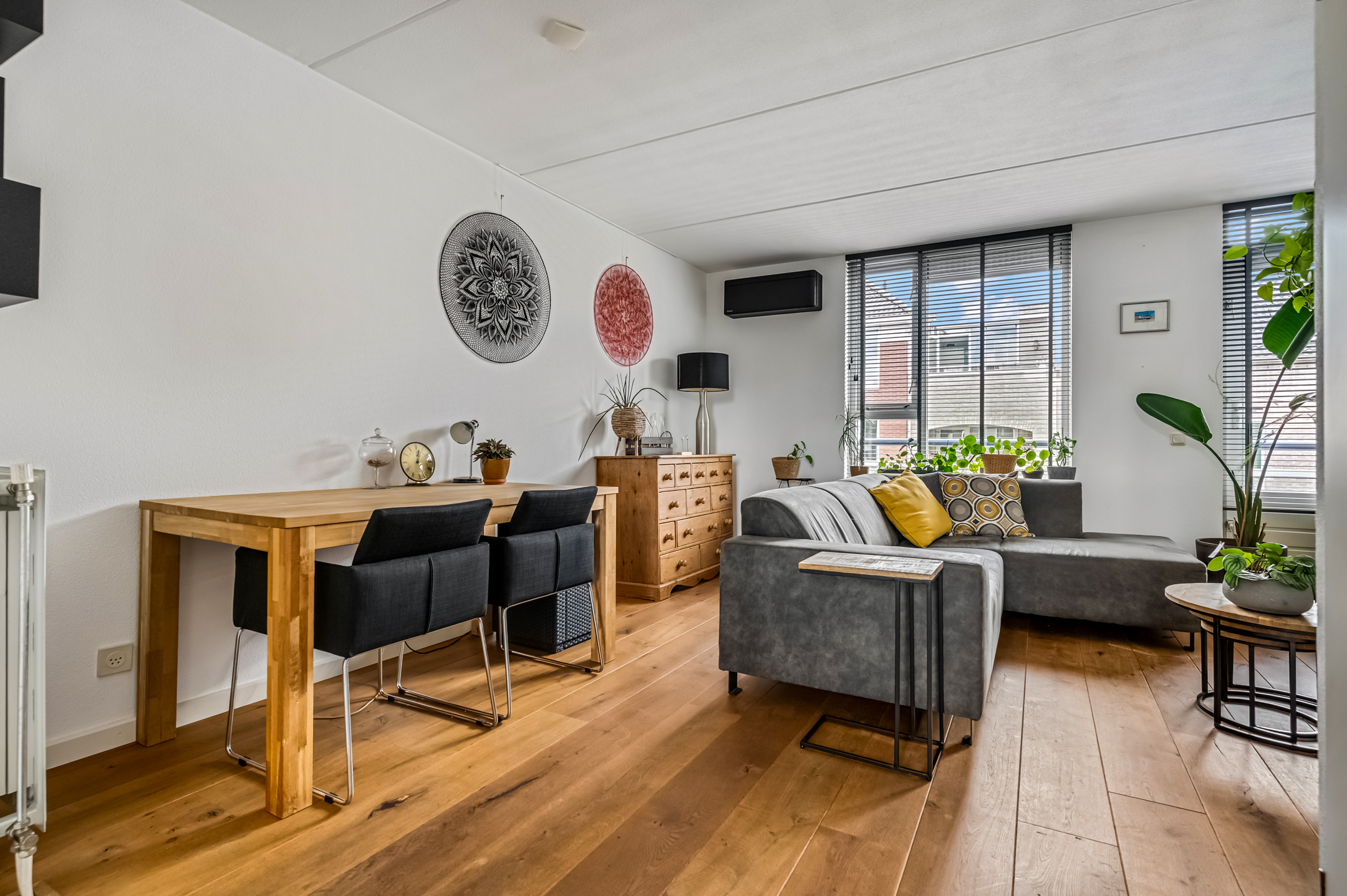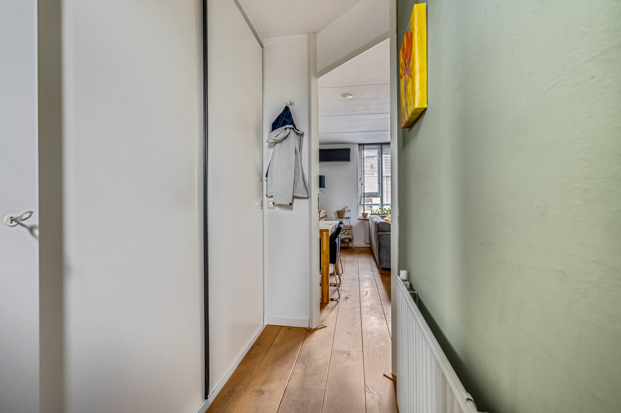 De entree brengt je in de hal met meterkast. De lichte woonkamer heeft airconditioning, is voorzien van grote ramen en biedt toegang tot het balkon aan de straatzijde. Een fijne plek om de dag rustig te starten met een kop koffie. Aan de achterzijde van het appartement bevindt zich de moderne half-open keuken die in 2022 vernieuwd is! Deze is luxe afgewerkt en beschikt over een inductiekookplaat, afzuigkap, oven en koel-/vriescombinatie. Ook is er elektrische vloerverwarming. Vanuit de tussenhal met toilet bereik je de trap naar de bovenverdieping.