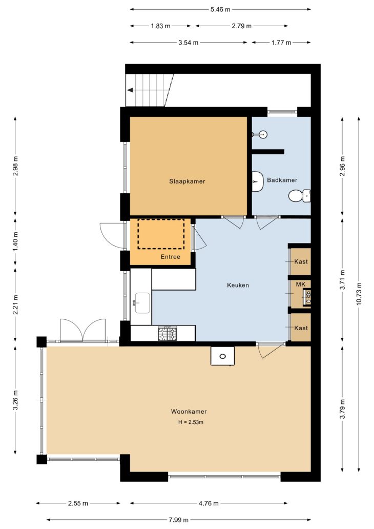 Begane grond: entree/hal met meterkast; badkamer met toilet, doucheruimte; ruime slaapkamer; U-vormige keuken met diverse inbouwapparatuur, w. o. gaskookplaat, oven, vaatwasser en koelkast