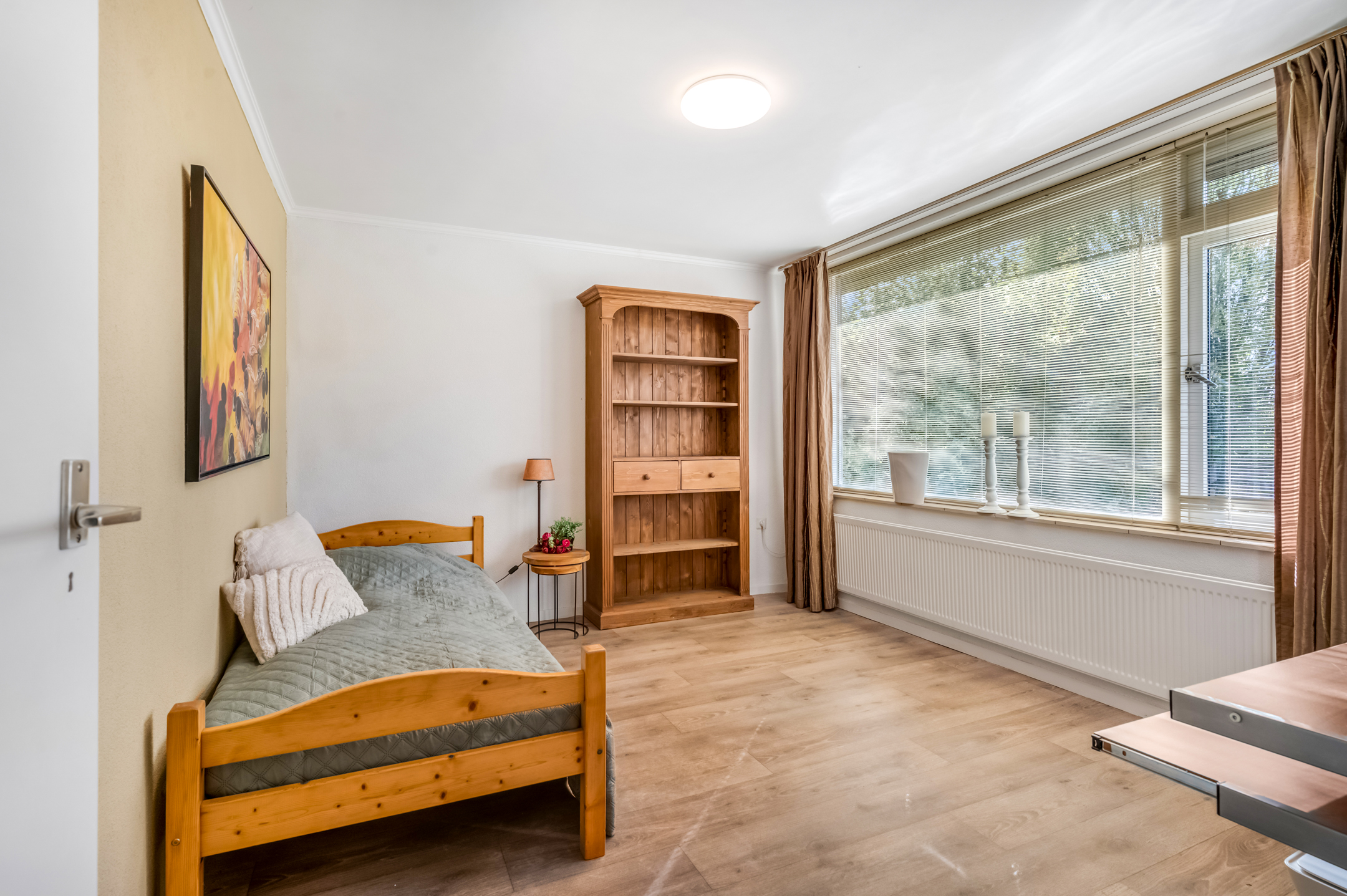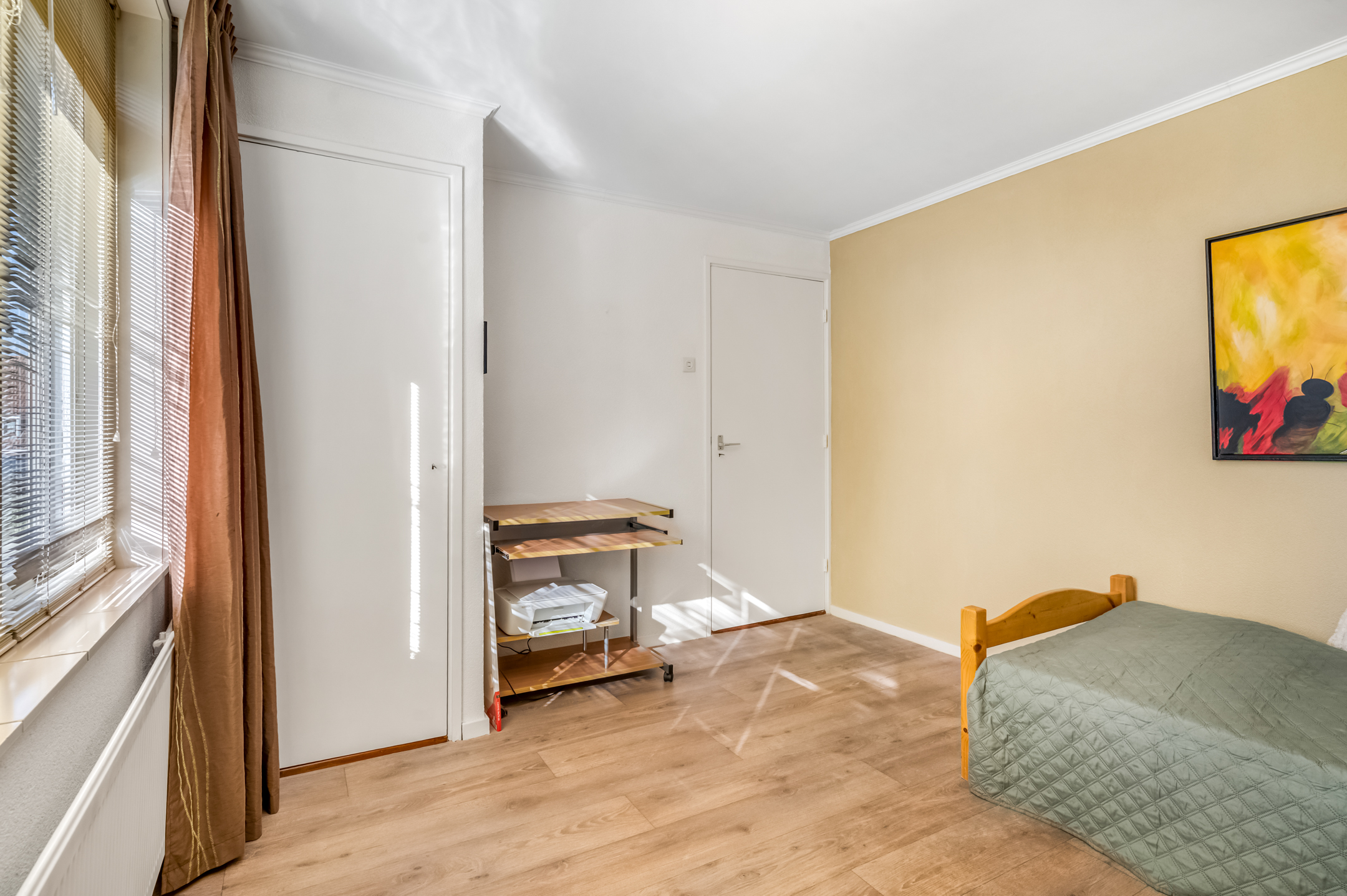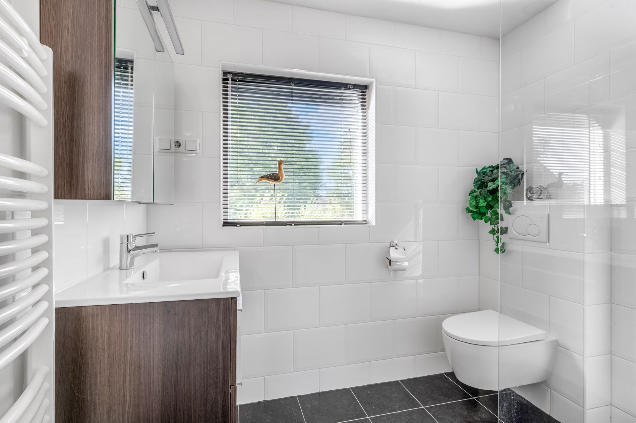 1e verdieping: overloop met toegang tot drie slaapkamers met vaste kasten, waarvan de royale ouderslaapkamer zich aan de achterzijde bevindt. De slaapkamer aan de voorzijde beschikt over een elektrisch bedienbaar rolluik. De badkamer is praktisch ingedeeld en heeft een douchehoek, toilet en een praktisch wastafelmeubel.