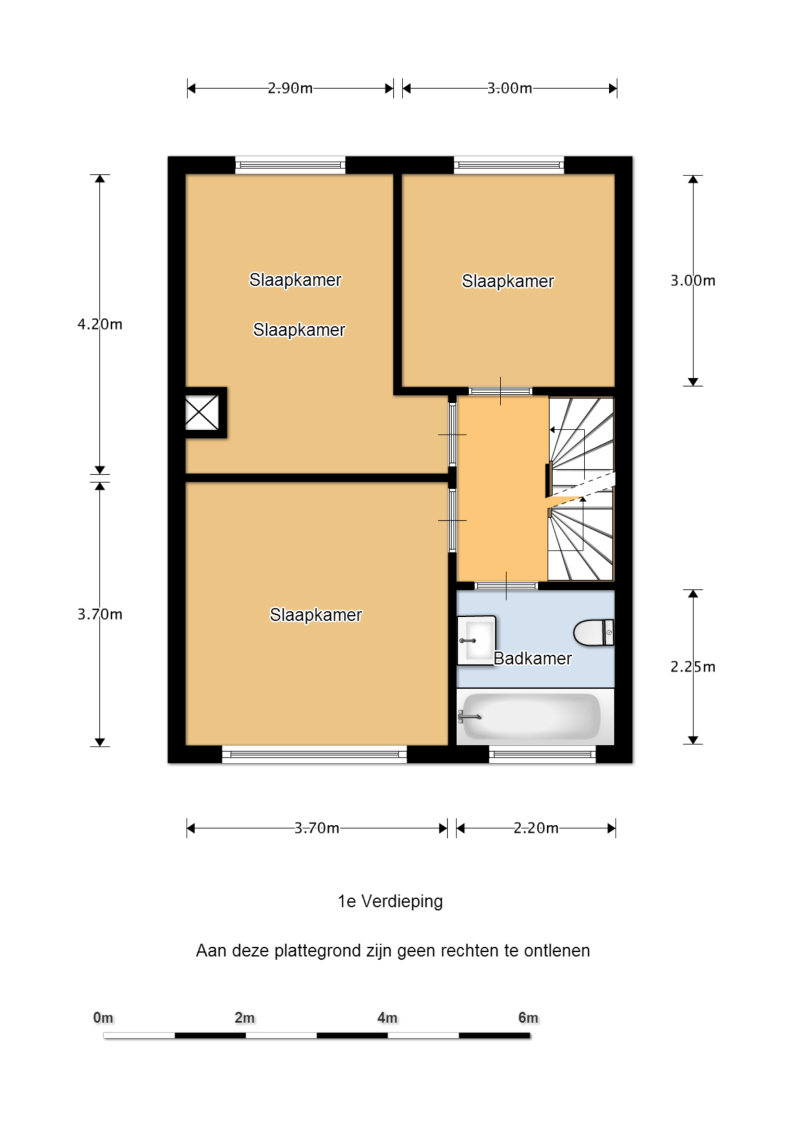 De overloop biedt toegang tot drie ruime slaapkamers, die ieder prettig van formaat zijn. De badkamer is praktisch ingedeeld en uitgerust met een ligbad, wastafel en toilet.
