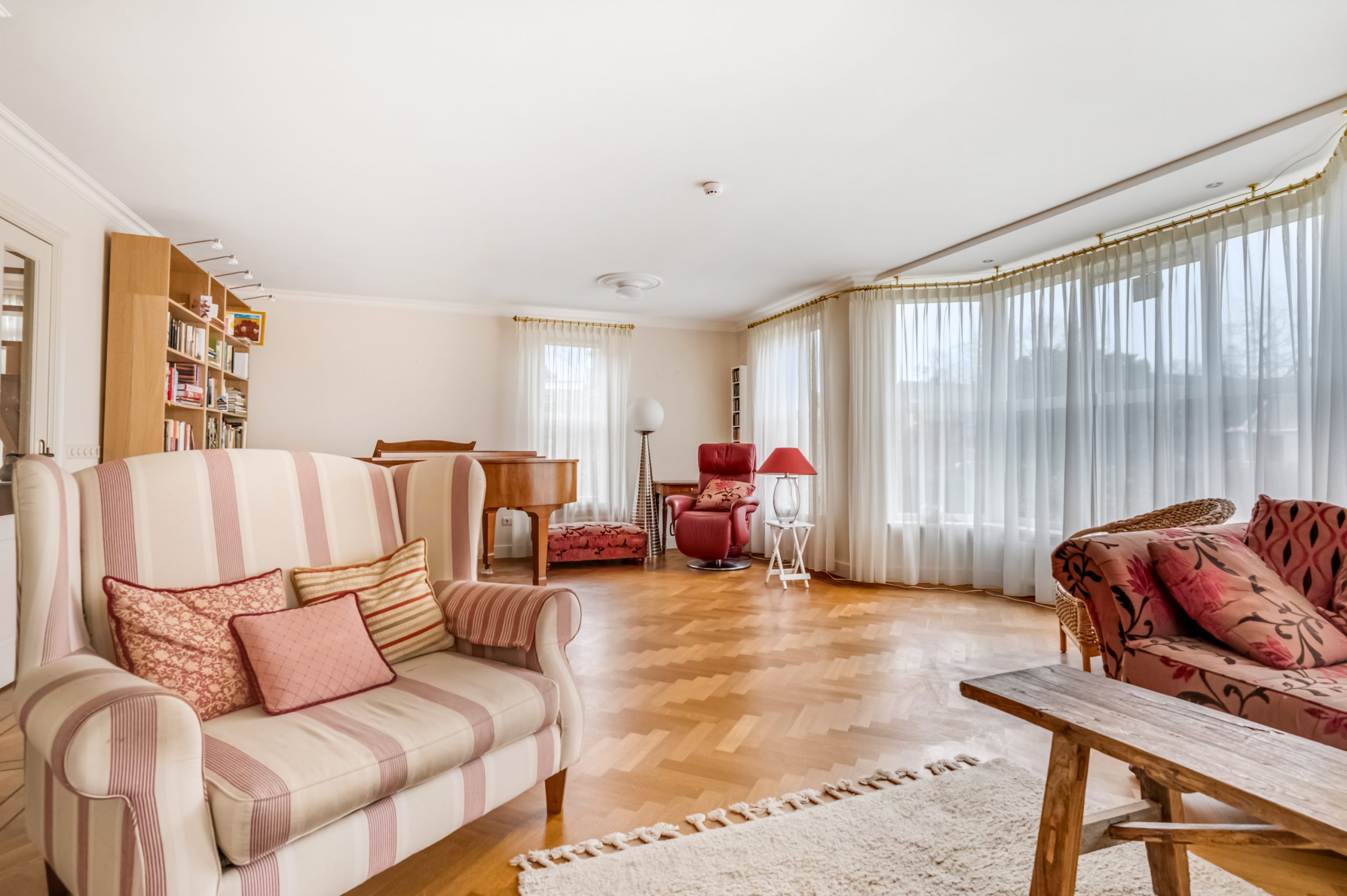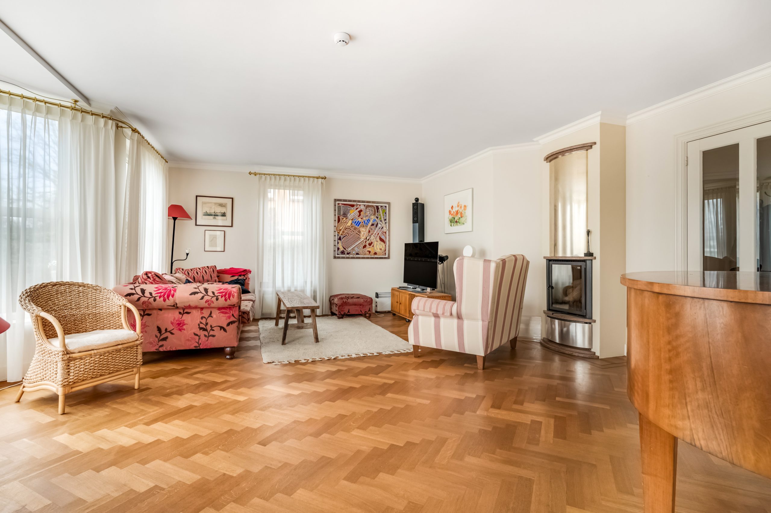 De woonkamer van ca. 40 m² is heerlijk licht dankzij de erker en straalt warmte uit door de massief houten parketvloer en de design openhaard. Een fijne plek om samen te komen of juist in alle rust te ontspannen.