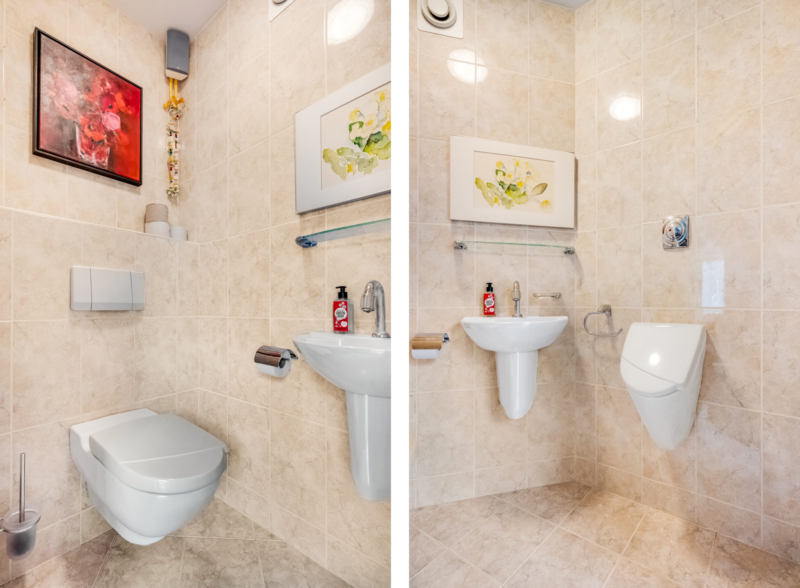 Via de ruime hal met uitgebreide meterkast en een toilet (voorzien van wandcloset en urinoir) betreedt u de woning.