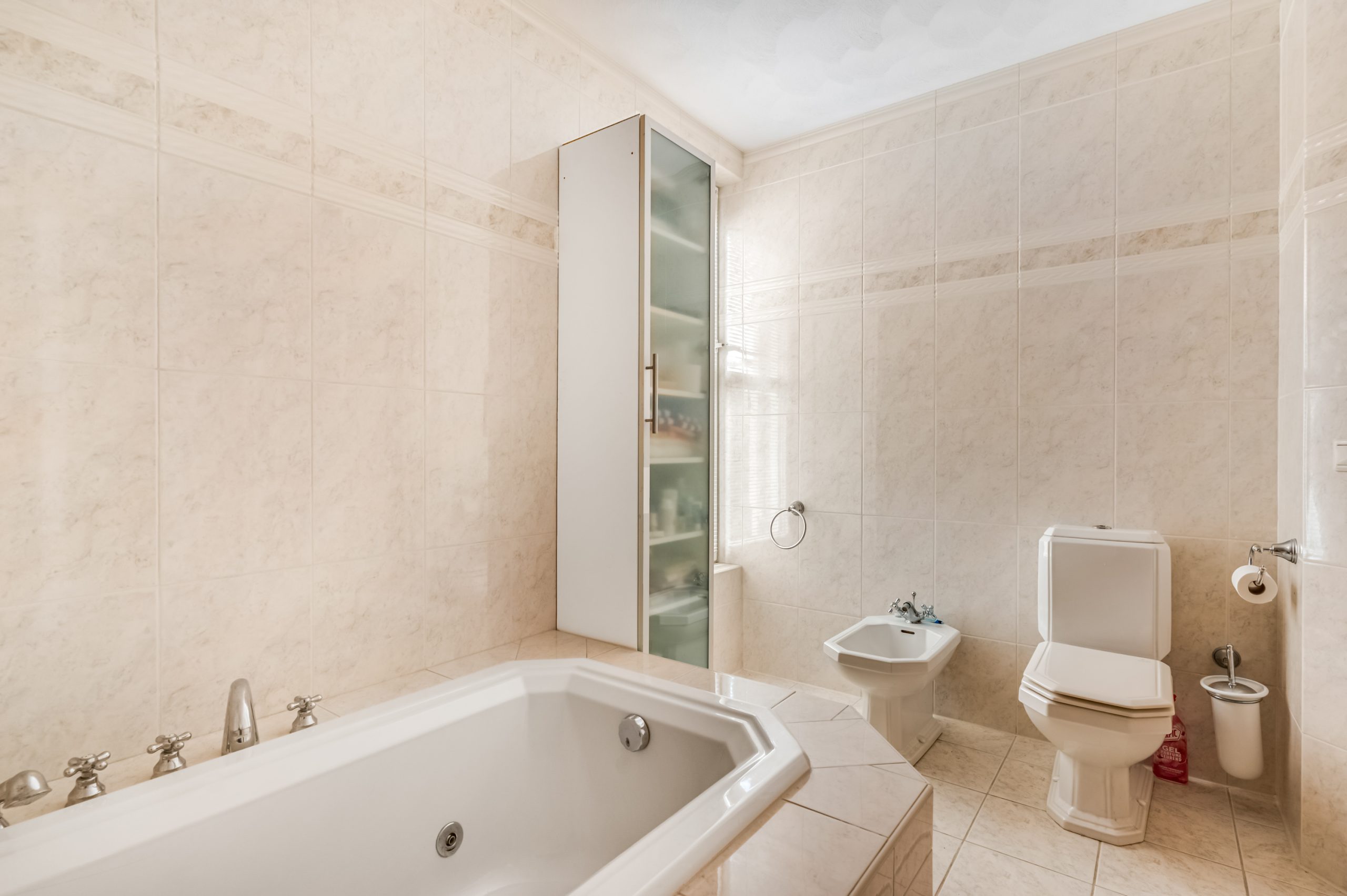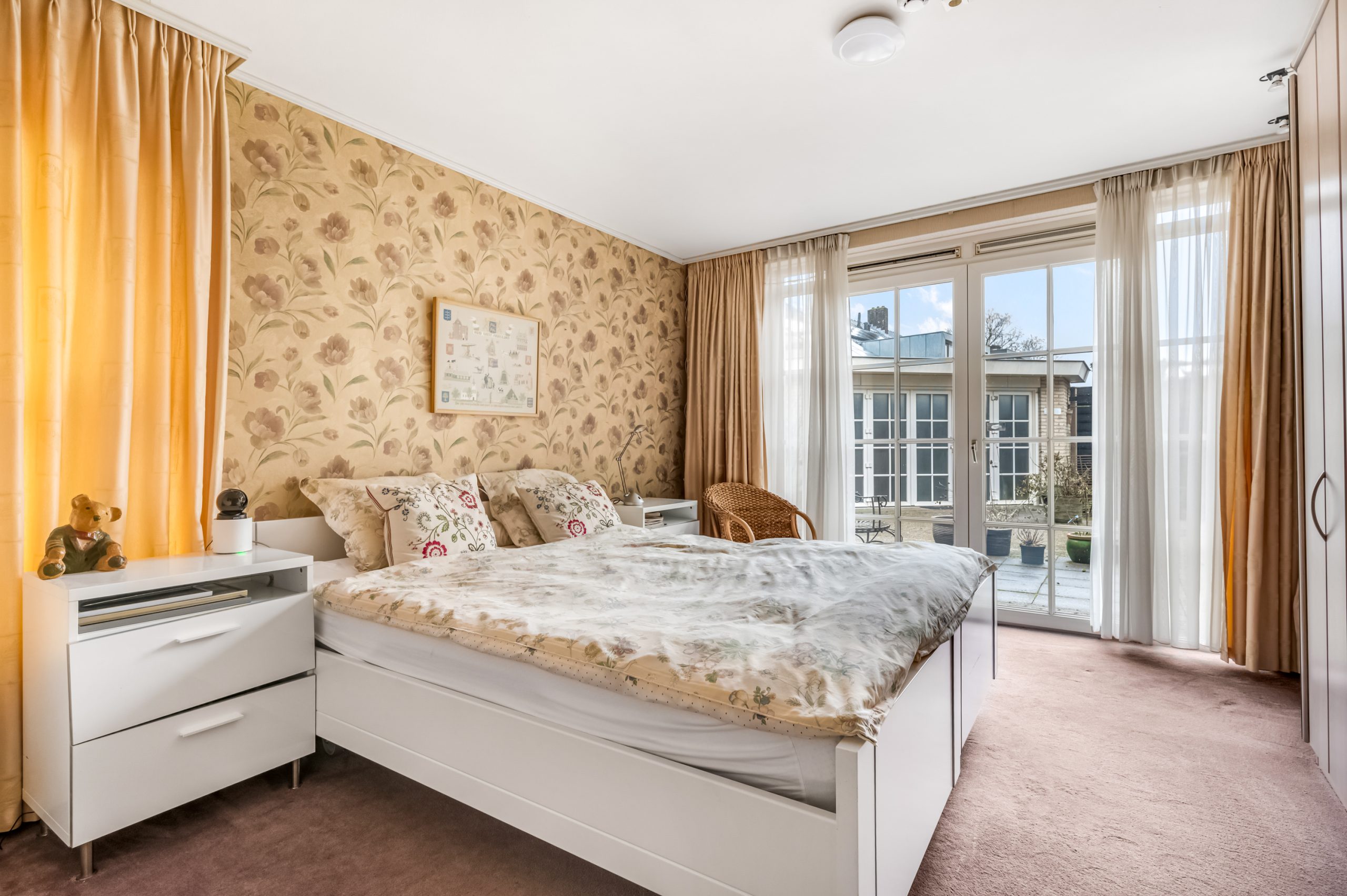 De royale slaapkamer van ca. 20 m² beschikt over openslaande deuren naar het terras en de achtertuin. Een heerlijke plek om ’s ochtends de dag te beginnen. Direct aangrenzend bevindt zich de badkamer met douchecabine, whirlpoolbad, wastafel, wandtoilet en bidet. Comfortabel, compleet en levensloopbestendig.