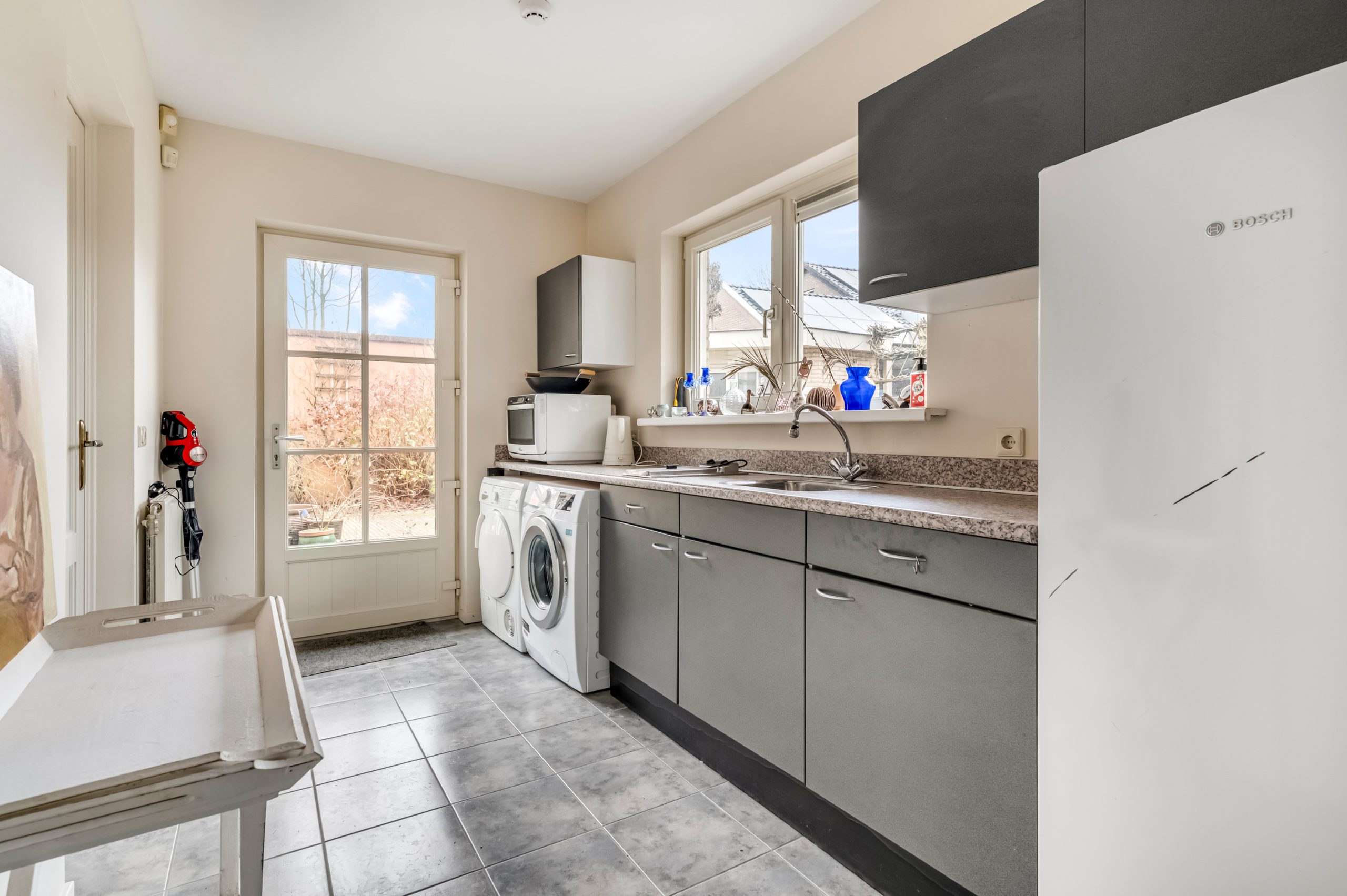 Aansluitend vindt u de praktische bijkeuken met aanrechtblok, spoelbak, ingebouwde friteuse en wasmachine-/drogeraansluiting. Vanuit hier bereikt u zowel de aangebouwde garage als de achtertuin.