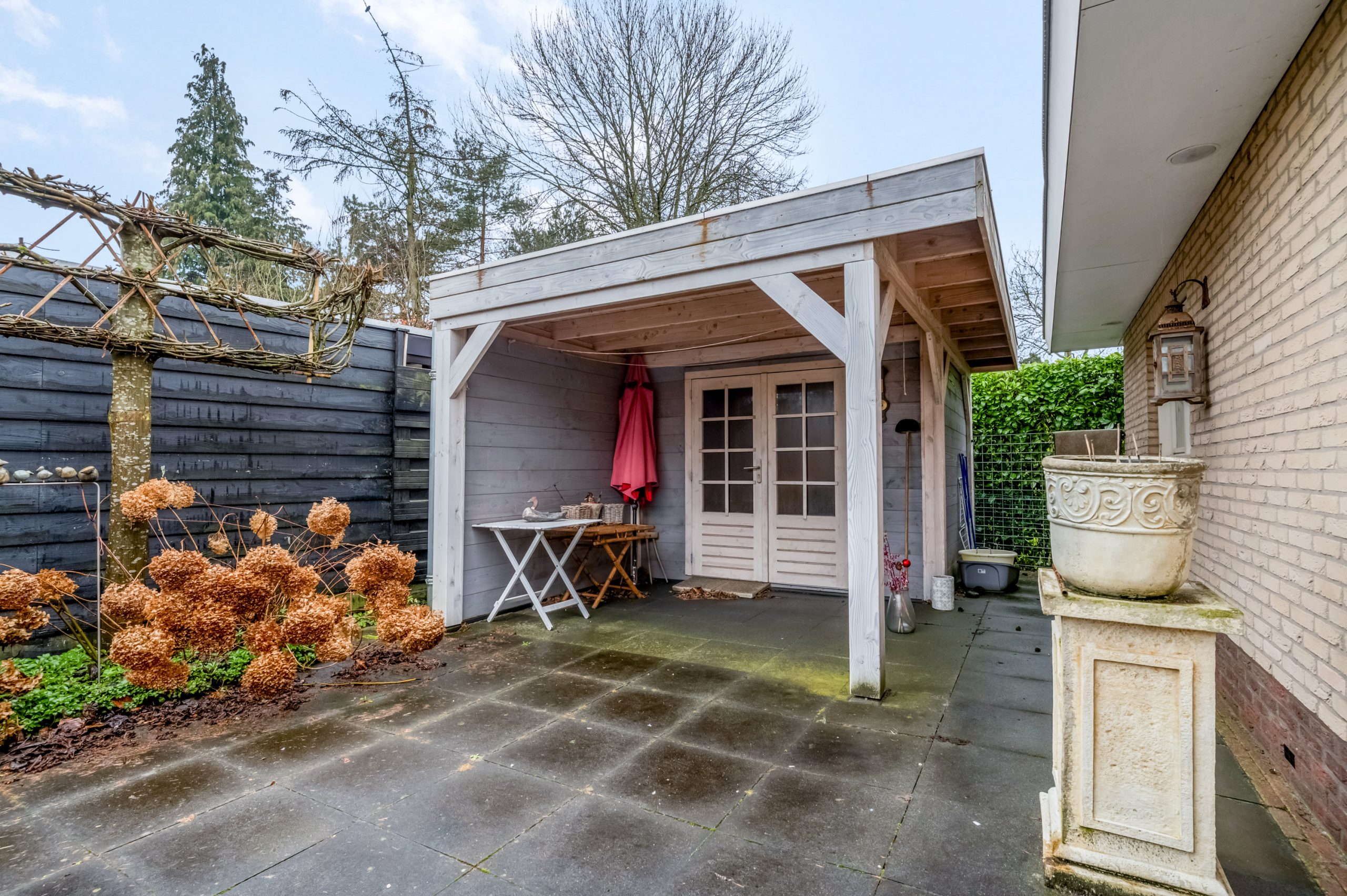 Daarnaast is er een houten berging met overkapping aanwezig, ideaal voor opslag of een gezellige loungeplek.