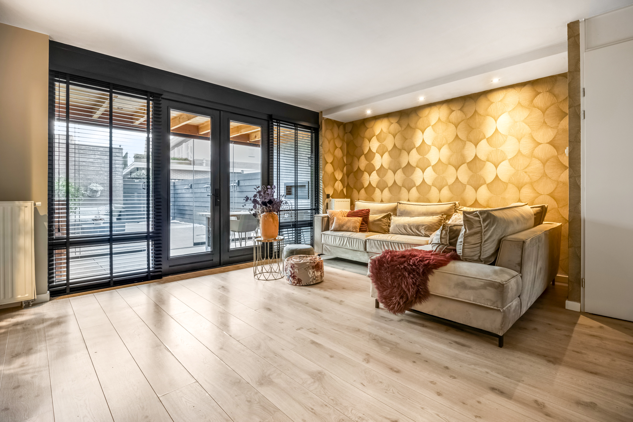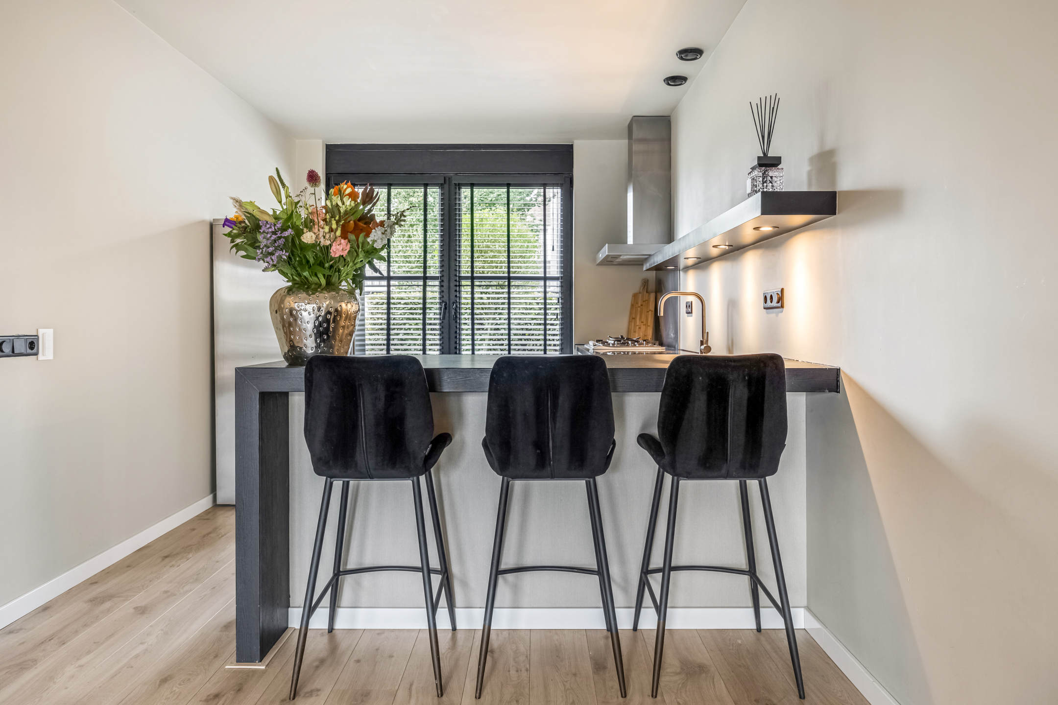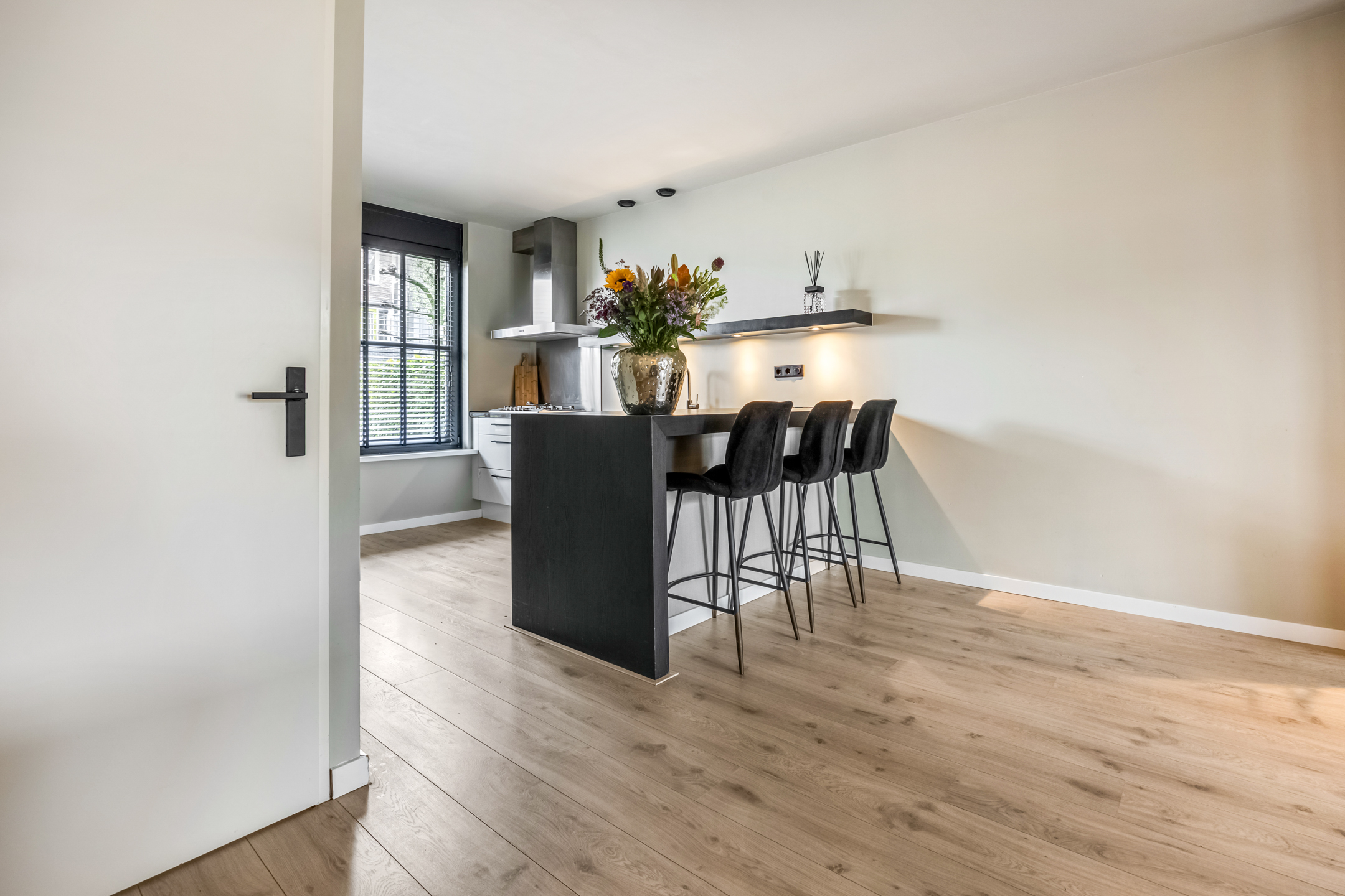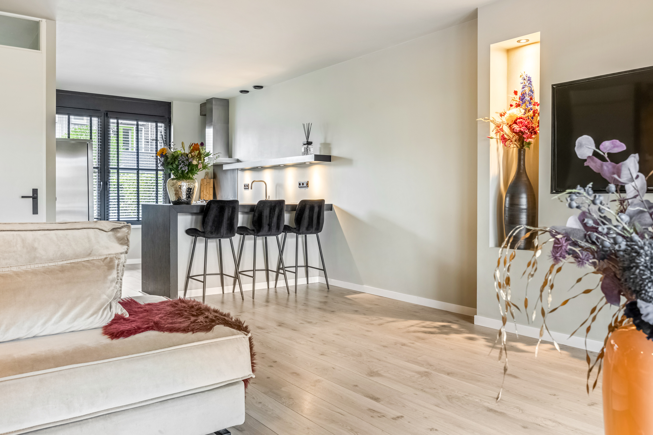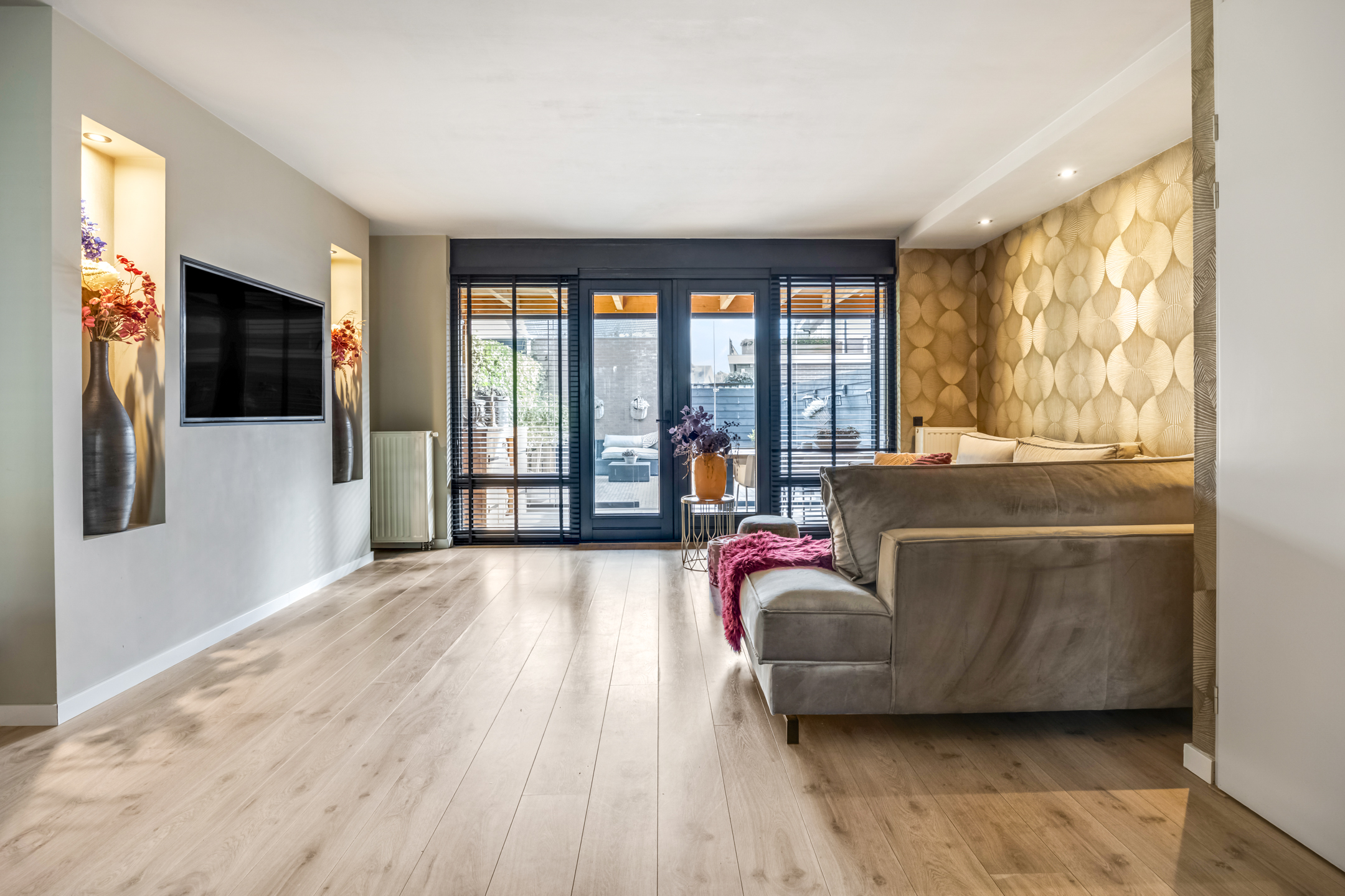 Via de voorzijde kom je binnen in een verzorgde hal met modern toilet en trapopgang. De ruime woonkamer is stijlvol ingericht, met warme houten vloeren, strakke wanden en een sfeervolle accentmuur. Grote raampartijen vullen de ruimte met natuurlijk licht en via openslaande deuren betrek je de serre in je woonbeleving.