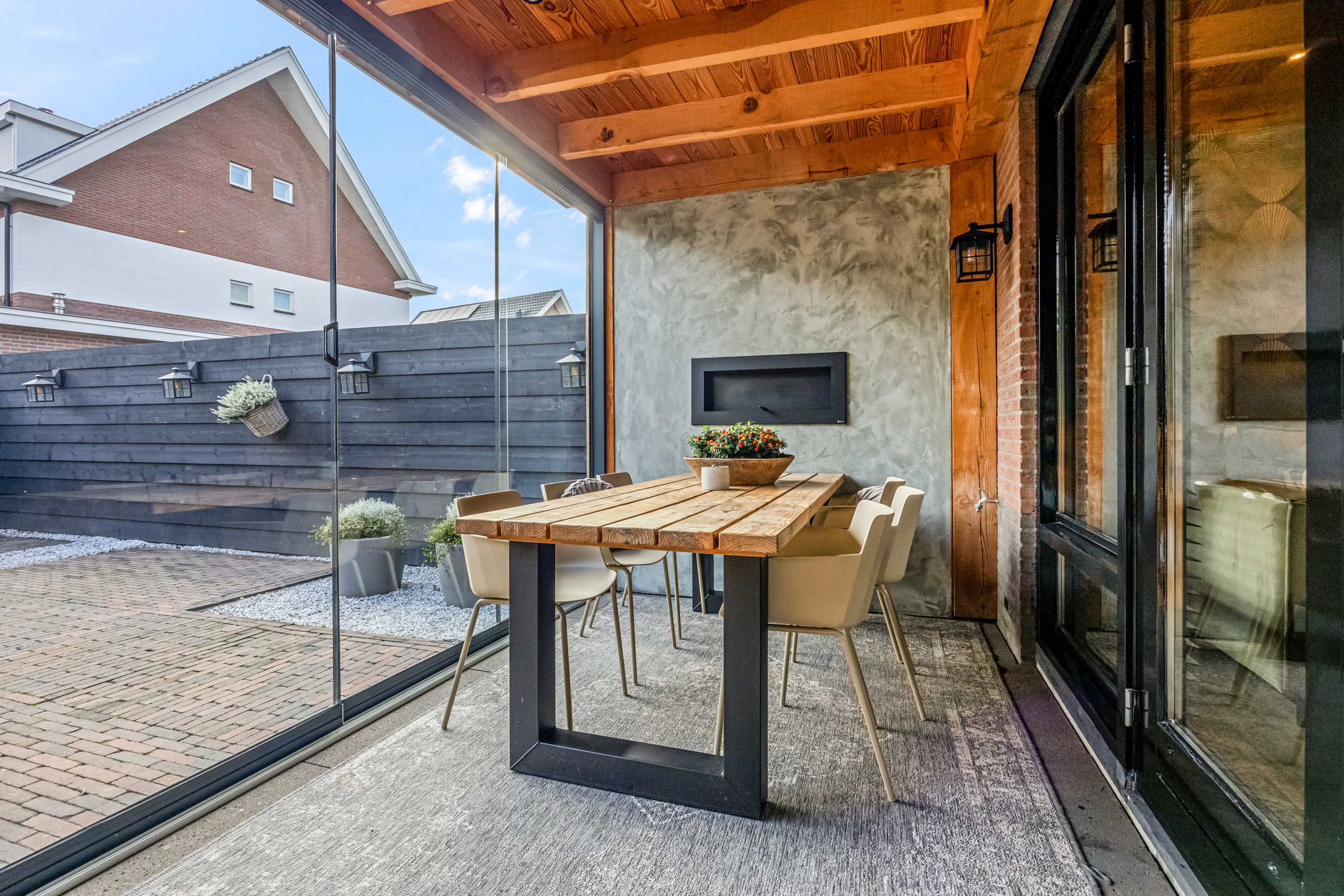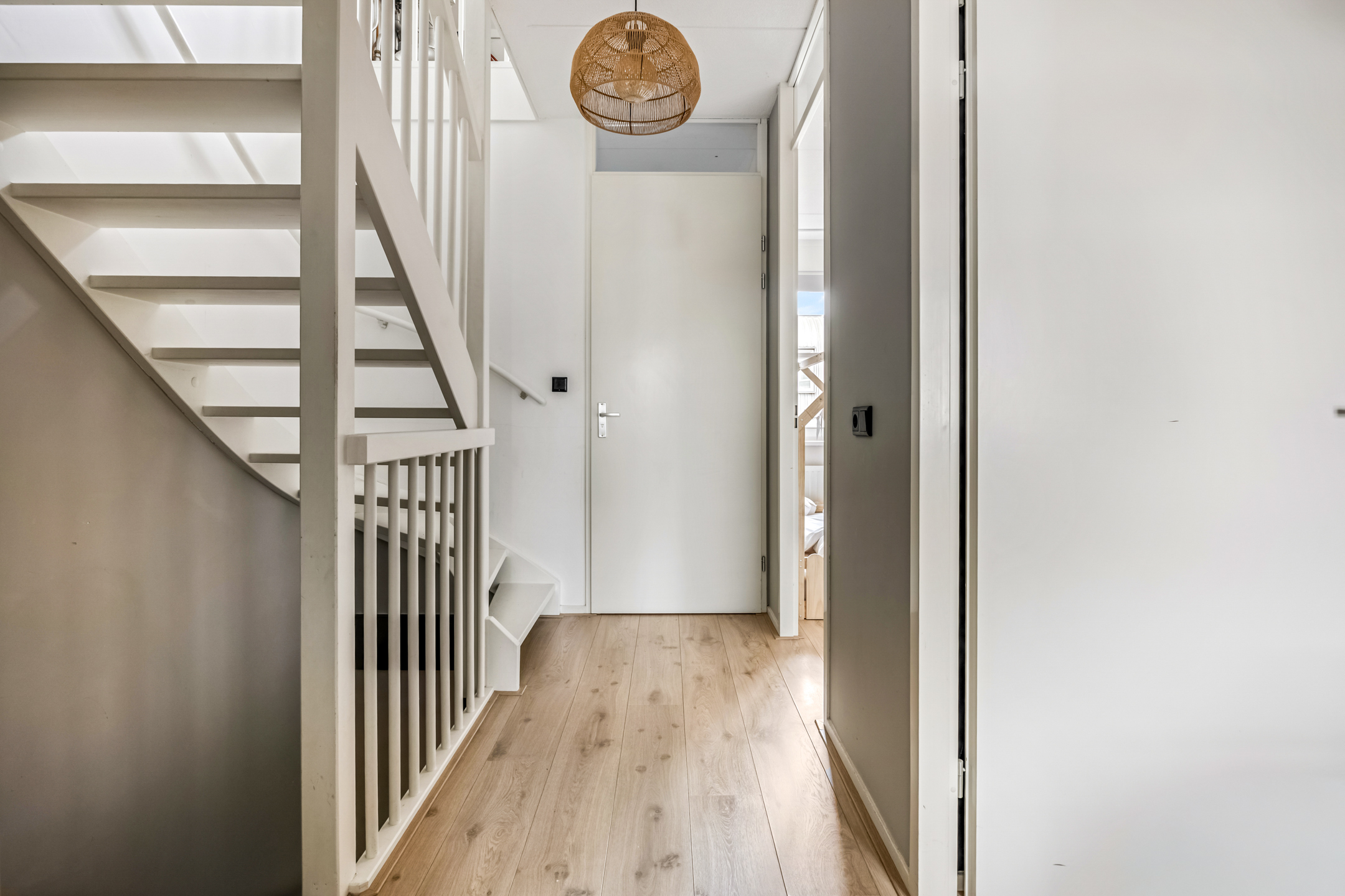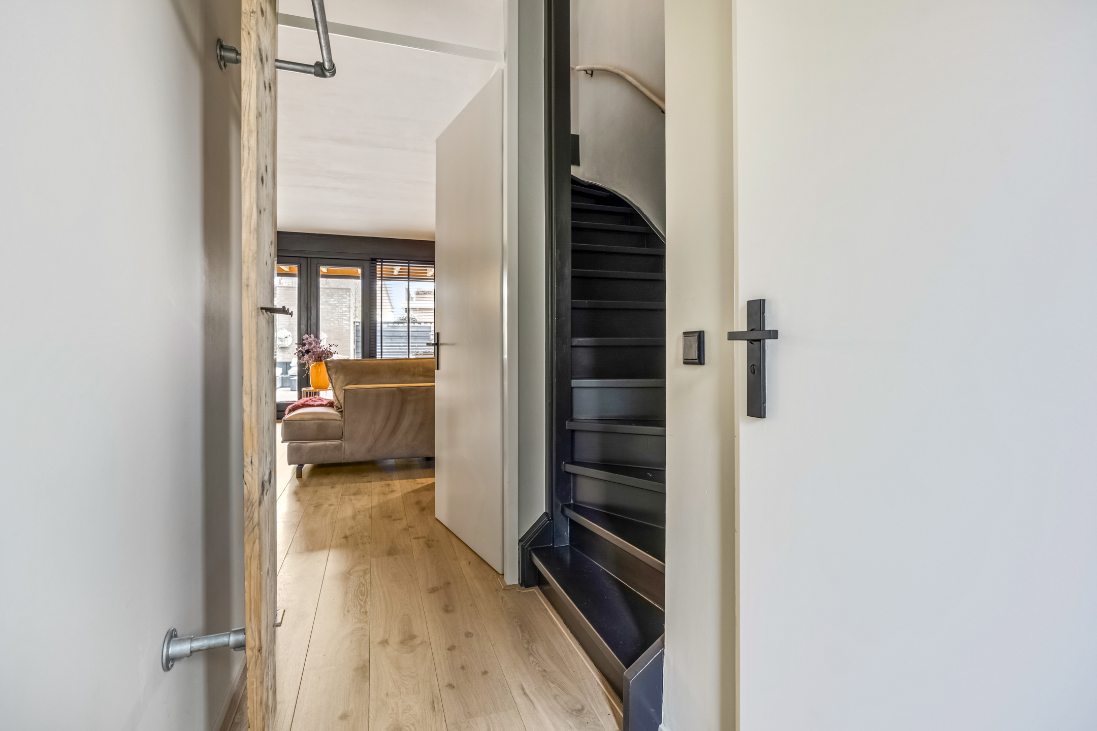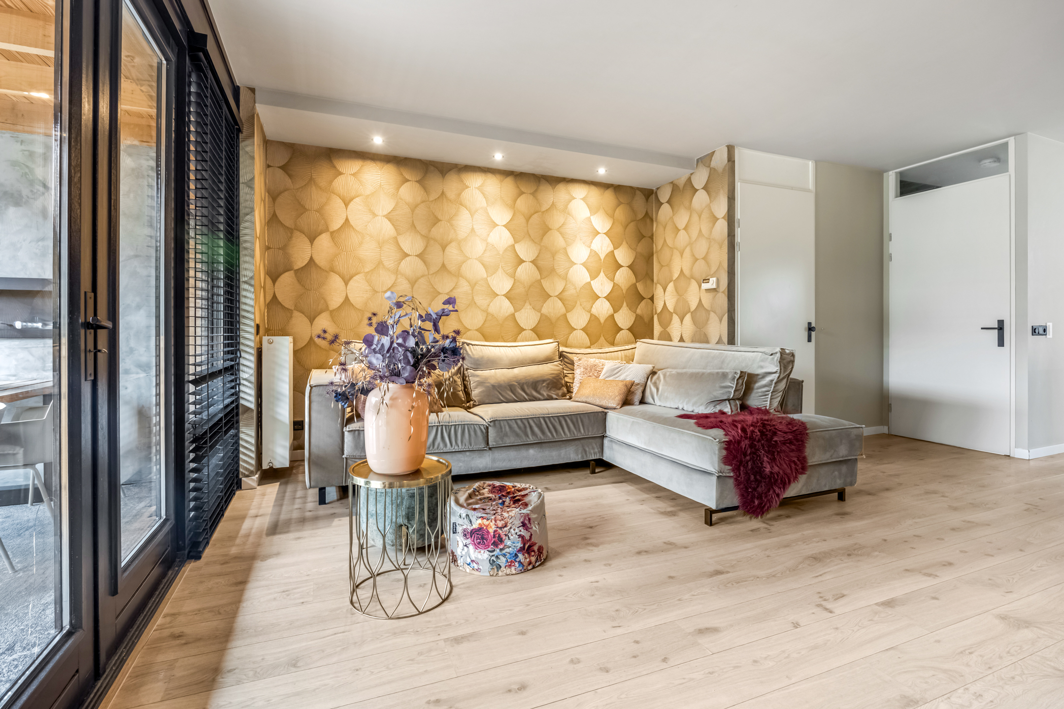 Via de voorzijde kom je binnen in een verzorgde hal met modern toilet en trapopgang. De ruime woonkamer is stijlvol ingericht, met warme houten vloeren, strakke wanden en een sfeervolle accentmuur. Grote raampartijen vullen de ruimte met natuurlijk licht en via openslaande deuren betrek je de serre in je woonbeleving.