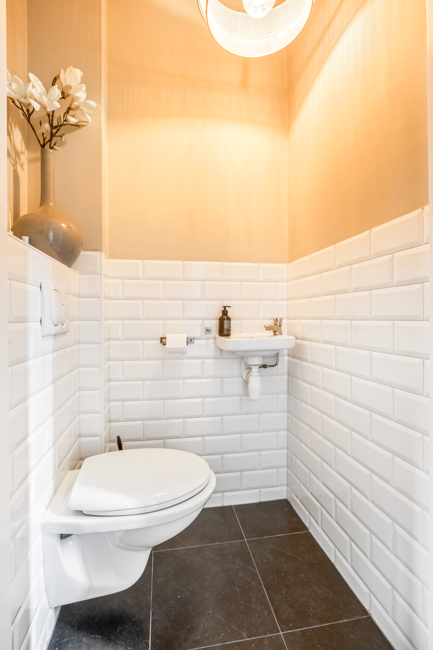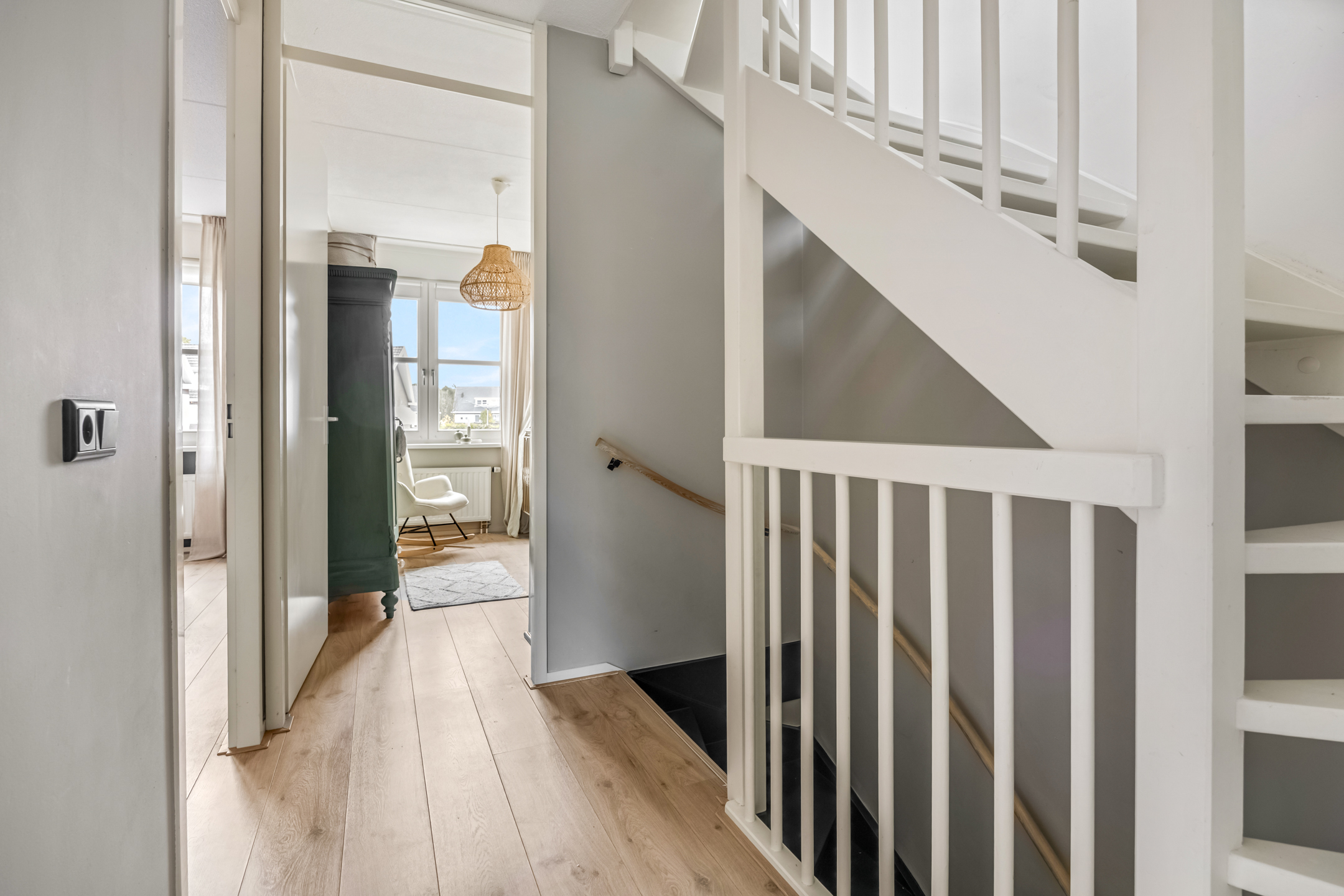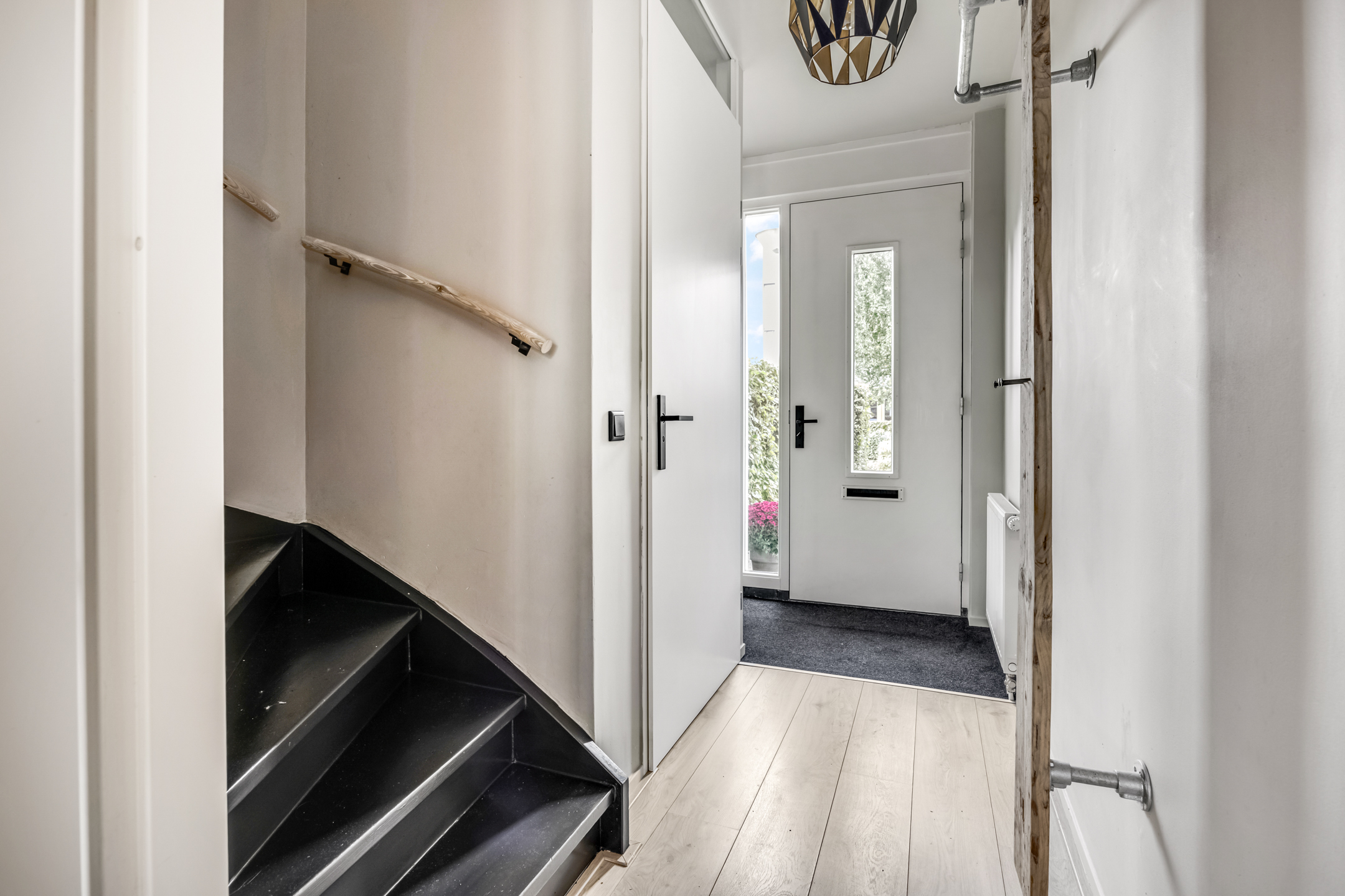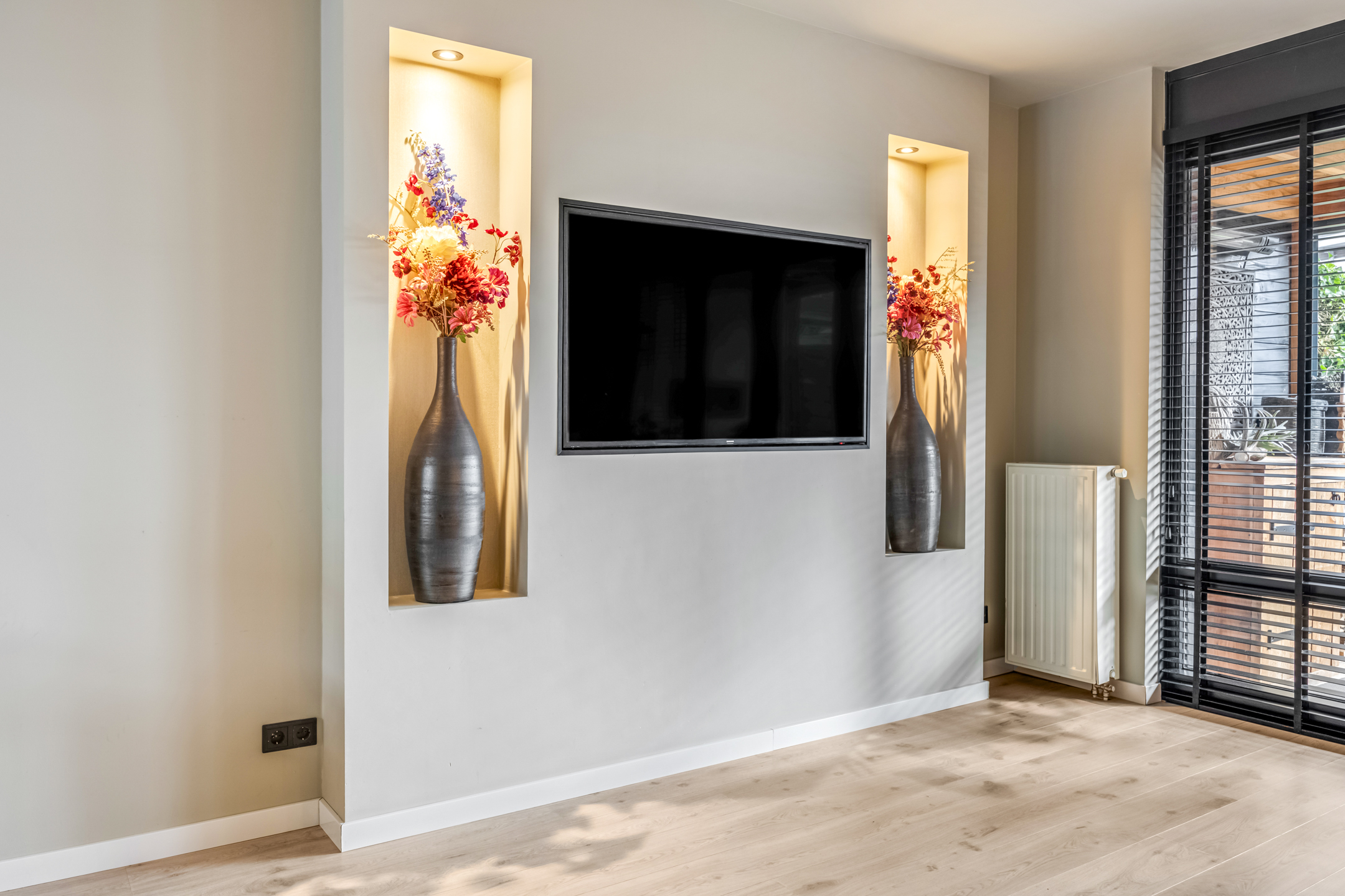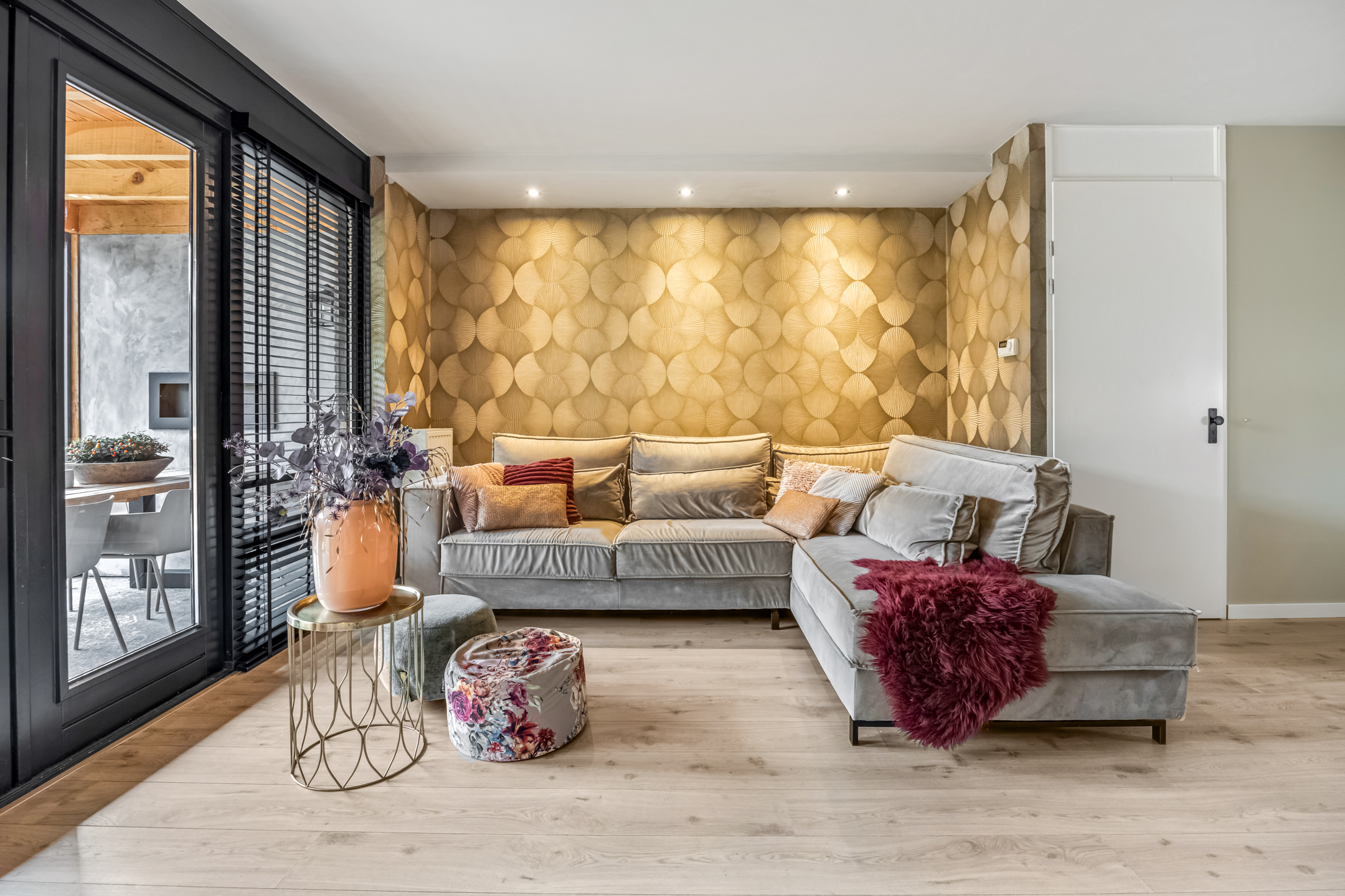 Via de voorzijde kom je binnen in een verzorgde hal met modern toilet en trapopgang. De ruime woonkamer is stijlvol ingericht, met warme houten vloeren, strakke wanden en een sfeervolle accentmuur. Grote raampartijen vullen de ruimte met natuurlijk licht en via openslaande deuren betrek je de serre in je woonbeleving.