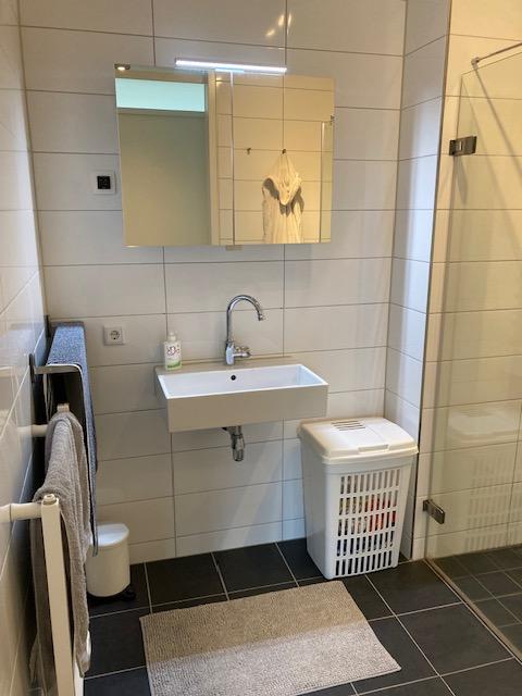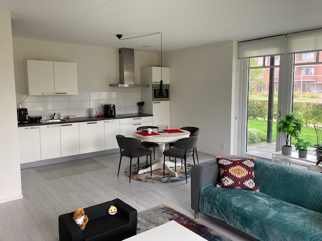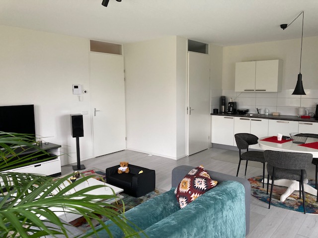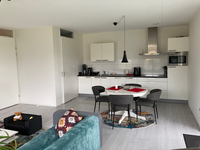 Indeling appartement: entree, hal met meterkast, bergruimte met CV- en MV opstelling en wasmachine aansluiting, hangend toilet met fonteintje, 2 slaapkamers, badkamer voorzien van wastafel en douchehoek, ruime woonkamer met deur naar terras en een luxe complete open keuken met afzuigkap, inductiekookplaat, koelkast, combi-oven en vaatwasmachine.