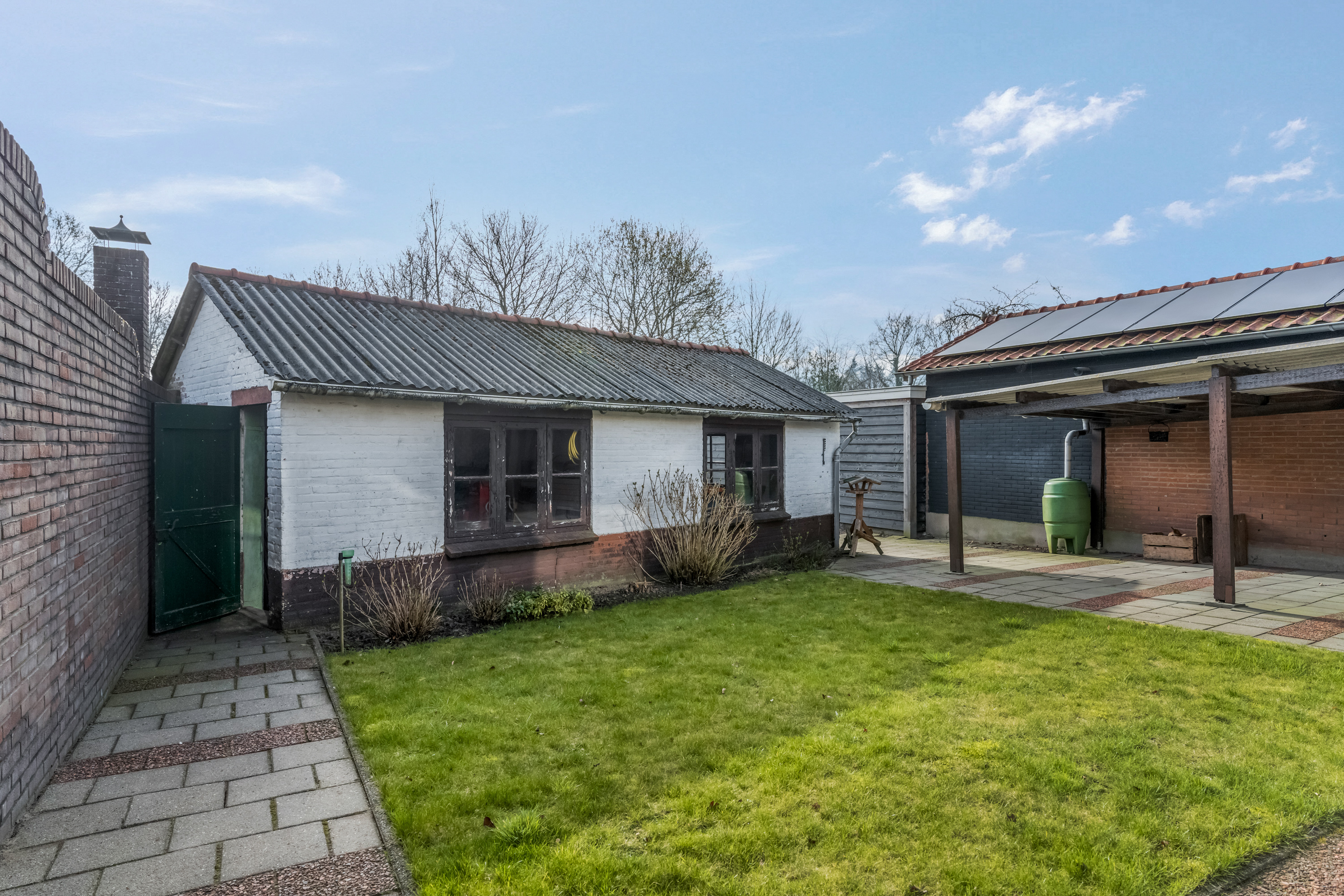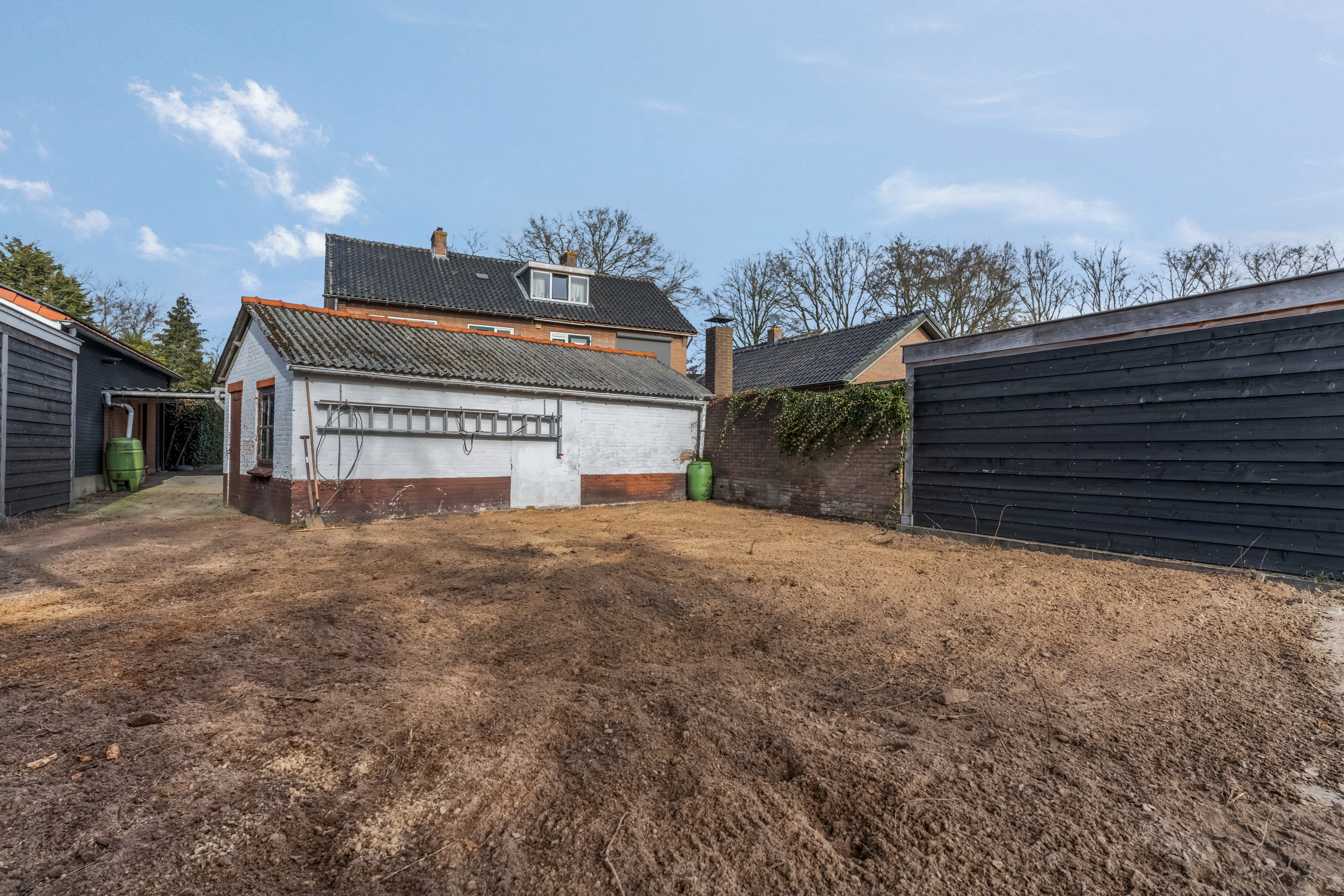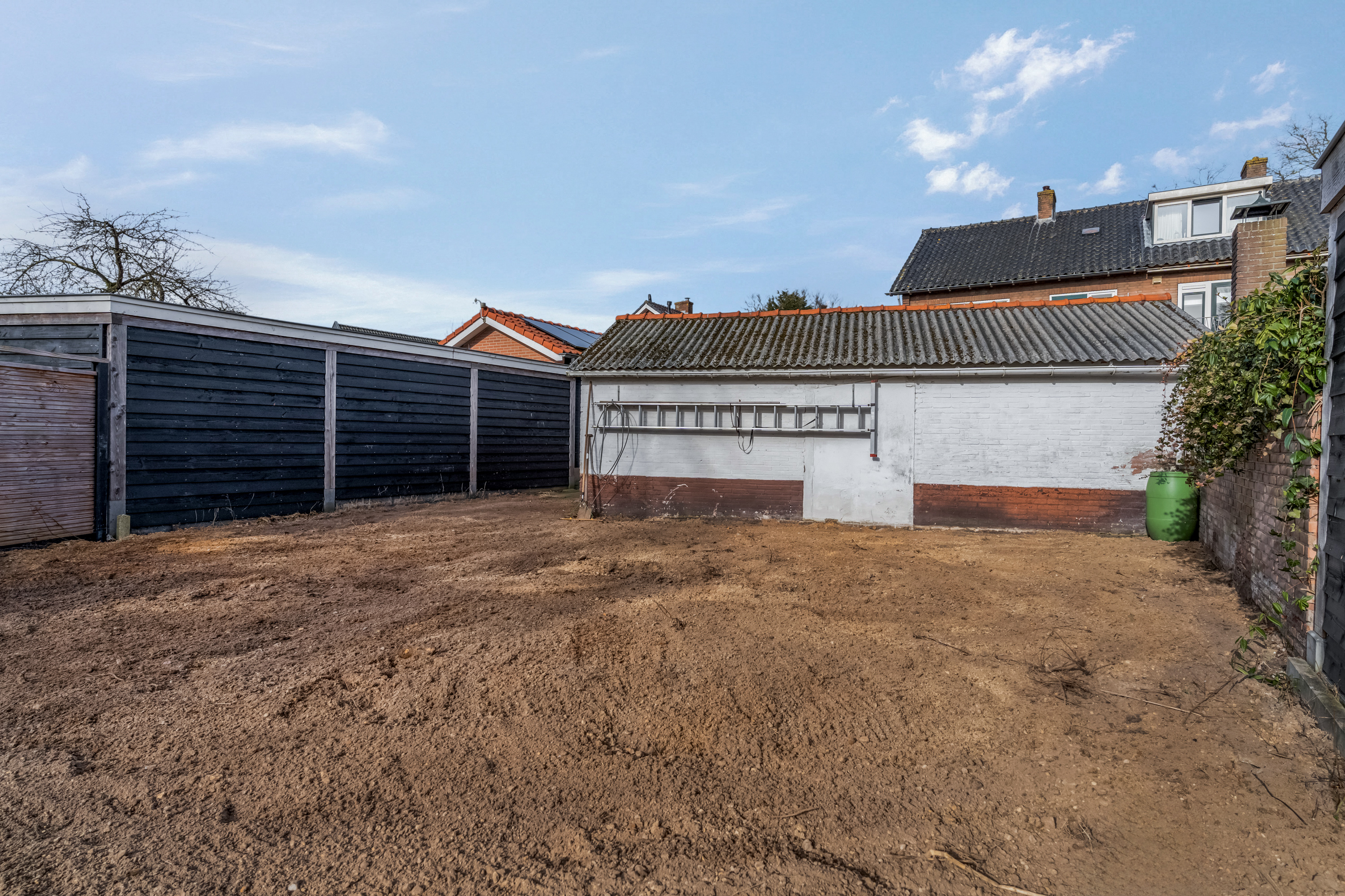 Het perceel is niet in één oogopslag volledig te overzien, doordat er een dubbele berging in de achtertuin staat. Daarachter bevindt zich nog een moestuin. Ook voor mensen met groene vingers zijn er dus volop mogelijkheden.