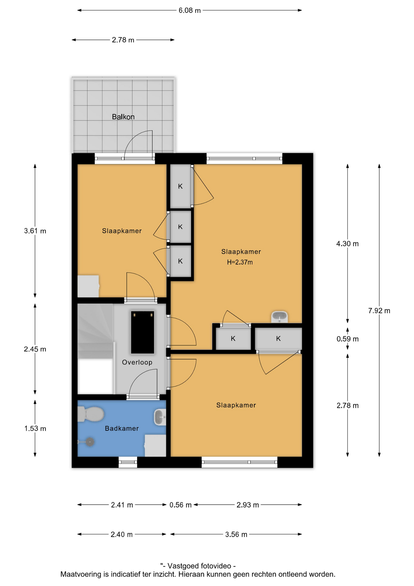 Overloop, drie slaapkamers met inbouwkasten (waarvan één met toegang tot het balkon) en een badkamer met wastafel, douche, toilet en wasmachineaansluiting.