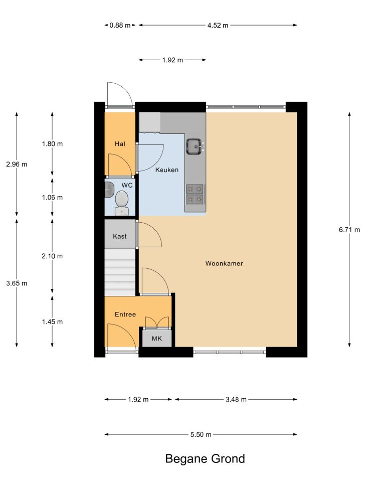 Entree, meterkast, trapopgang met trapkast, woonkamer, open keuken met inbouwapparatuur, hal, toilet met fontein.
